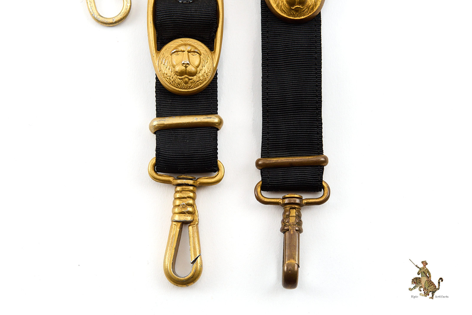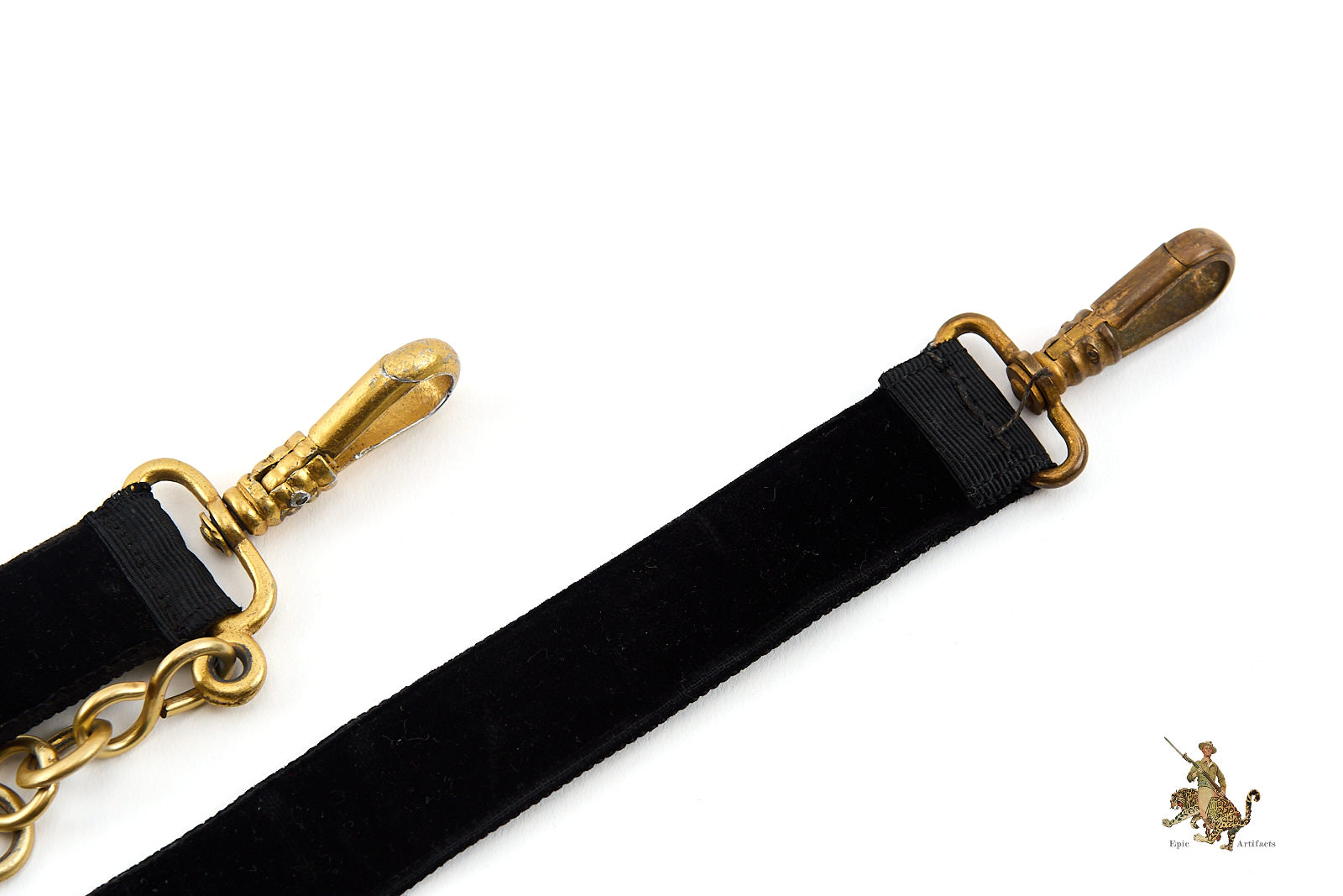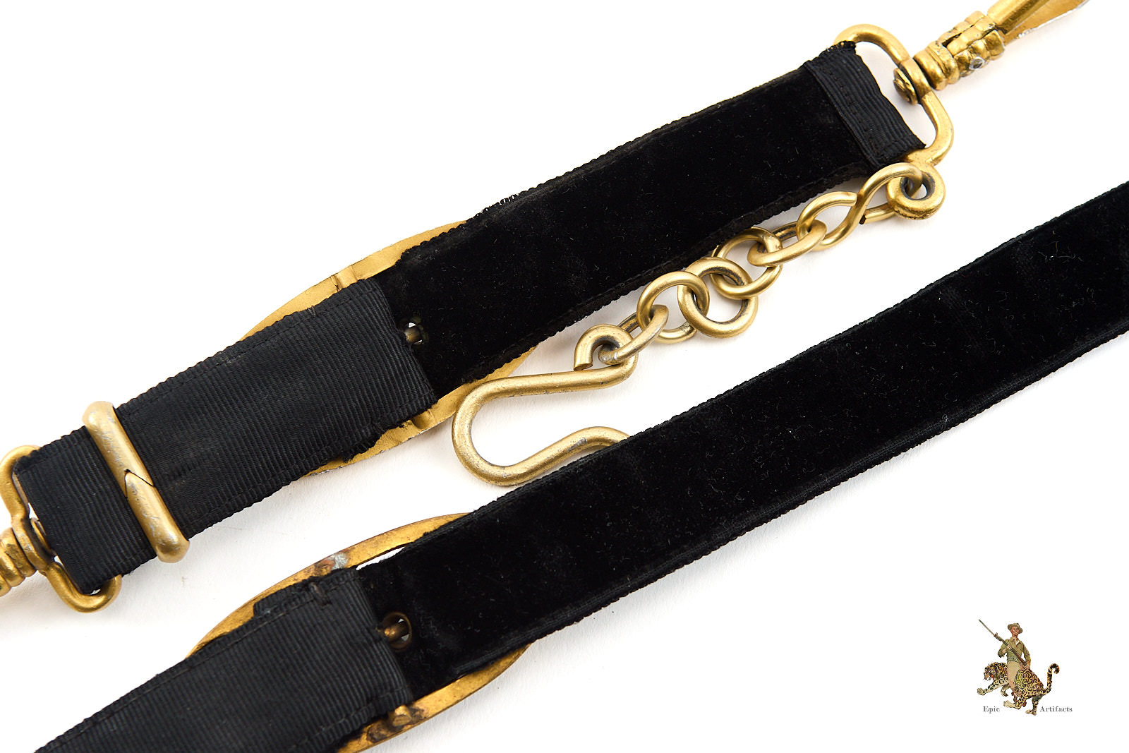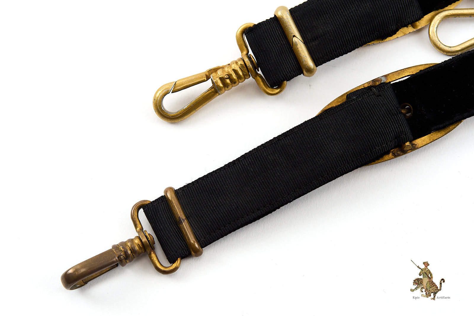 Product Description: An exceptionally well-preserved and fully matching set of Kriegsmarine Dagger Hangers, presented in excellent overall condition. The ribbed rayon straps and deep Kriegsmarine blue velvet backing exhibit remarkable vibrancy and are free from any damage or staining, underscoring the set’s superior preservation. The fittings display only minor, age-appropriate gilding loss, with the matched buckles retaining nearly full original gold finish and lustrous surface.