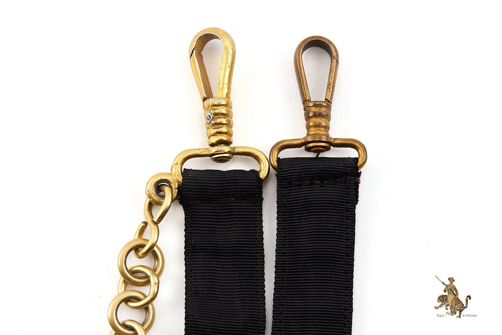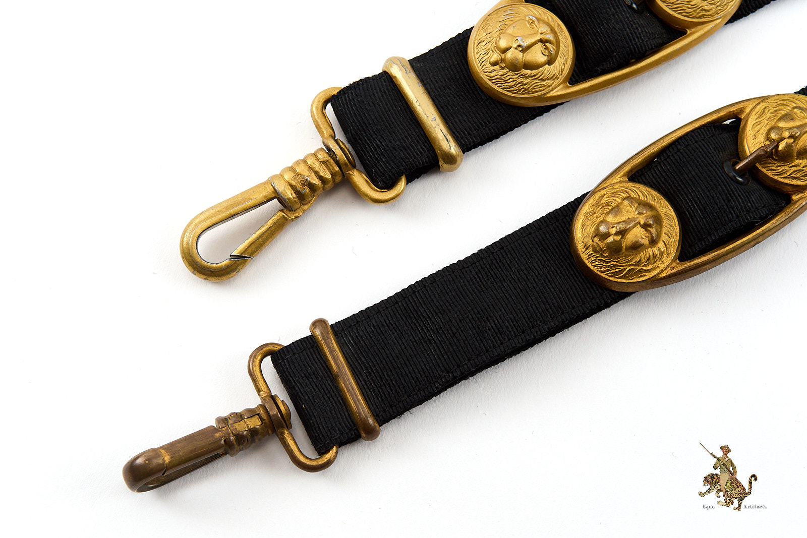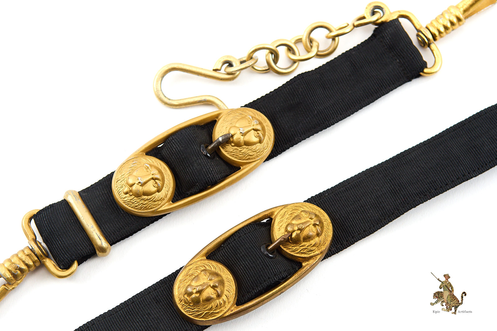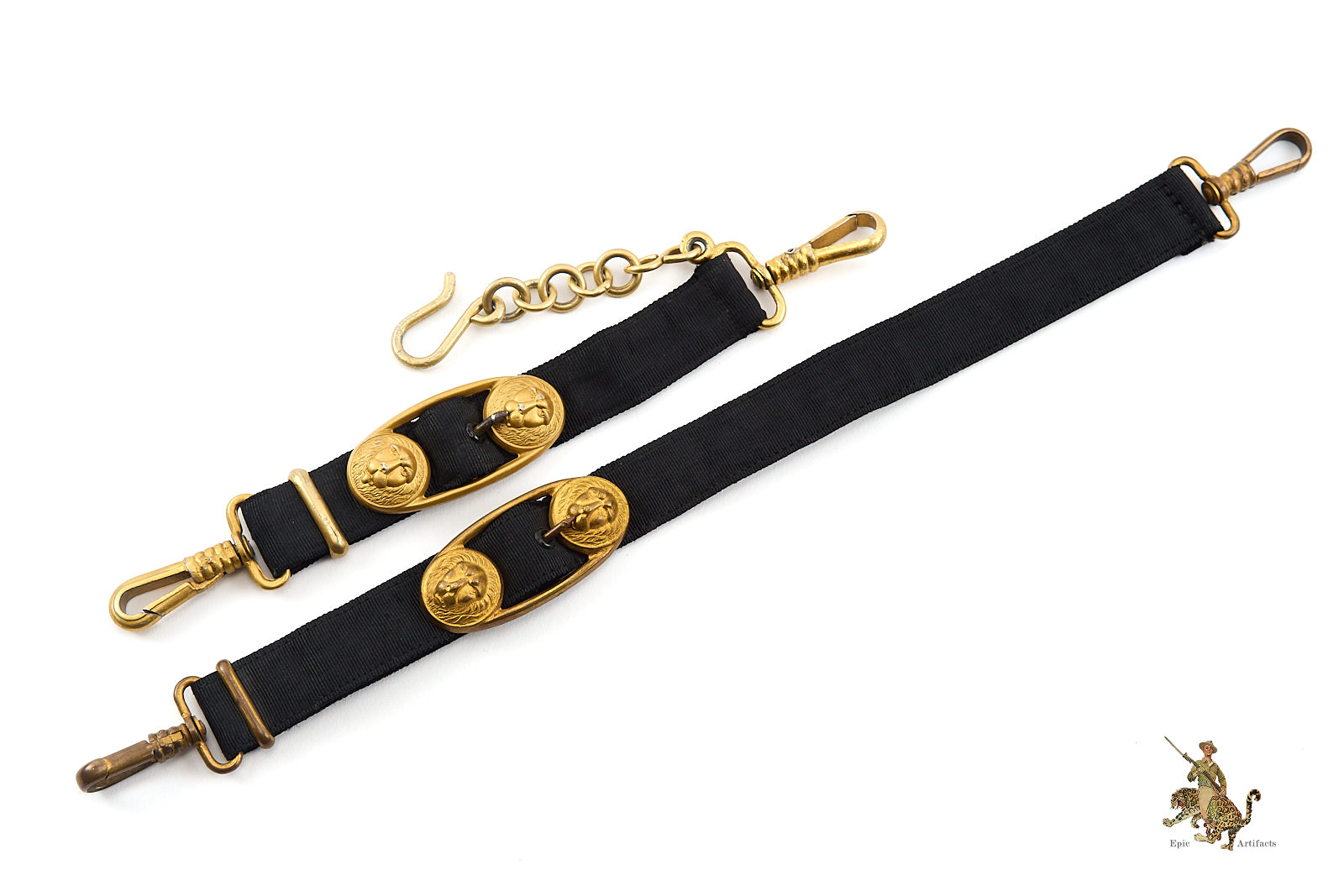 Product Description: An exceptionally well-preserved and fully matching set of Kriegsmarine Dagger Hangers, presented in excellent overall condition. The ribbed rayon straps and deep Kriegsmarine blue velvet backing exhibit remarkable vibrancy and are free from any damage or staining, underscoring the set’s superior preservation. The fittings display only minor, age-appropriate gilding loss, with the matched buckles retaining nearly full original gold finish and lustrous surface.