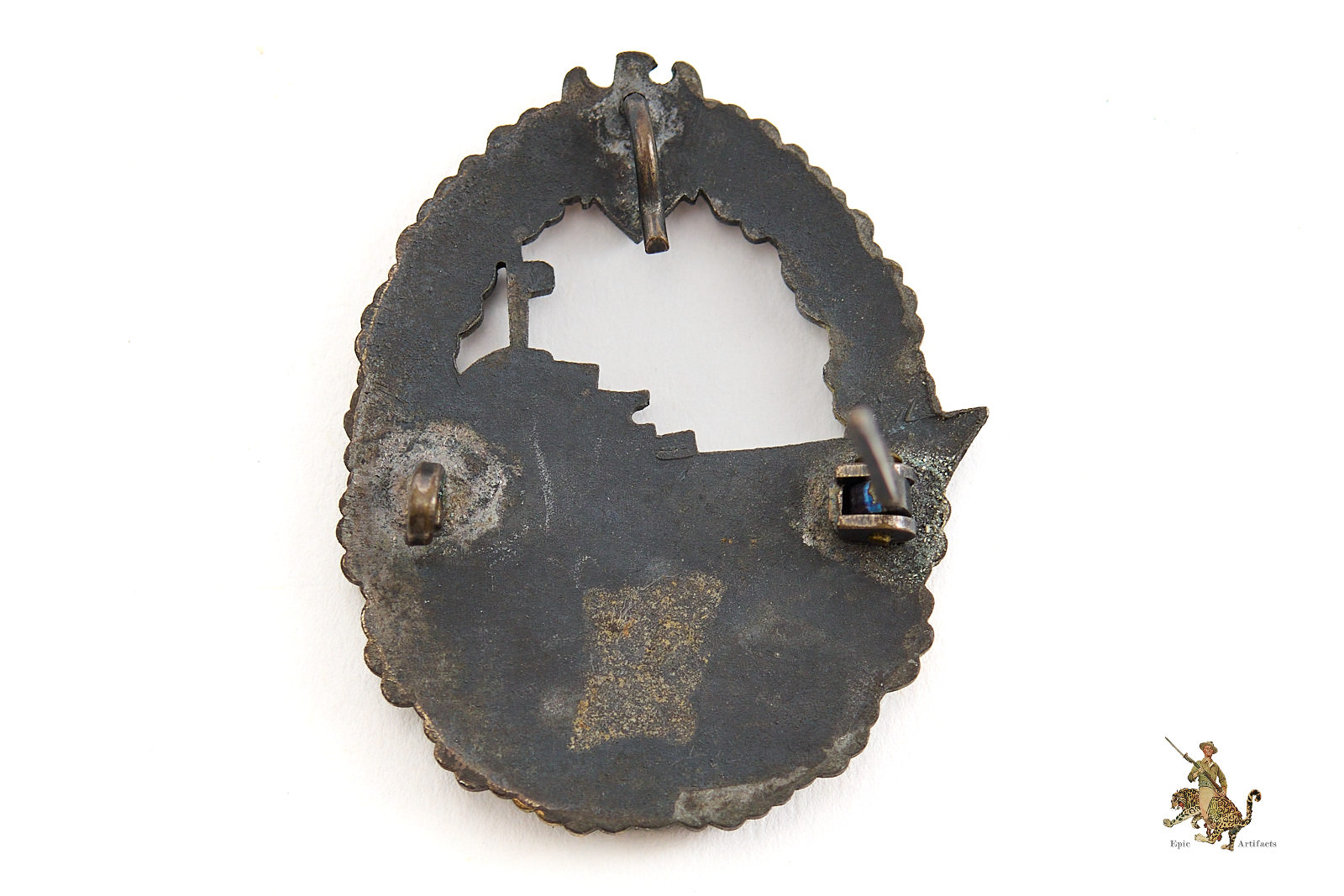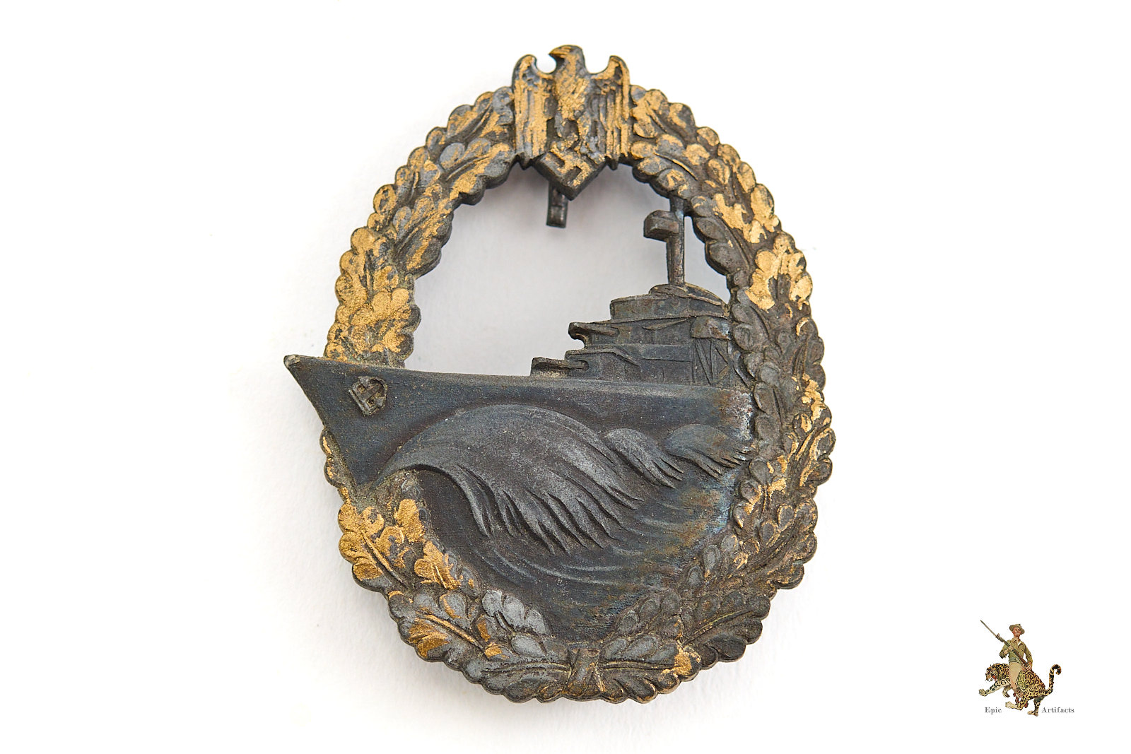 Historical Description: The Kriegsmarine Destroyer Badge (Zerstörer-Kriegsarbzeichen was a wartime decoration of the German Navy. It was officially instituted on June 4, 1940 by Kriegsmarine chief Grossadmiral Erich Raeder, and originally was awarded only to crew members of the vessels in Zerstörer-Gruppe Narvik, who met the stipulated criteria. Over the course of the wear, the regulations for awarding this badge were changed several times, expanding the range of sailors who were entitled to the award. Eventually, this badge would be awarded to crews of other destroyers as well as torpedo boats, and several battleships and cruisers that had participated in operations in Norway in 1940. The badge was designed by Paul Casberg of Berlin, and was initially produced in a brass alloy, then later in zinc. A miniature form was also produced for wear on civilian clothes.