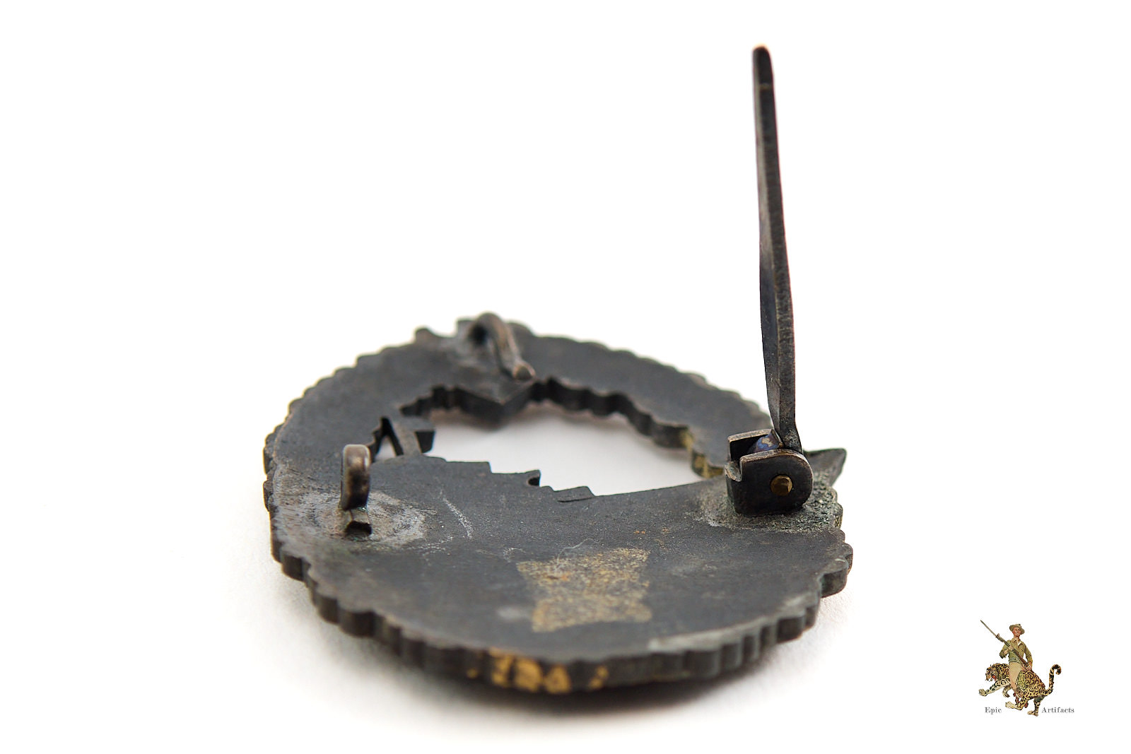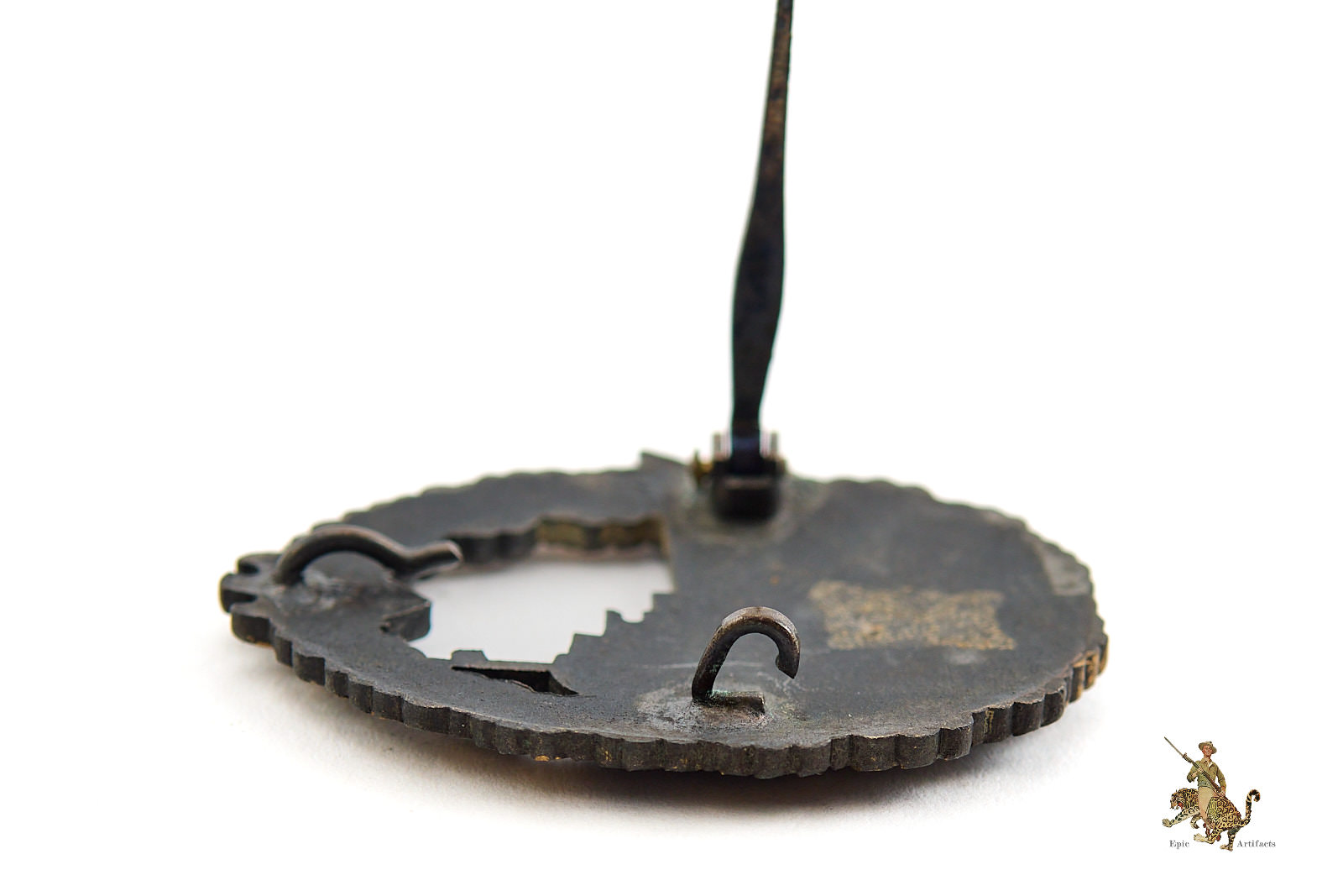 Product Description: A Kriegsmarine Destroyer Badge – French Bacqueville, attributed to the Parisian maker Bacqueville, executed with characteristic detail and construction. Approximately 50% of the original gold finish remains on the wreath, with pleasing contrast and honest age wear. The Destroyer retains some original finish in the recesses, and shows zinc base metal throughout more heavily at the high points. The reverse is fitted with a banjo-style pin and features an anti-rotational hook at the top, consistent with known examples from this group. Overall this badge rates in excellent condition.