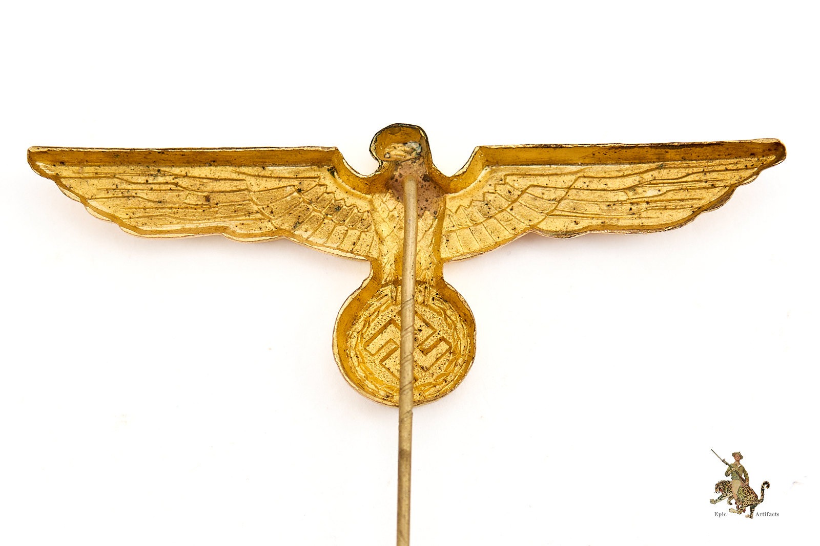 Product Description: An exceptional Kriegsmarine Donald Duck Cap Eagle, executed in stickpin format and measuring approximately 2 1/2 inches across. This finely detailed insignia, intended for the iconic Kriegsmarine “Donald Duck” sailor cap, is rendered in high relief with crisp detailing to the eagle’s feathers and swastika.