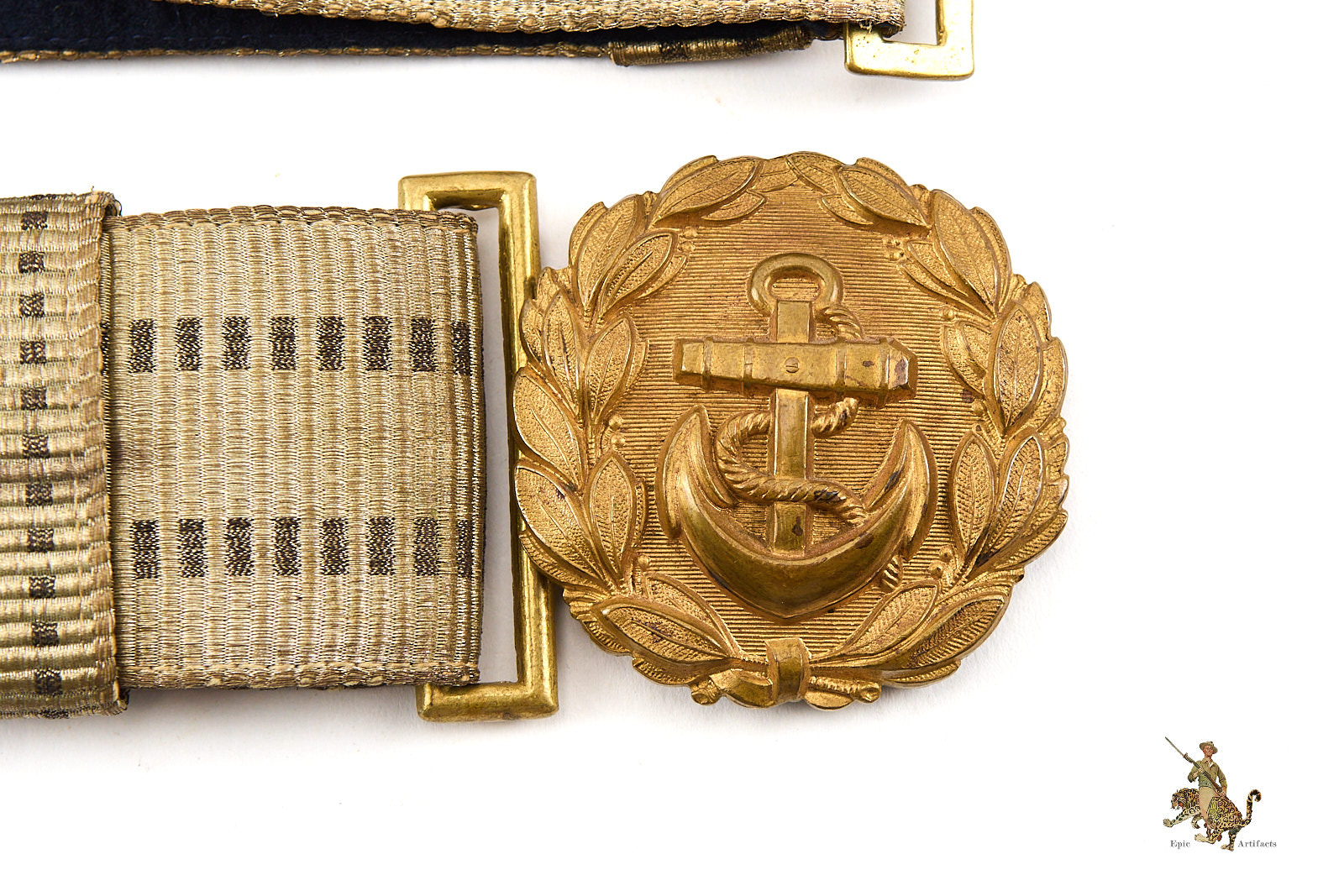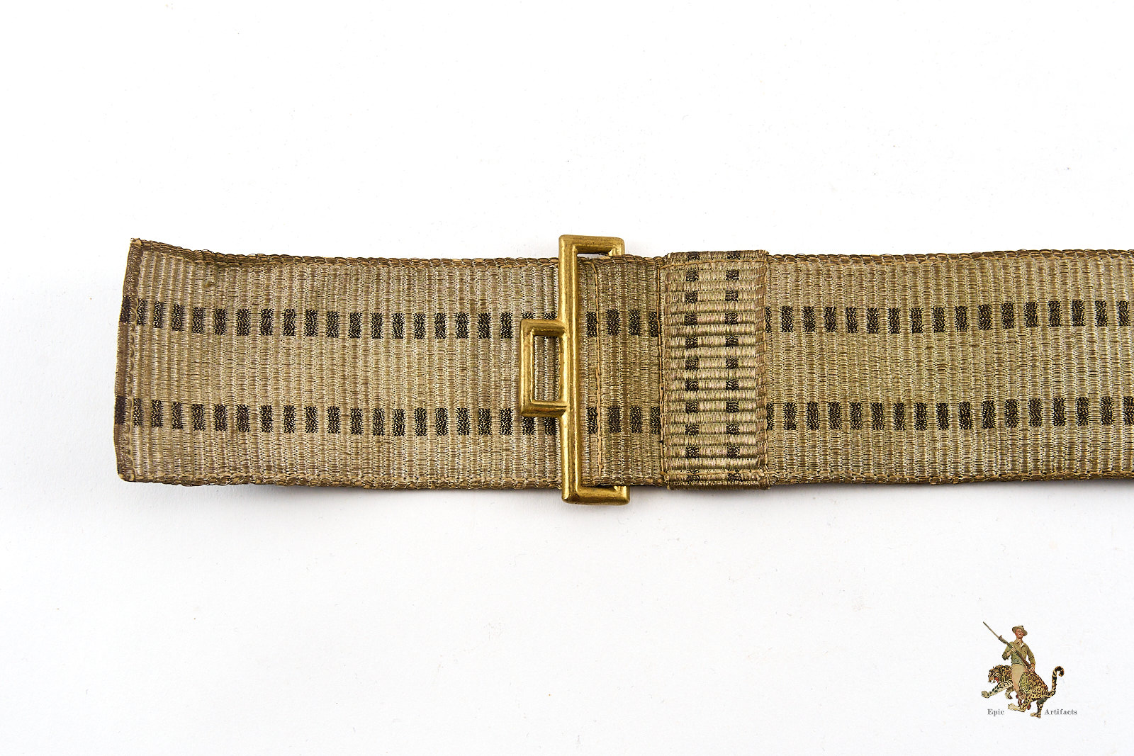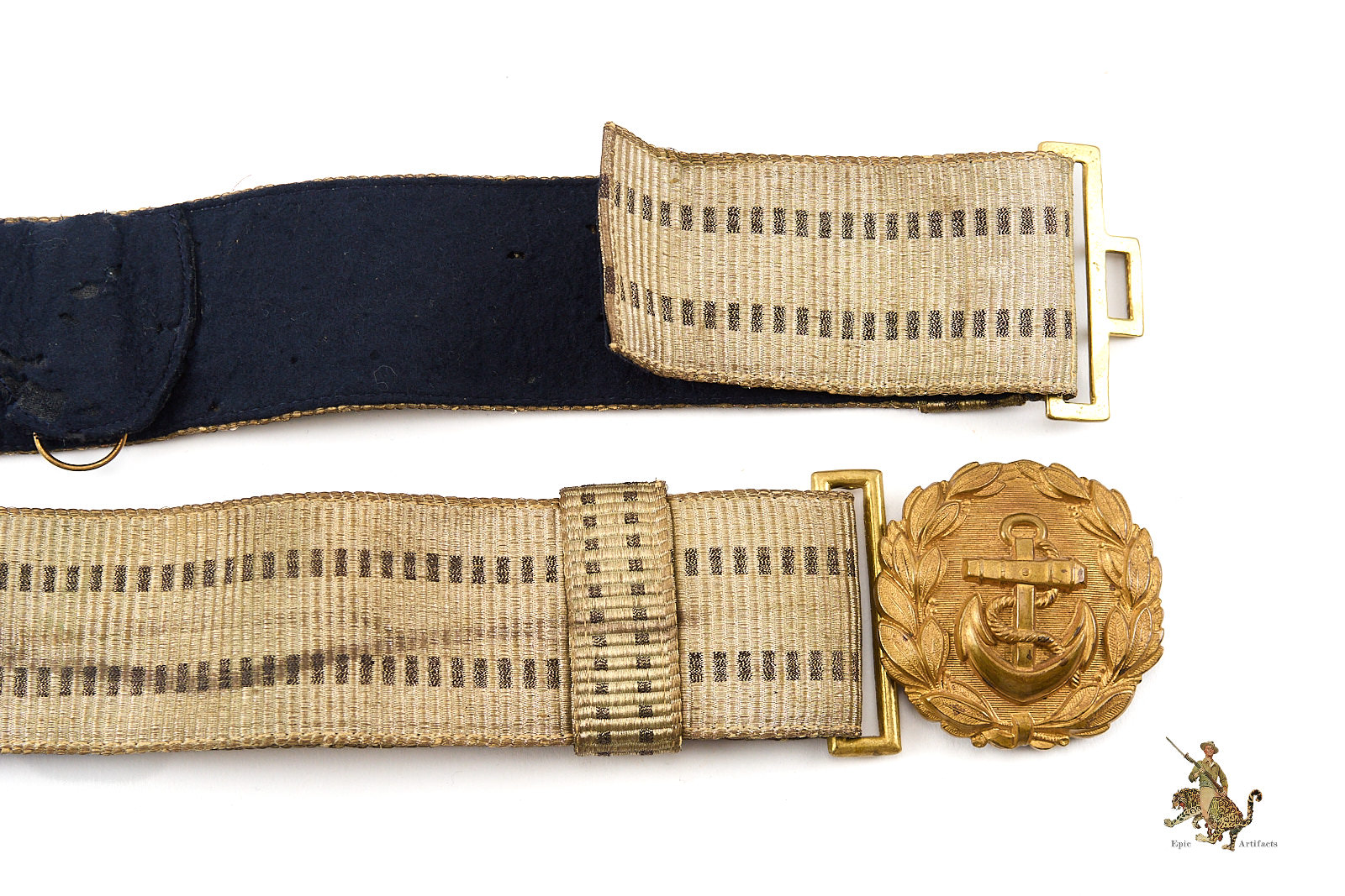 Product Description: A well-preserved Kriegsmarine Line Officer Brocade Belt, measuring approximately 31.5 inches in length of the brocade cloth. The brass buckle and catches remain in excellent condition, exhibiting only minor surface wear consistent with light period use. The brocade itself presents attractively overall, with some areas of discoloration and minor snags, as expected for a textile of this age.