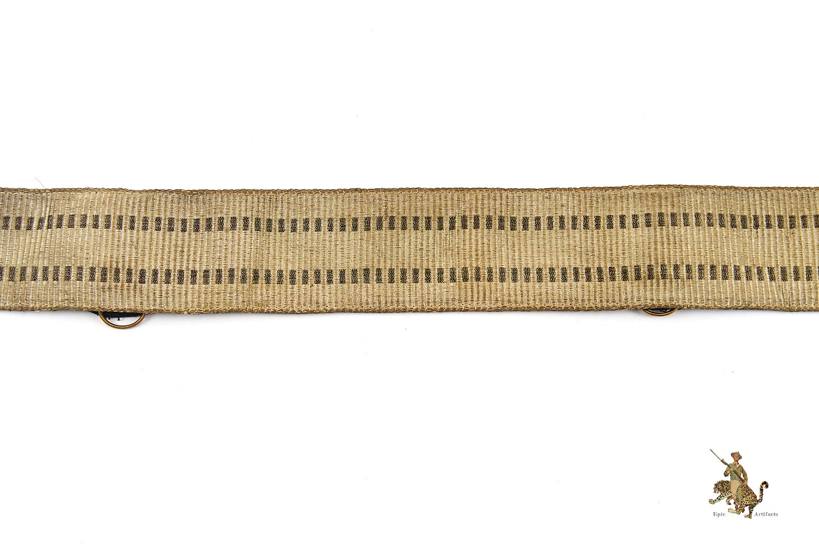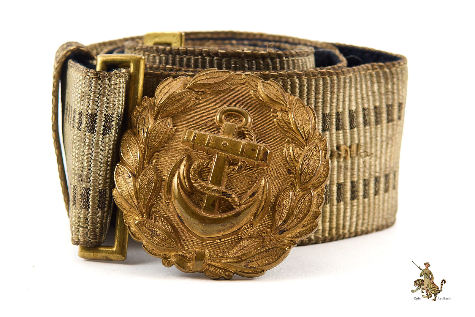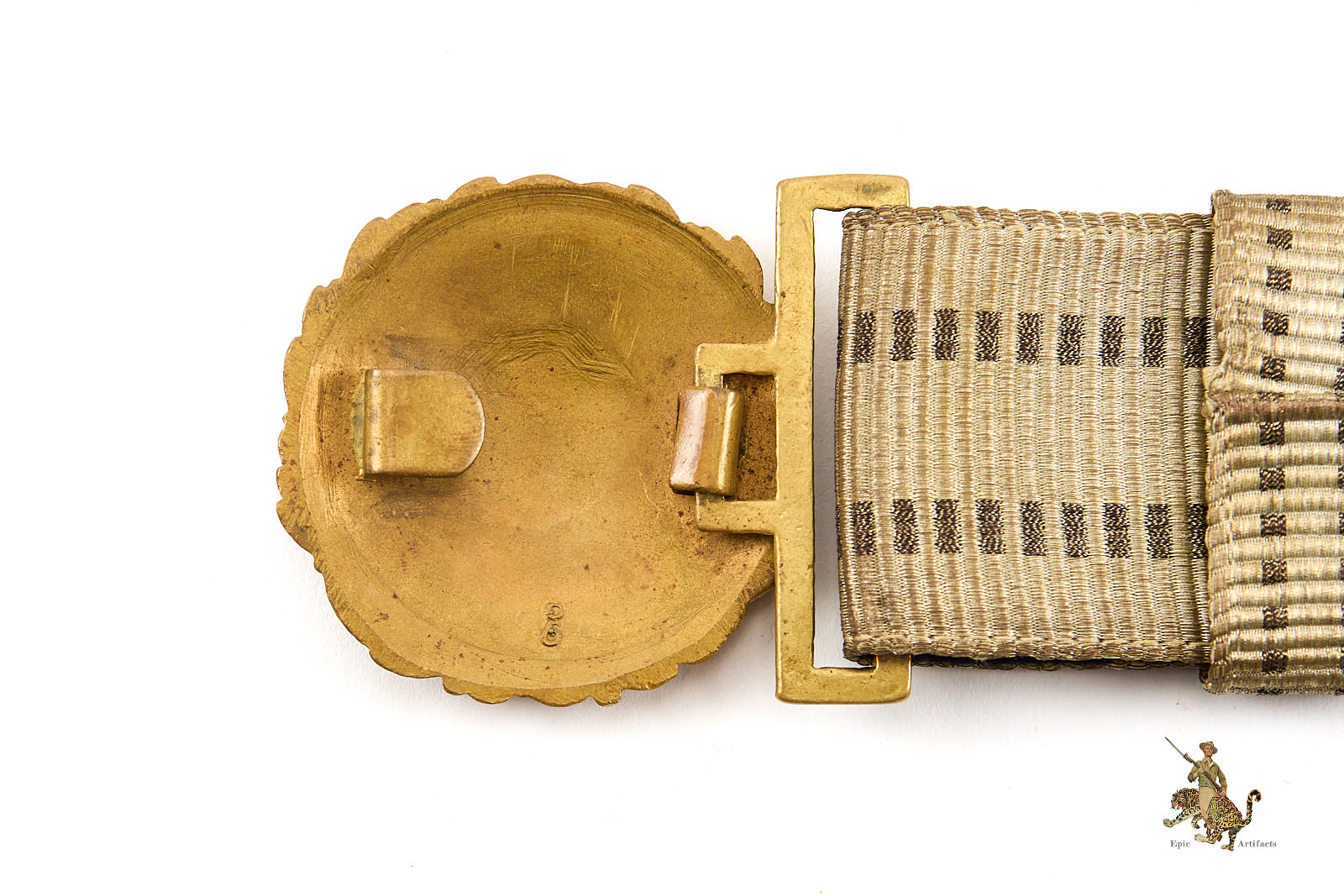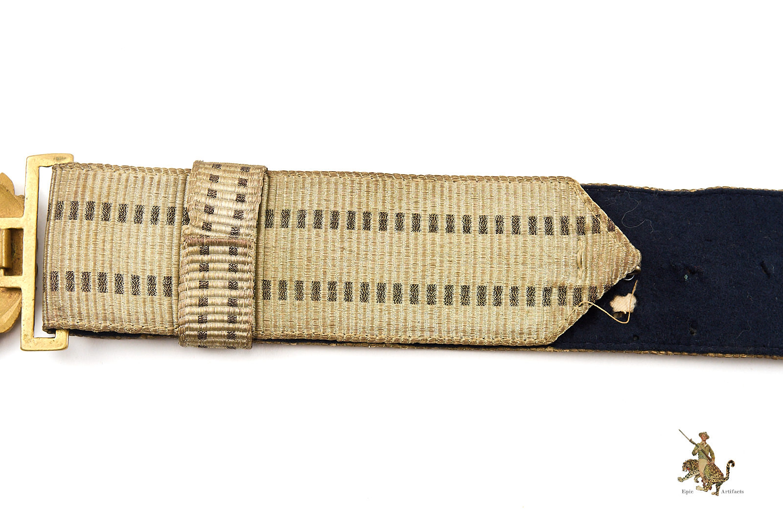 Product Description: A well-preserved Kriegsmarine Line Officer Brocade Belt, measuring approximately 31.5 inches in length of the brocade cloth. The brass buckle and catches remain in excellent condition, exhibiting only minor surface wear consistent with light period use. The brocade itself presents attractively overall, with some areas of discoloration and minor snags, as expected for a textile of this age.
