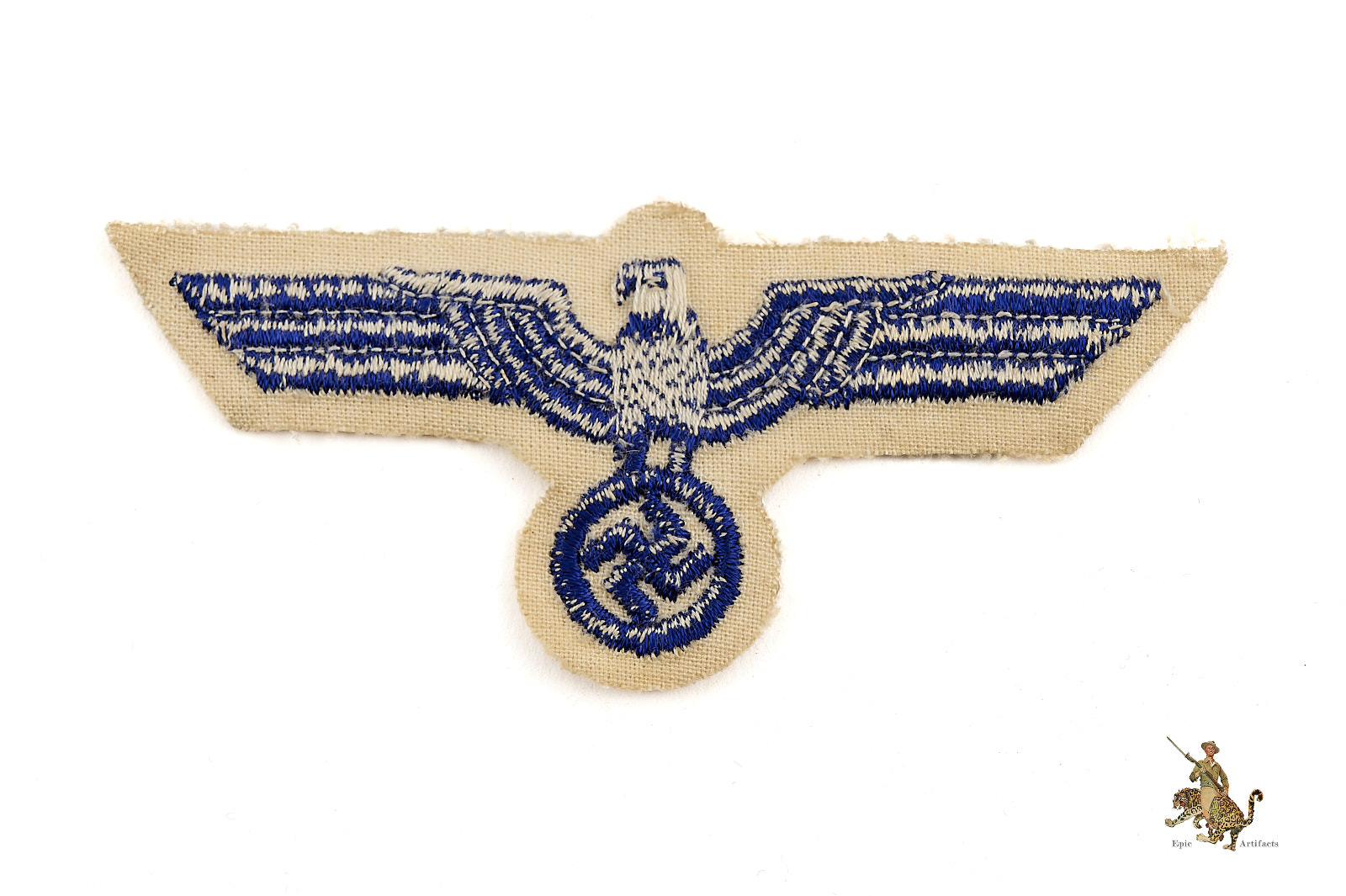 Historical Description: The German Armed Forces (Wehrmacht), as formed in 1935, and as they existed until the end of World War 2, consisted of the Army (Heer), the Air Force (Luftwaffe) and the Navy (Kriegsmarine). The Waffen-SS fell under the command of the Wehrmacht during the war. Each of these branches of service had a unique eagle design that was worn on both the formal dress and parade uniforms, and the field uniforms, of the members of that branch. These eagles were worn on soft headgear, including service and field caps, as well as on the uniform jacket. In the Heer, the Luftwaffe, and the Kriegsmarine, this eagle was worn on the chest of the tunic; collectors have termed these “breast eagles.” The Heer and the Luftwaffe generally used the same eagle style, though variations in color of the eagle or the backing distinguish between the two. The Luftwaffe used their own flying eagle emblem. The Waffen-SS sleeve eagle (and cap eagle) had wings that came to a distinctive tapered point. The cap, breast and sleeve eagles used by the various military branches were manufactured in many variations. There were machine-woven and machine embroidered versions, usually used by officers and NCOs. Hand-embroidered bullion wire eagles were typically for officers. There were metal eagles, for caps, or for uniforms that were intended to have detachable insignia. There were even eagles embroidered on camouflage fabric, intended for use on special field uniforms. There were also eagles in specific colors for use on tropical uniforms. Some of these eagles were mass-produced and are still common today. Others were, and are, very rare.