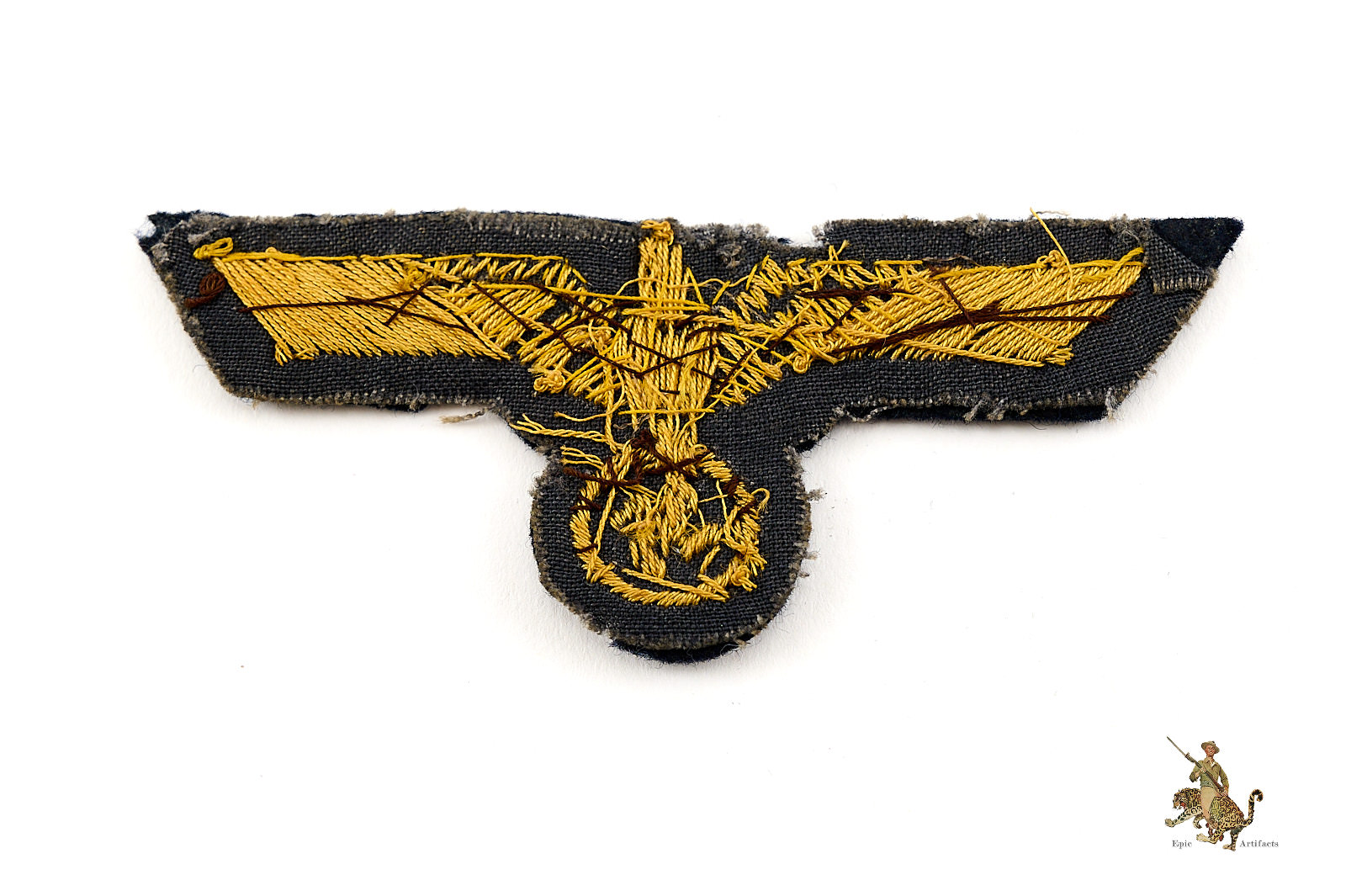 Historical Description: The German Armed Forces (Wehrmacht), as formed in 1935, and as they existed until the end of World War 2, consisted of the Army (Heer), the Air Force (Luftwaffe) and the Navy (Kriegsmarine). The Waffen-SS fell under the command of the Wehrmacht during the war. Each of these branches of service had a unique eagle design that was worn on both the formal dress and parade uniforms, and the field uniforms, of the members of that branch. These eagles were worn on soft headgear, including service and field caps, as well as on the uniform jacket. In the Heer, the Luftwaffe, and the Kriegsmarine, this eagle was worn on the chest of the tunic; collectors have termed these “breast eagles.” The Heer and the Luftwaffe generally used the same eagle style, though variations in color of the eagle or the backing distinguish between the two. The Luftwaffe used their own flying eagle emblem. The Waffen-SS sleeve eagle (and cap eagle) had wings that came to a distinctive tapered point. The cap, breast and sleeve eagles used by the various military branches were manufactured in many variations. There were machine-woven and machine embroidered versions, usually used by officers and NCOs. Hand-embroidered bullion wire eagles were typically for officers. There were metal eagles, for caps, or for uniforms that were intended to have detachable insignia. There were even eagles embroidered on camouflage fabric, intended for use on special field uniforms. There were also eagles in specific colors for use on tropical uniforms. Some of these eagles were mass-produced and are still common today. Others were, and are, very rare.