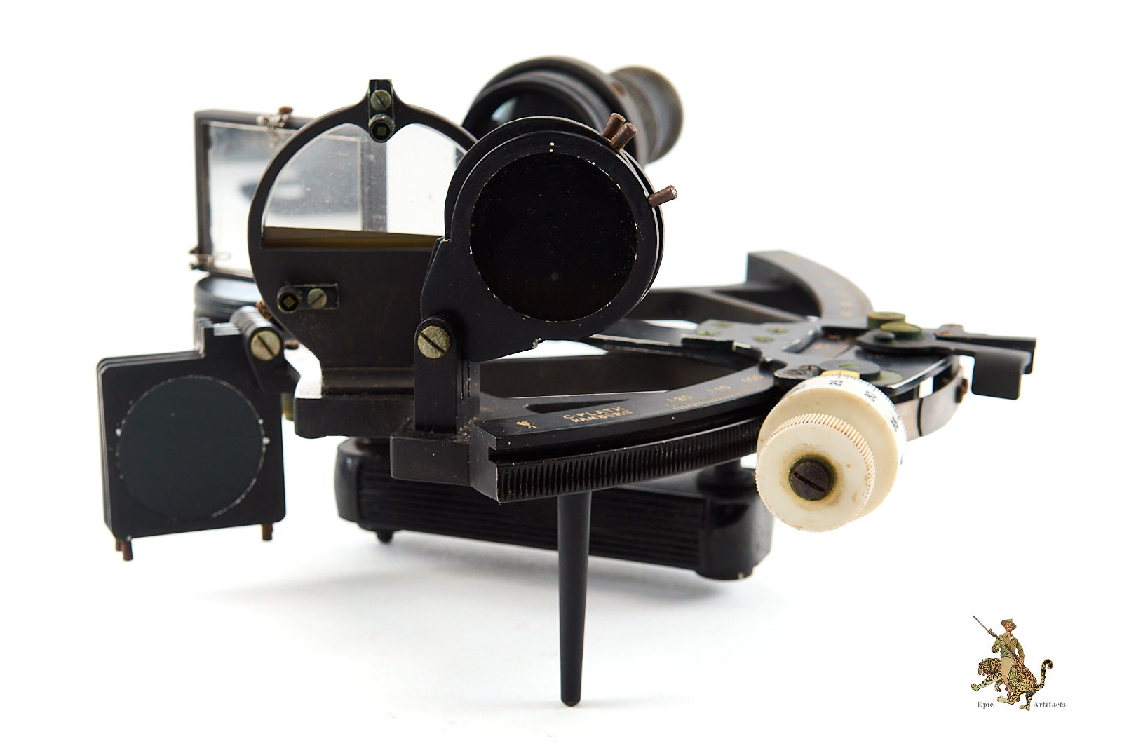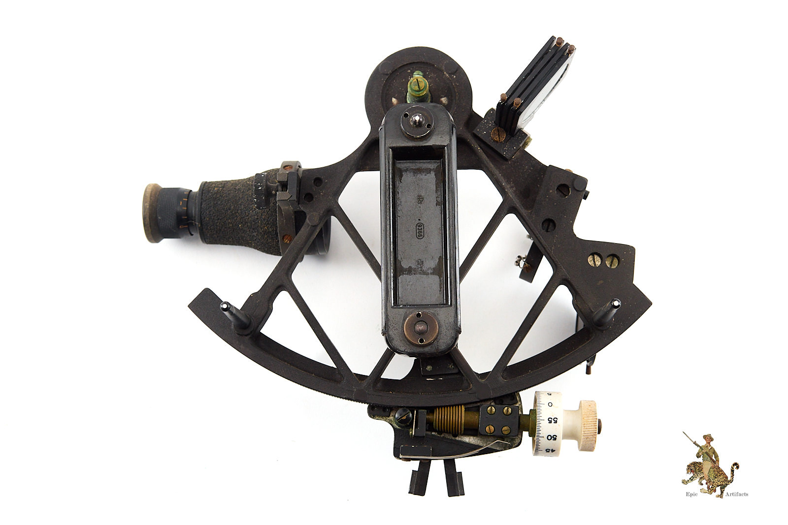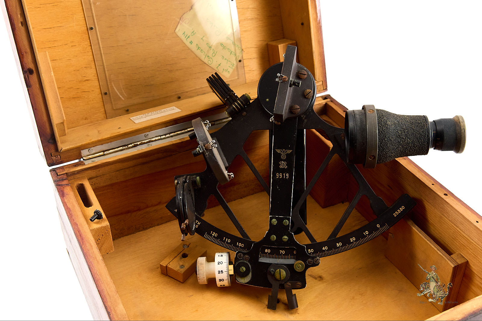 The instrument retains all of its original lenses and components, though some glass surfaces show light wear and minor finish loss consistent with age and service. Overall, the Kriegsmarine Sextant in Case – C. Plath presents a complete and historically significant example of German naval navigation equipment, offering insight into both the craftsmanship of C. Plath and the operational realities of wartime seafaring, as well as its post-war journey.