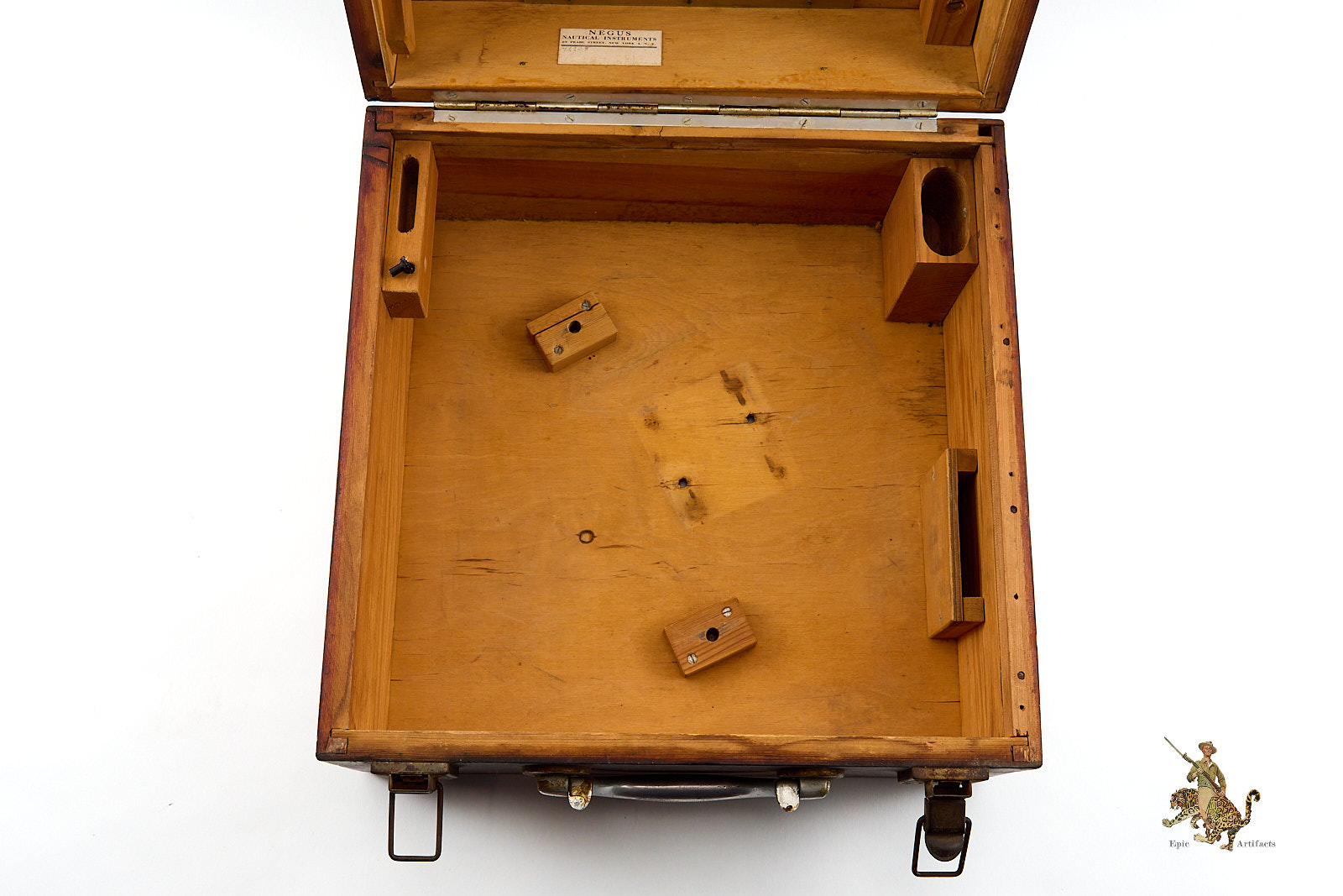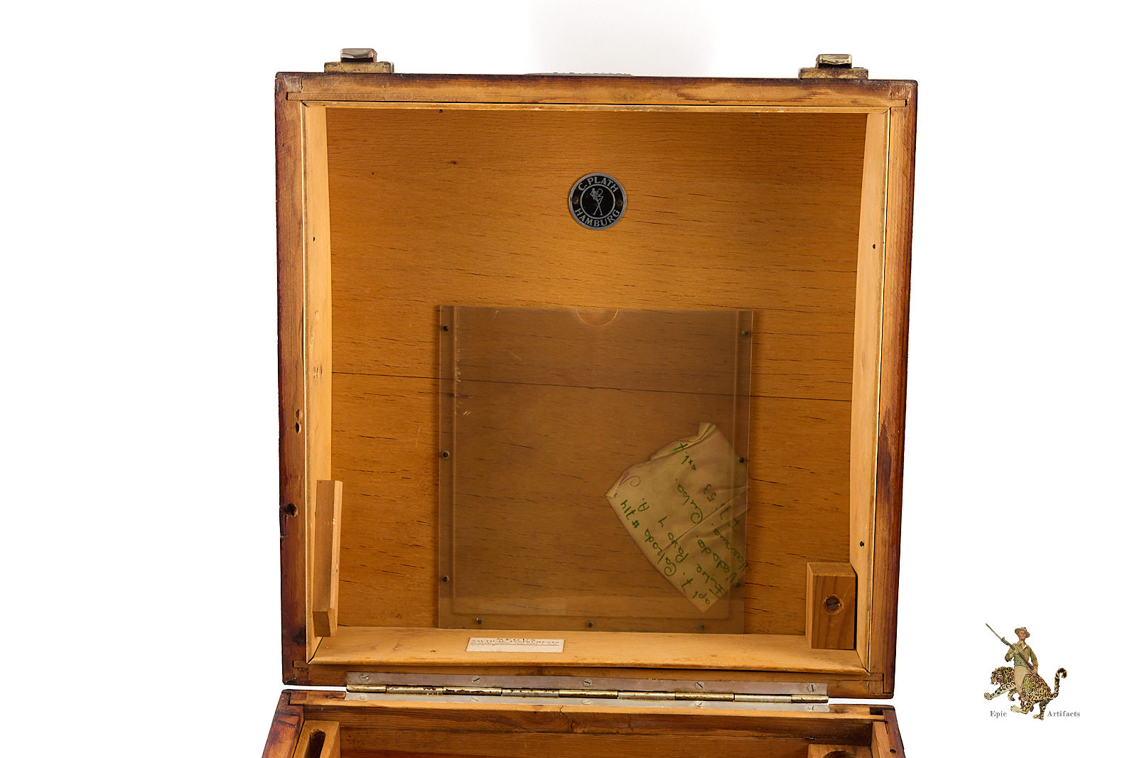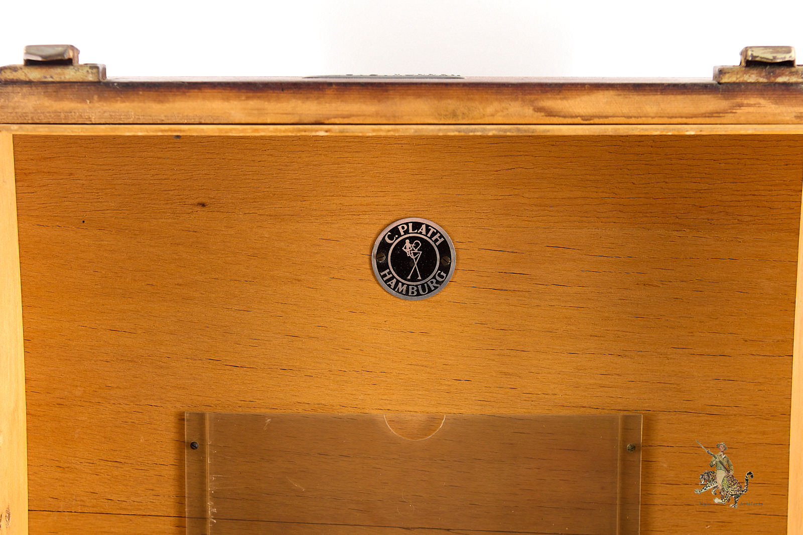 The instrument retains all of its original lenses and components, though some glass surfaces show light wear and minor finish loss consistent with age and service. Overall, the Kriegsmarine Sextant in Case – C. Plath presents a complete and historically significant example of German naval navigation equipment, offering insight into both the craftsmanship of C. Plath and the operational realities of wartime seafaring, as well as its post-war journey.