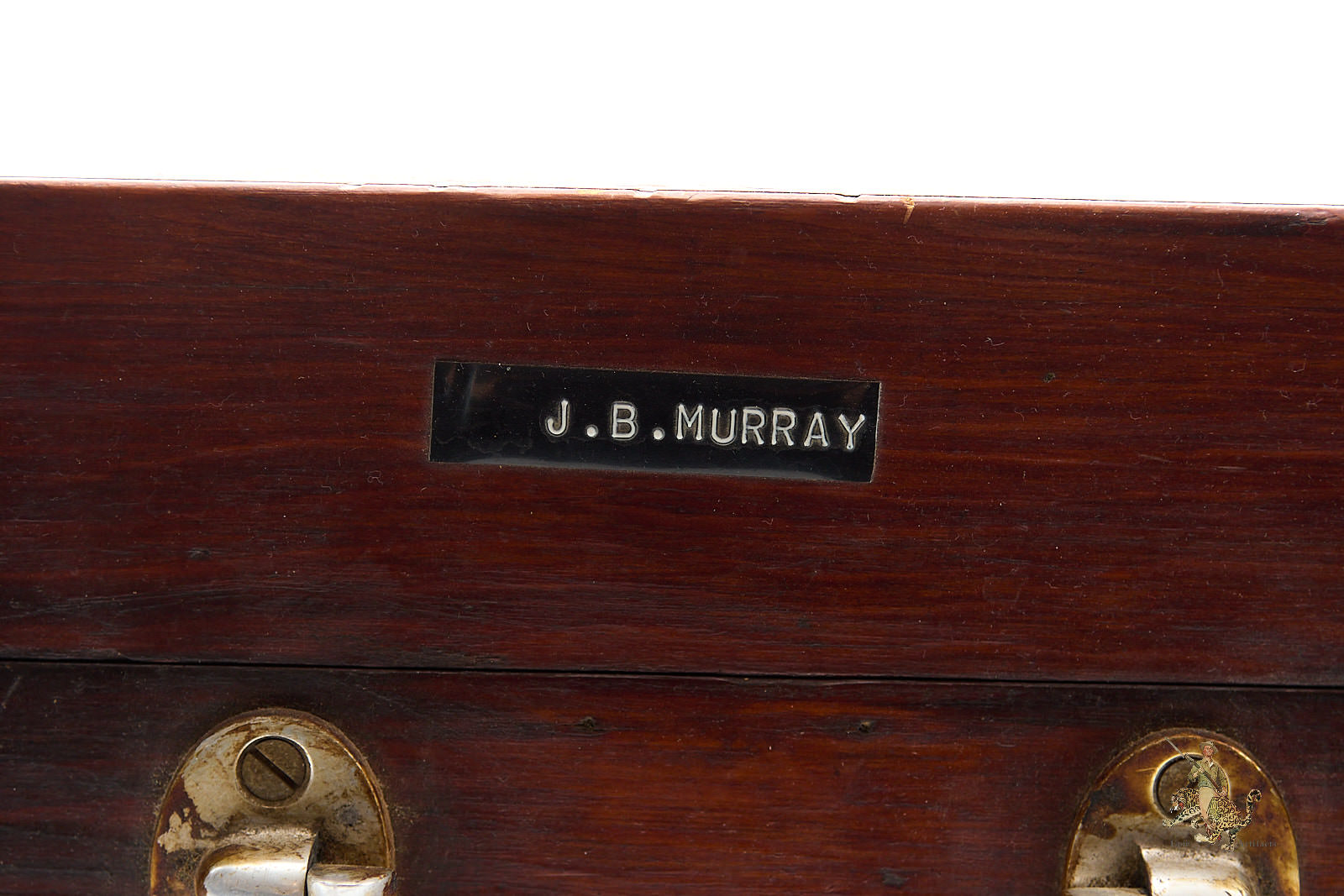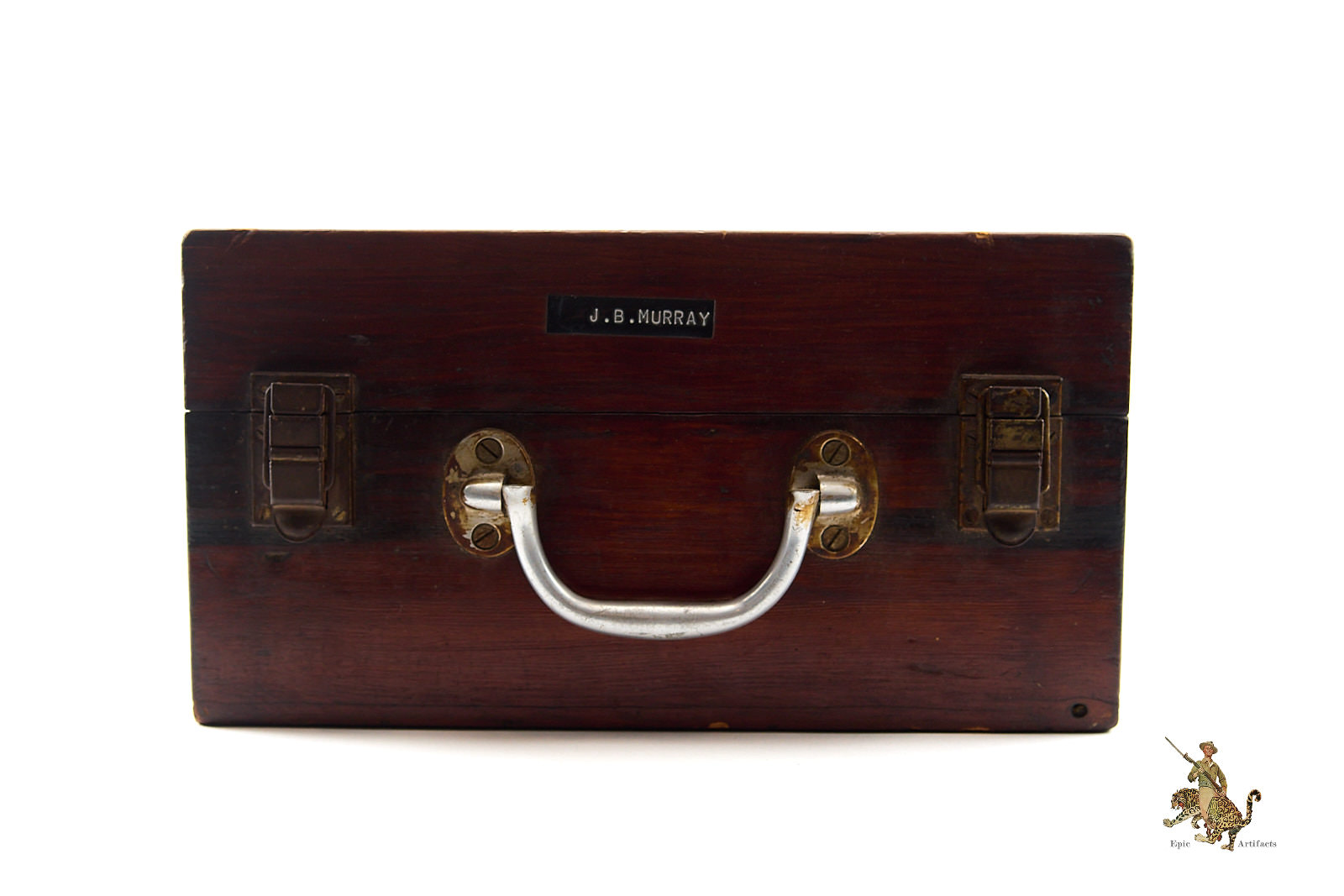 Product Description: An important navigational instrument of World War II, this Kriegsmarine Sextant in Case – C. Plath was used aboard U-boats and other German naval vessels, reflecting both precision engineering and operational history. The metal sextant body is marked with a centralized eagle and swastika over “M,” while the bakelite handle bears the maker’s imprint, “C. Plath Hamburg.” The accompanying wood case features a sticker for Negus Nautical Instruments, a metallic label for C. Plath Hamburg, and an additional outer label marked “J.B. Murray,” possibly indicating the veteran who brought the instrument back, adding a personal layer of provenance.