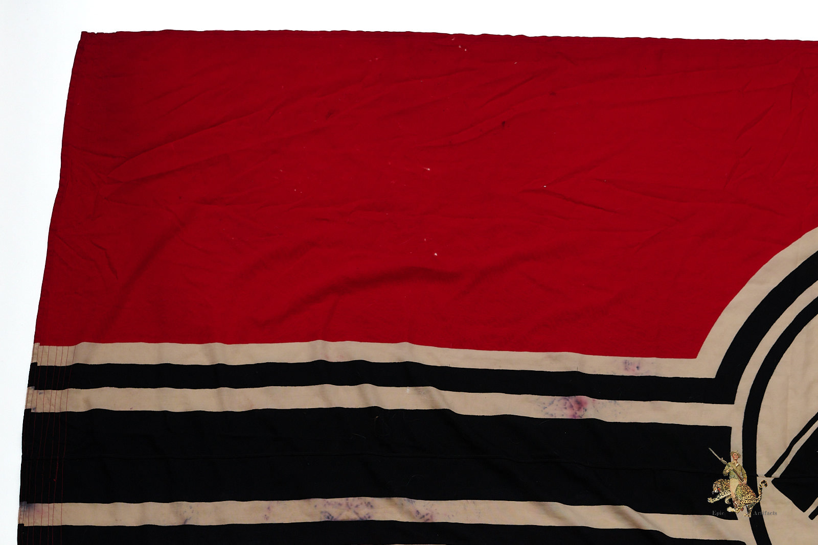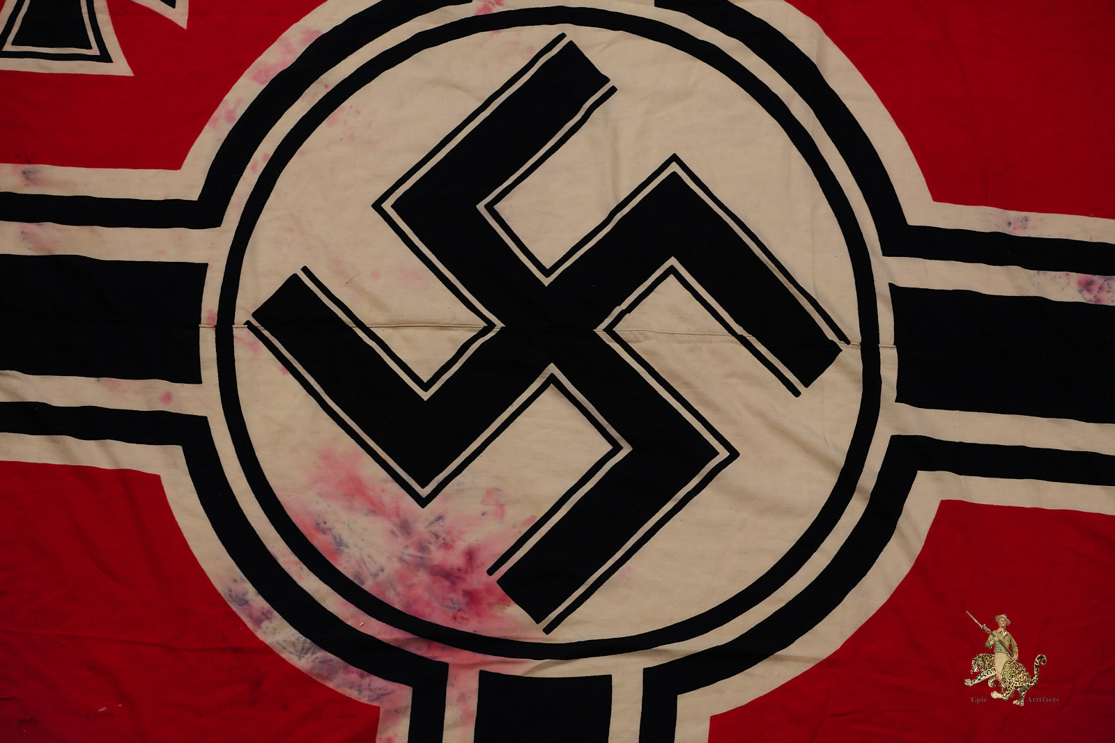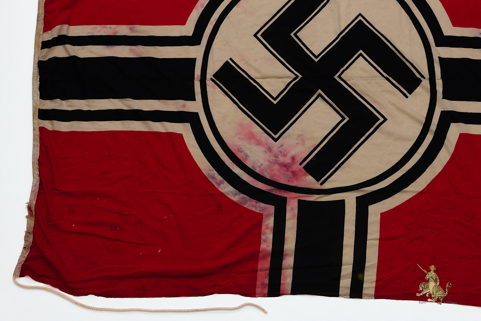 Historical Description: The red flag with white central disk and black swastika was introduced by Hitler in the 1920s as the flag of the National Socialist political party. In 1933, shortly after the Nazis took power, this party flag was recognized alongside the black-white-red Imperial tricolor as one of Germany’s national flags. In 1935, the use of the tricolor flag was discontinued, and between September 1935 and May 8, 1945, the Nazi party flag was the sole national flag of Germany. From its creation in the 1920s through the end of the war, this swastika flag was made and used in endless variations, from the massive banners hung at Party Day rallies to small pennants, bunting flags, and hand-held paper flags distributed along parade routes. These flags, banners and pennants flew from ships, were hung from official and private buildings, and were displayed outside business and private homes. At the end of WWII, the Allied military governments abolished the use of all Nazi symbols, including the national flag. Most Third Reich era German national flags were simply destroyed.