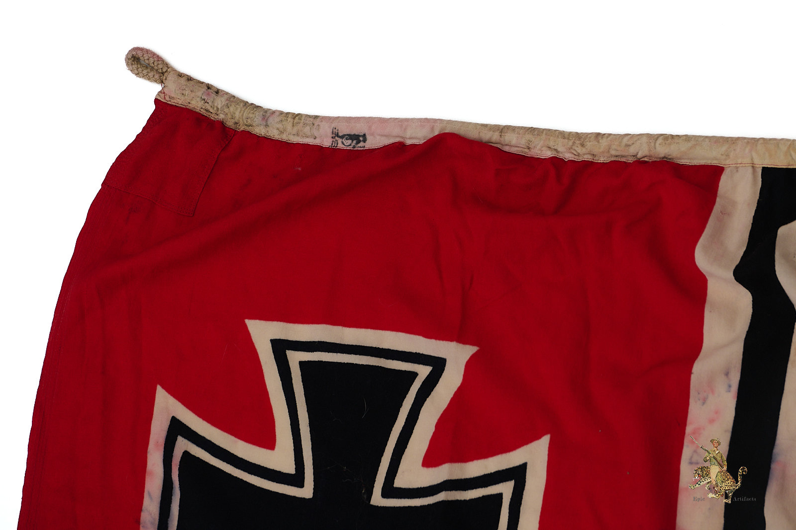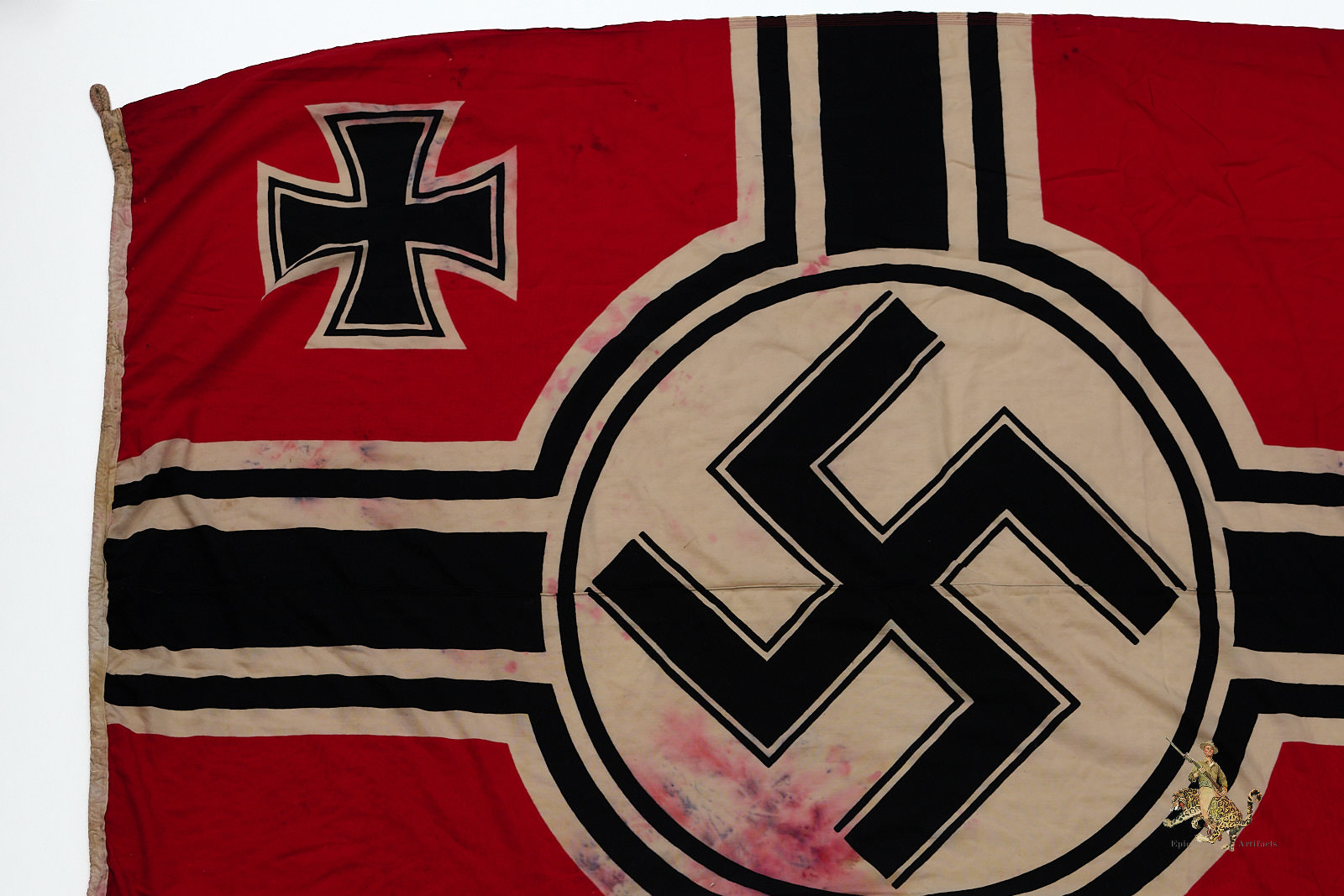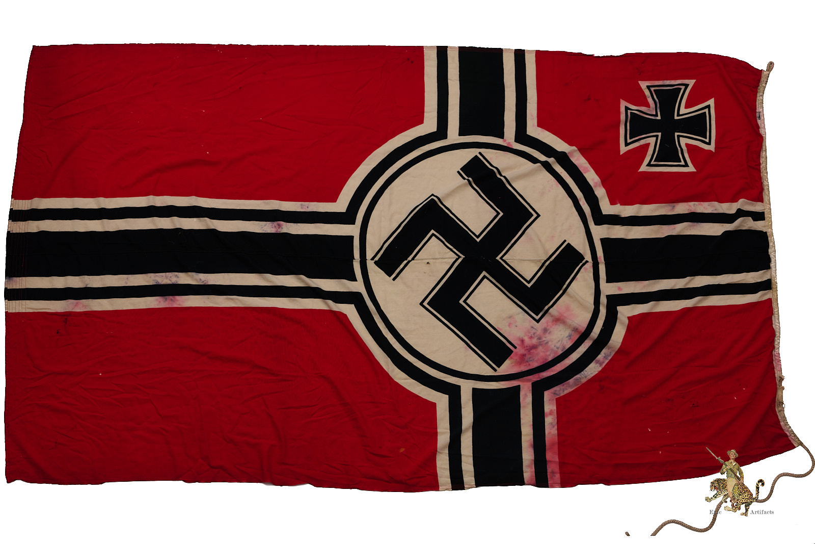 Product Description: Listed for sale is one of the largest WWII Kriegsmarine battle flags we’ve encountered.  This authentic German naval flag measuring 200cm x 335cm (78in x 134in), preserved in good condition. Made of high-quality cotton, it retains its vibrant colors, original securing rope, and structural integrity. Flag shows heavy discoloration and wear as shown.  Various KM and other stamps on hoist edge as shown.  This artifact offers a remarkable opportunity to own a genuine piece of WWII naval history, making it a standout addition to any military collection.