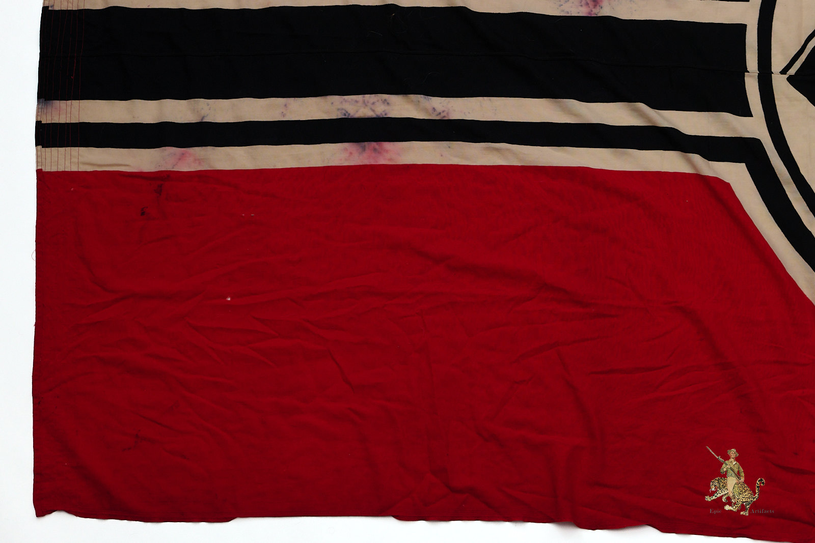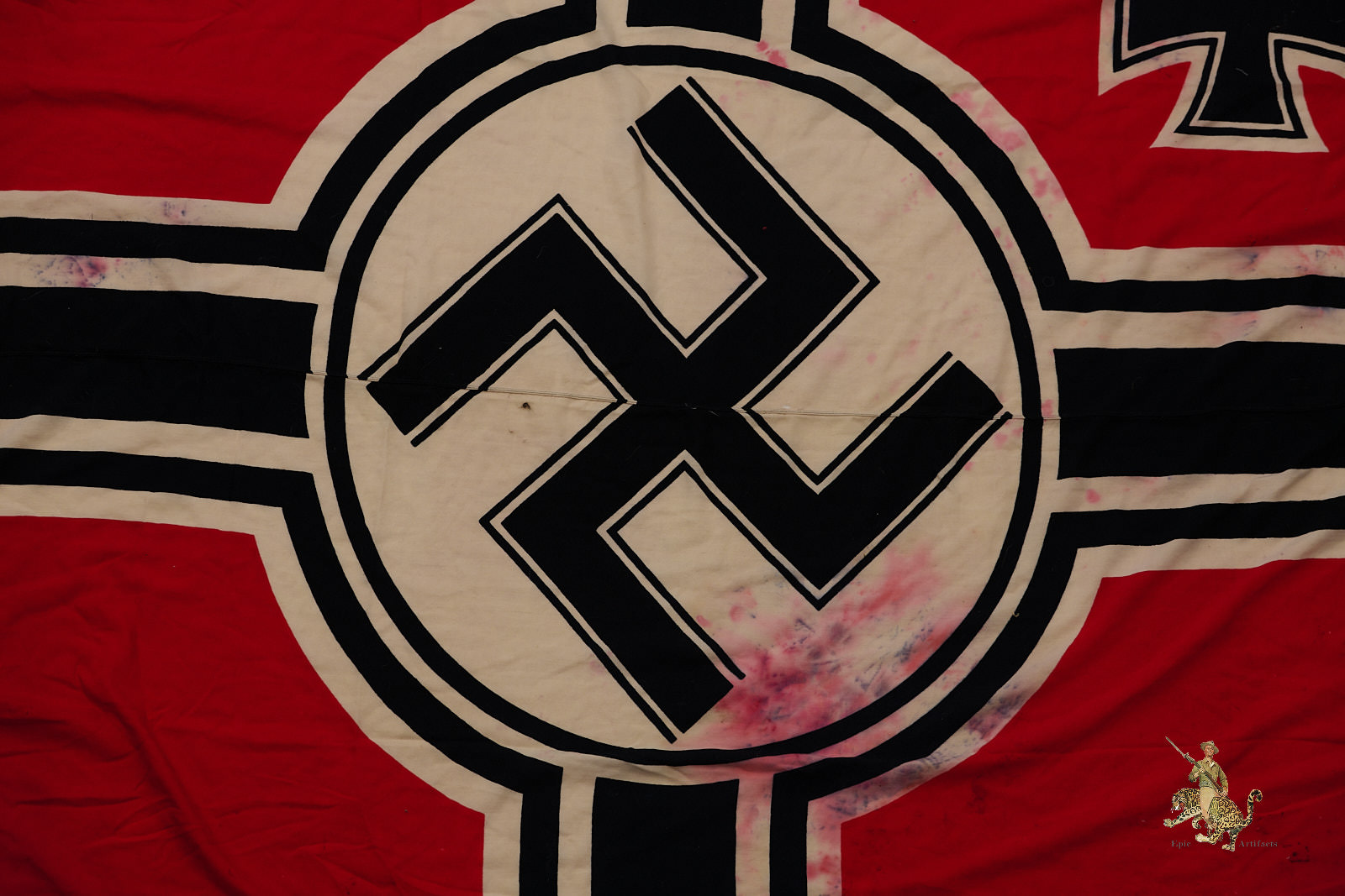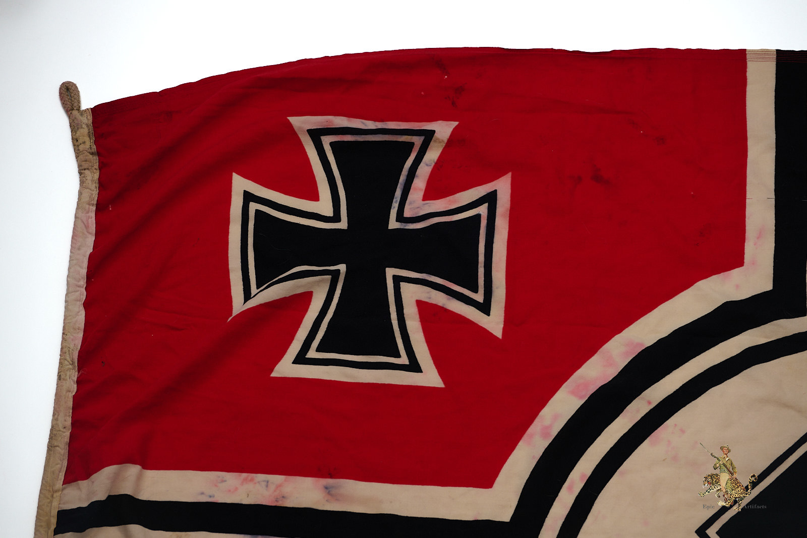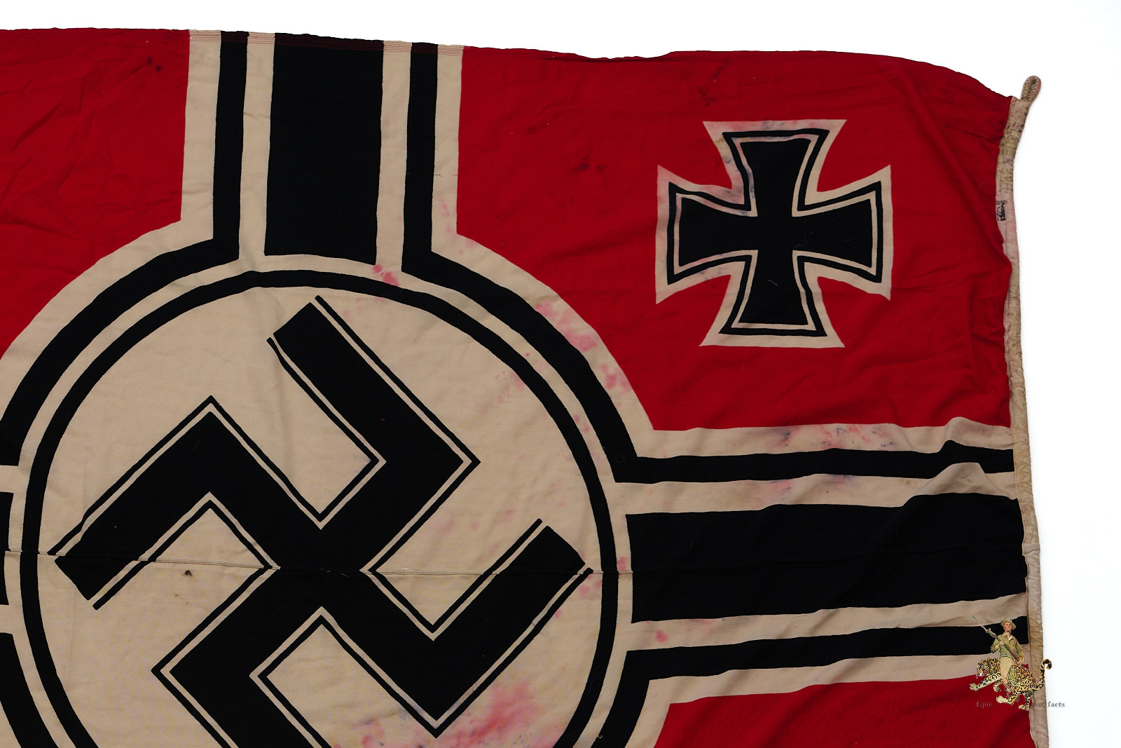 Product Description: Listed for sale is one of the largest WWII Kriegsmarine battle flags we’ve encountered.  This authentic German naval flag measuring 200cm x 335cm (78in x 134in), preserved in good condition. Made of high-quality cotton, it retains its vibrant colors, original securing rope, and structural integrity. Flag shows heavy discoloration and wear as shown.  Various KM and other stamps on hoist edge as shown.  This artifact offers a remarkable opportunity to own a genuine piece of WWII naval history, making it a standout addition to any military collection.