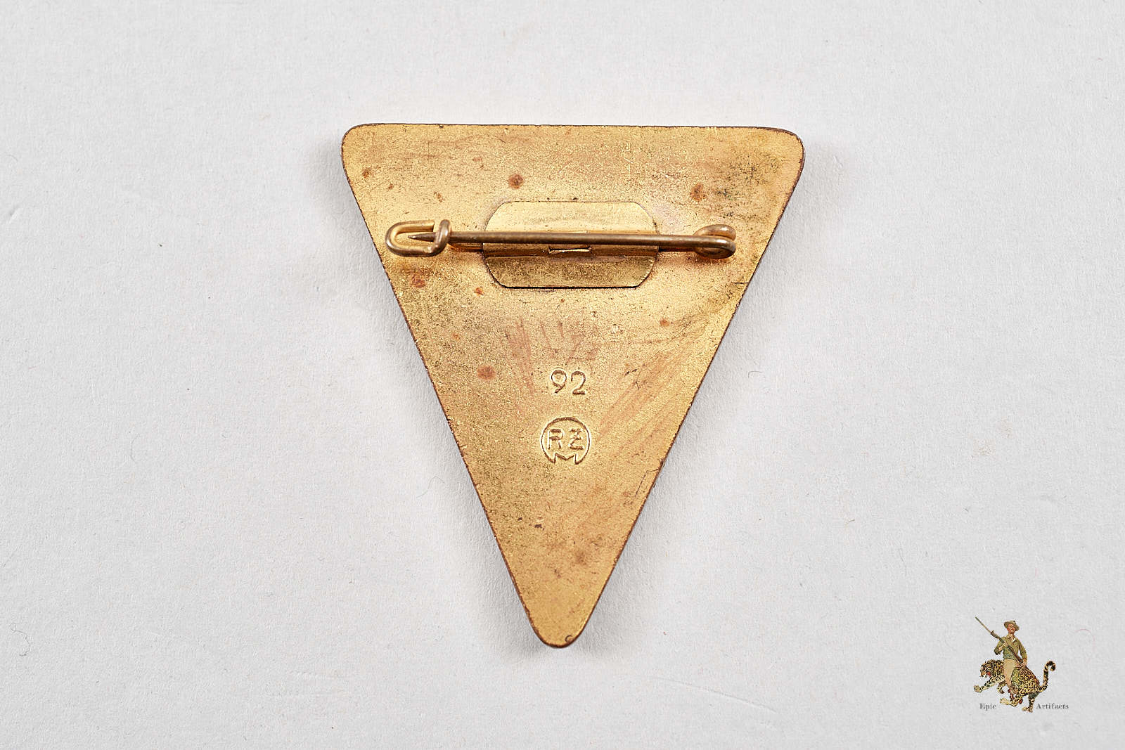 Large 2nd pattern with red, white and black enamel on gold. Pin back and marked RZM 92 for Karl Wild. Badge is about 1-3/4 inches top to bottom and about 1- 5/8 inches across top. Badge shows one chip to enamel near top left in the black area. Overall this Large Nat. Soz. Frauenschaft Member Badge is in excellent condition.