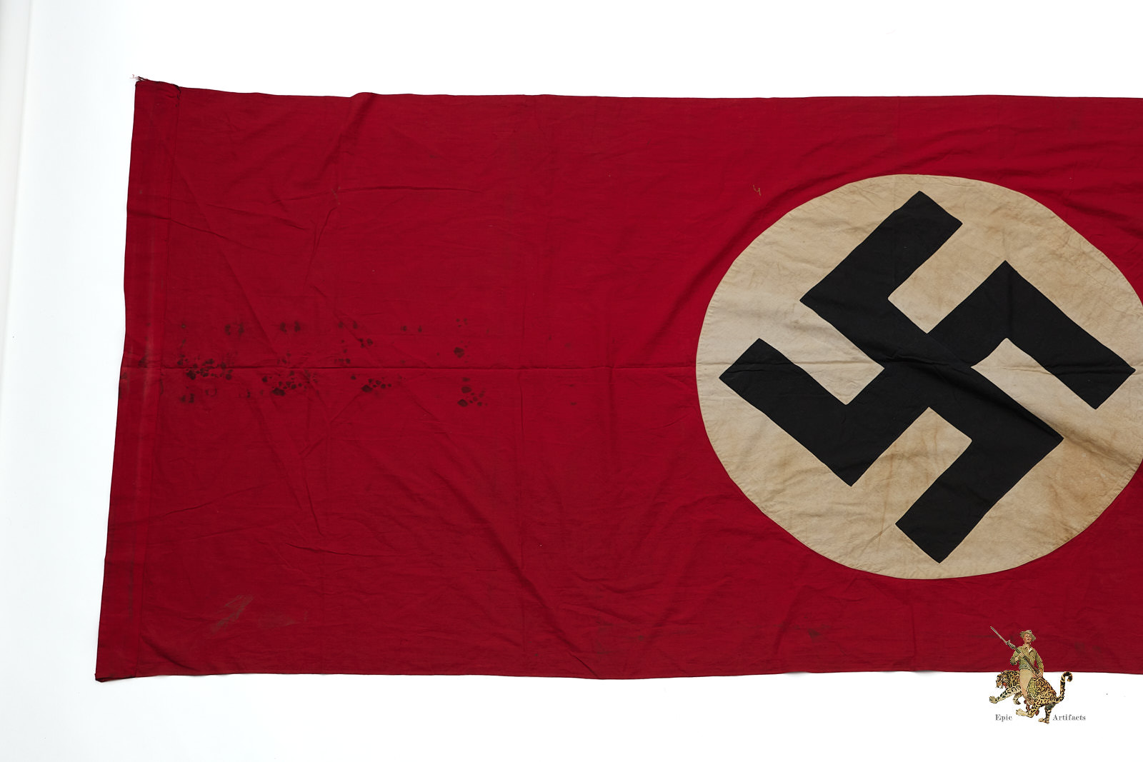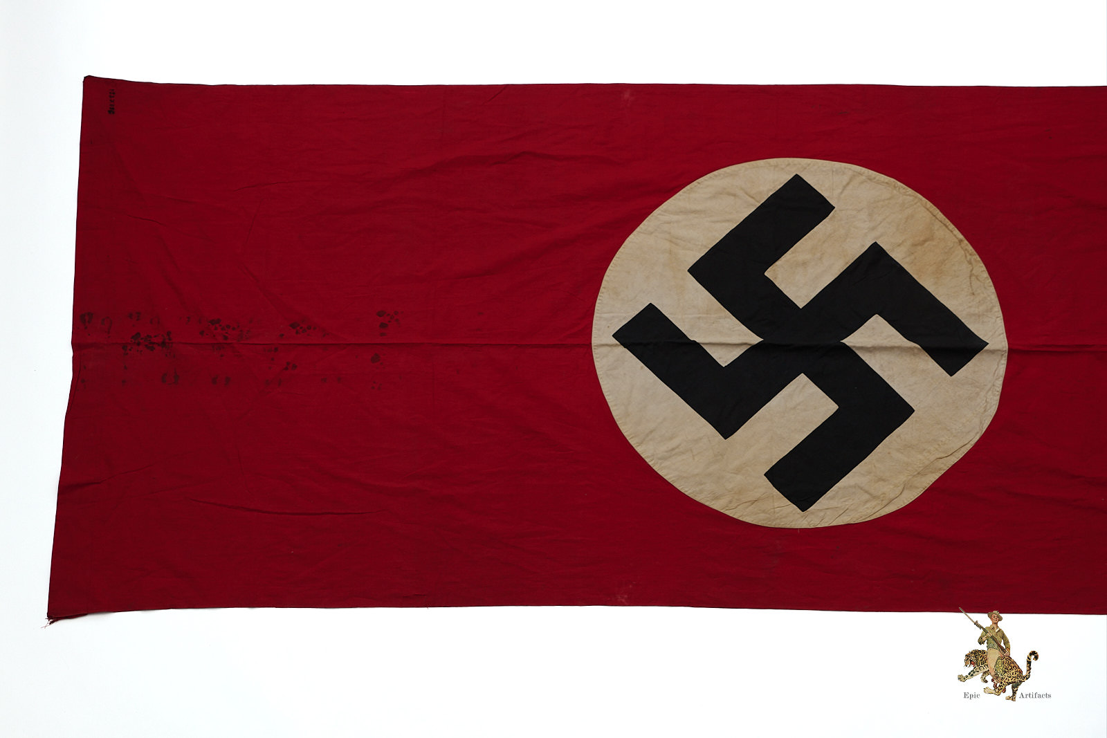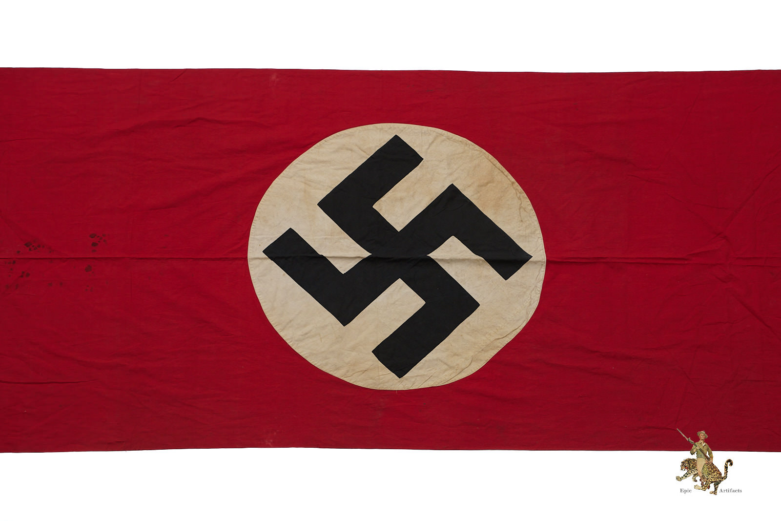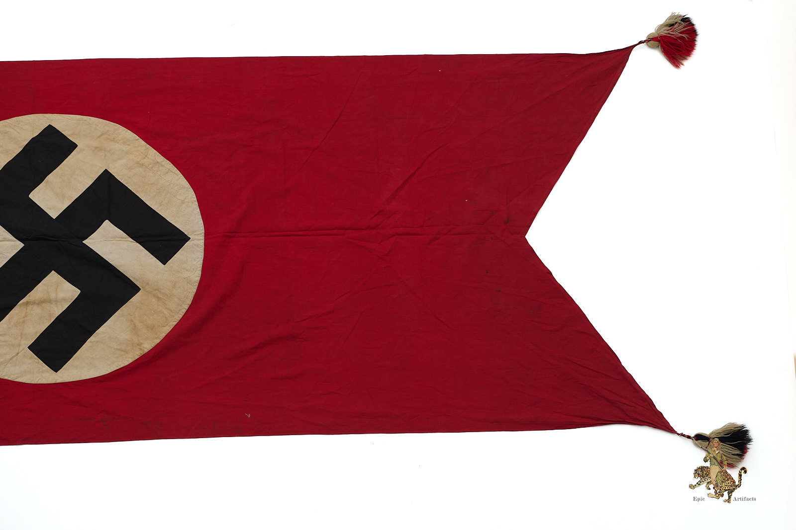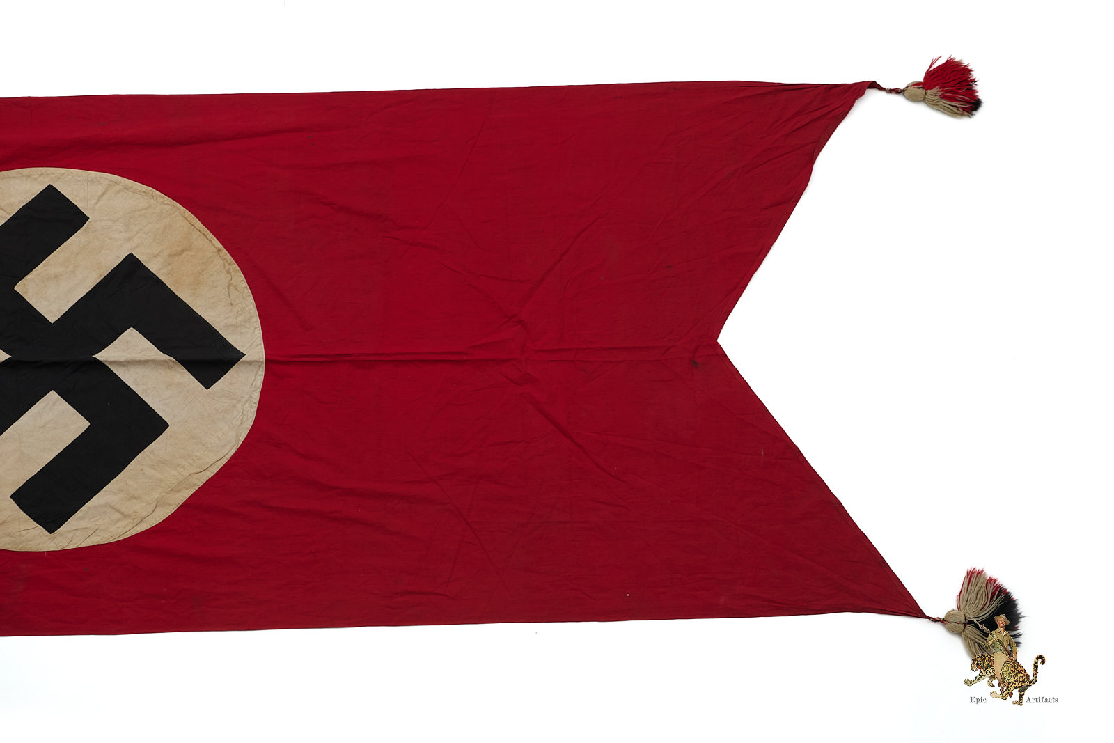 Product Description:  An extremely impressive and large German National Banner, measuring nearly 10 feet in length, often referred to as a “Party Flag” or “NSDAP Flag.” While commonly associated with Nazi Party rallies, this design was in fact the official national flag of Germany during the Third Reich.