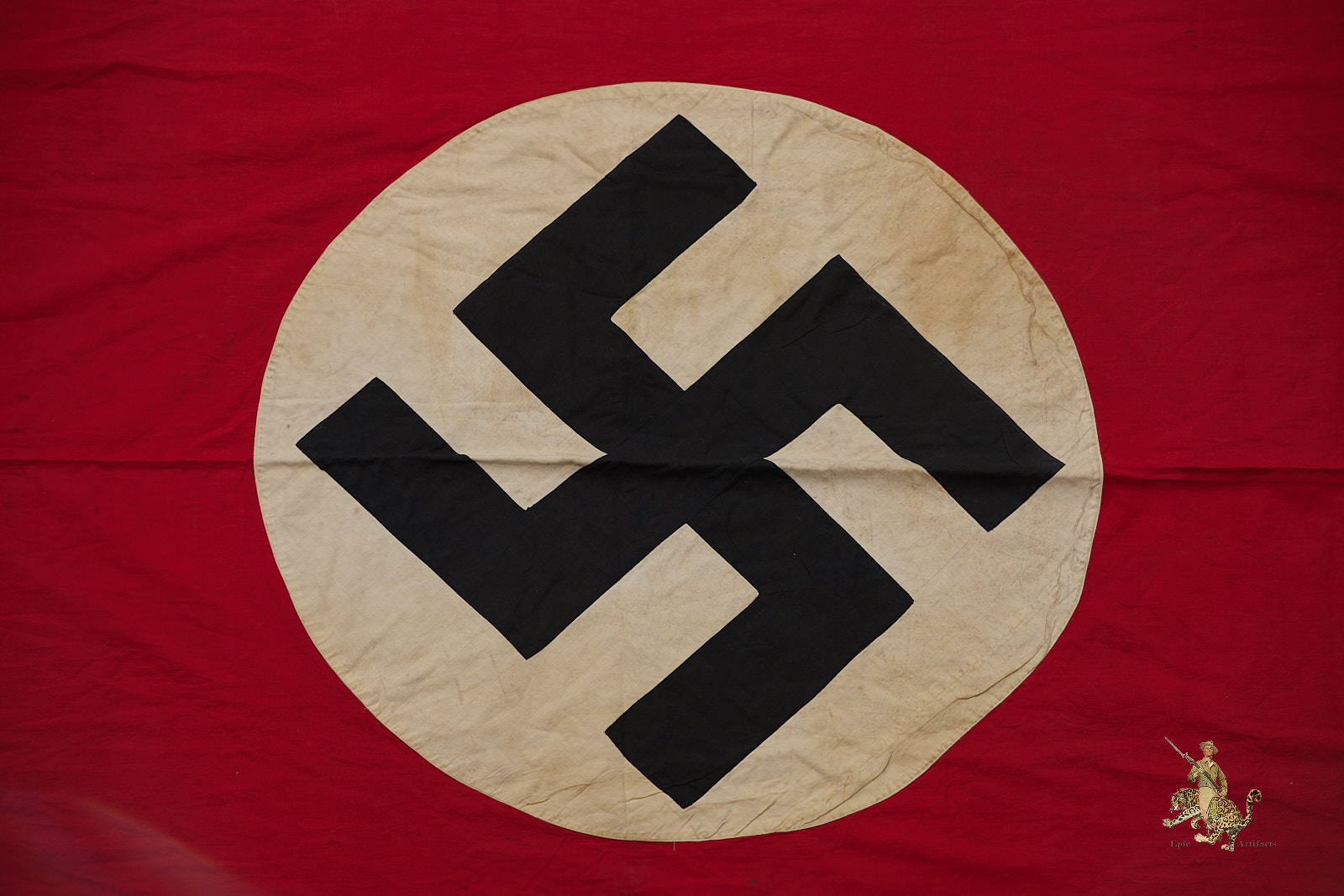 Historical Description: The red flag with white central disk and black swastika was introduced by Hitler in the 1920s as the flag of the National Socialist political party. In 1933, shortly after the Nazis took power, this party flag was recognized alongside the black-white-red Imperial tricolor as one of Germany’s national flags. In 1935, the use of the tricolor flag was discontinued, and between September 1935 and May 8, 1945, the Nazi party flag was the sole national flag of Germany. From its creation in the 1920s through the end of the war, this swastika flag was made and used in endless variations, from the massive banners hung at Party Day rallies to small pennants, bunting flags, and hand-held paper flags distributed along parade routes. These flags, banners and pennants flew from ships, were hung from official and private buildings, and were displayed outside business and private homes. At the end of WWII, the Allied military governments abolished the use of all Nazi symbols, including the national flag. Most Third Reich era German national flags were simply destroyed.
