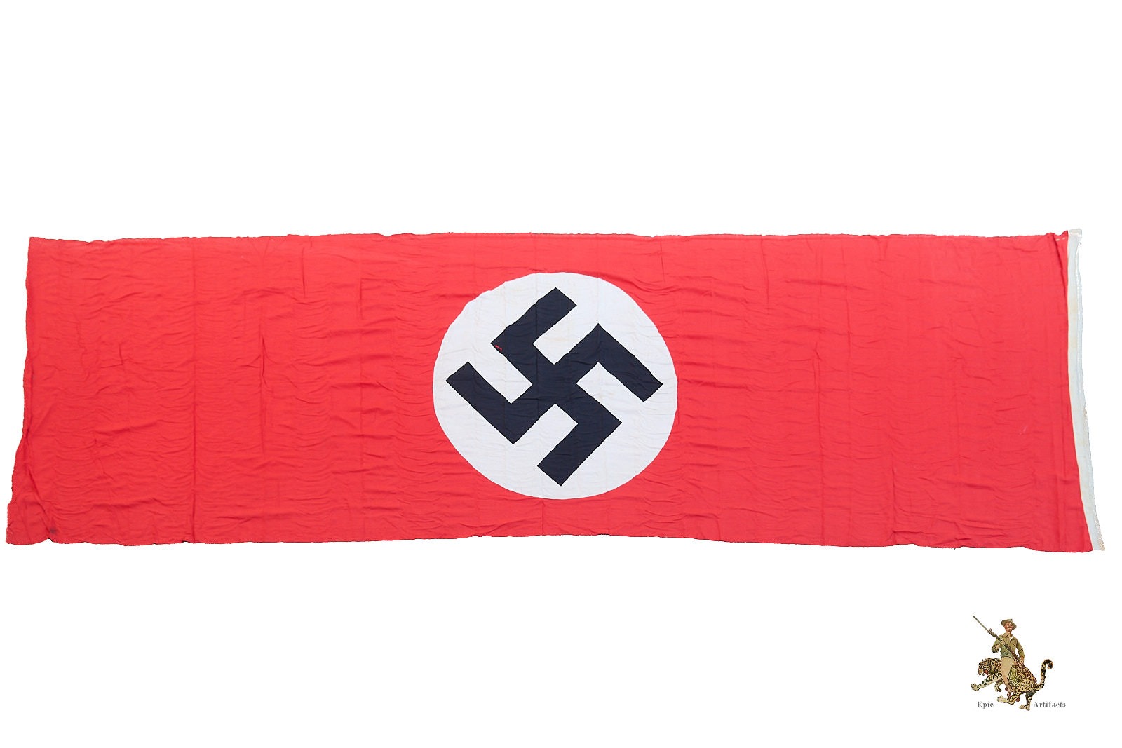 Product Description: This Large NSDAP Banner Flag – 186″ x 54″  has substantial proportions, a striking National Socialist German Workers’ Party (NSDAP) banner is executed in a traditional vertical format, likely intended for display from a building façade or similar architectural feature. Each side features a separately applied central white field printed with a black swastika, emblematic of the era’s iconography. The textile remains in excellent condition overall, exhibiting only minor flaws and fraying toward the lower edge, commensurate with age and prior use.