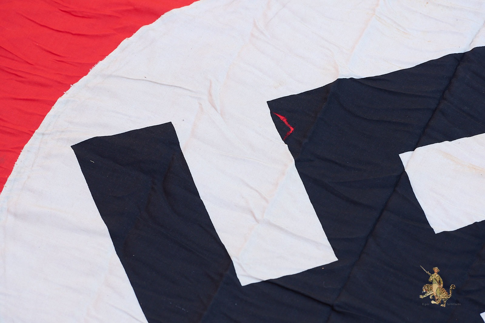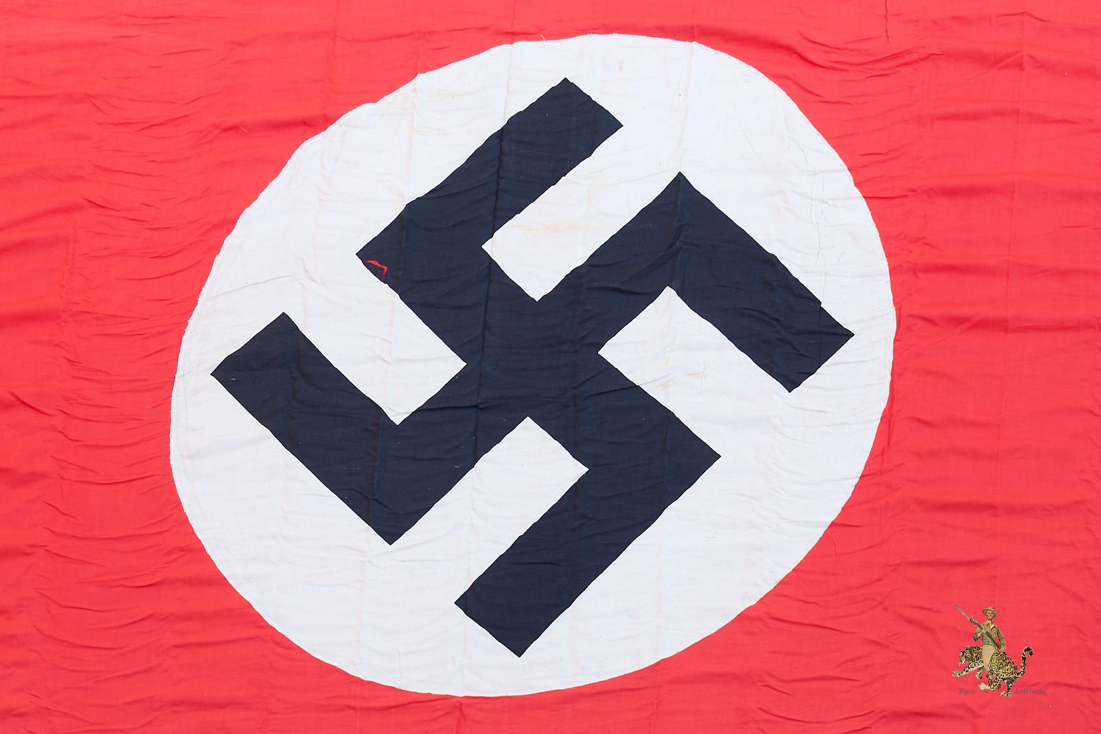 Historical Description: The red flag with white central disk and black swastika was introduced by Hitler in the 1920s as the flag of the National Socialist political party. In 1933, shortly after the Nazis took power, this party flag was recognized alongside the black-white-red Imperial tricolor as one of Germany’s national flags. In 1935, the use of the tricolor flag was discontinued, and between September 1935 and May 8, 1945, the Nazi party flag was the sole national flag of Germany. From its creation in the 1920s through the end of the war, this swastika flag was made and used in endless variations, from the massive banners hung at Party Day rallies to small pennants, bunting flags, and hand-held paper flags distributed along parade routes. These flags, banners and pennants flew from ships, were hung from official and private buildings, and were displayed outside business and private homes. At the end of WWII, the Allied military governments abolished the use of all Nazi symbols, including the national flag. Most Third Reich era German national flags were simply destroyed.