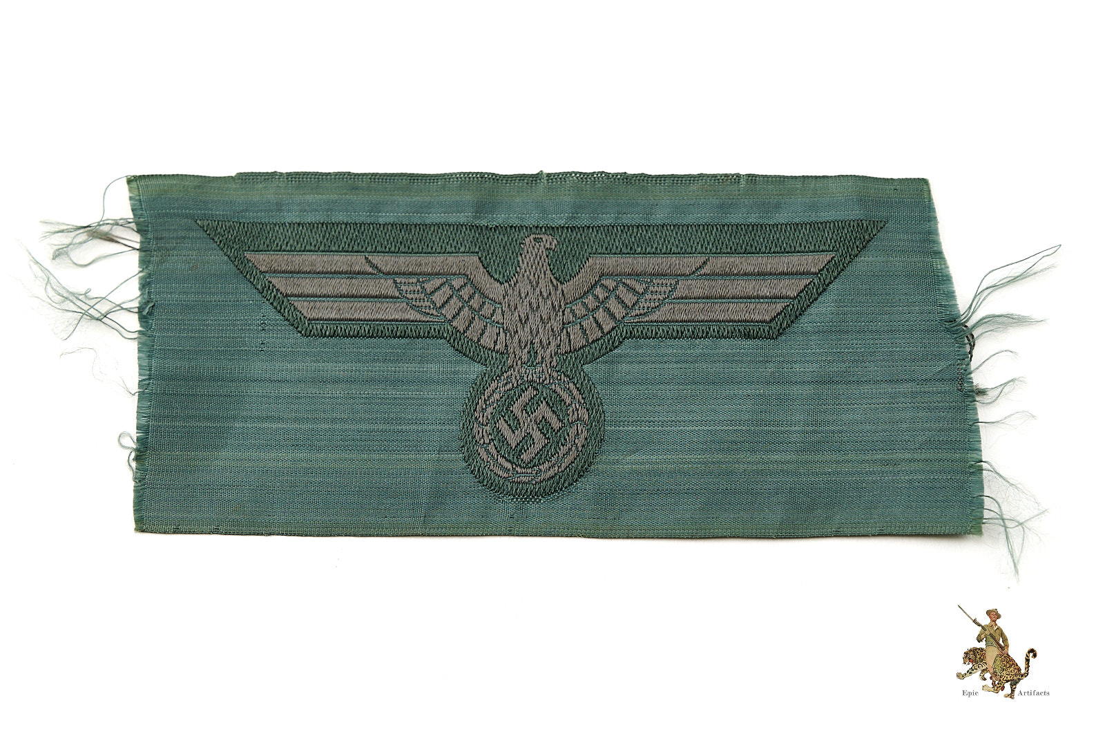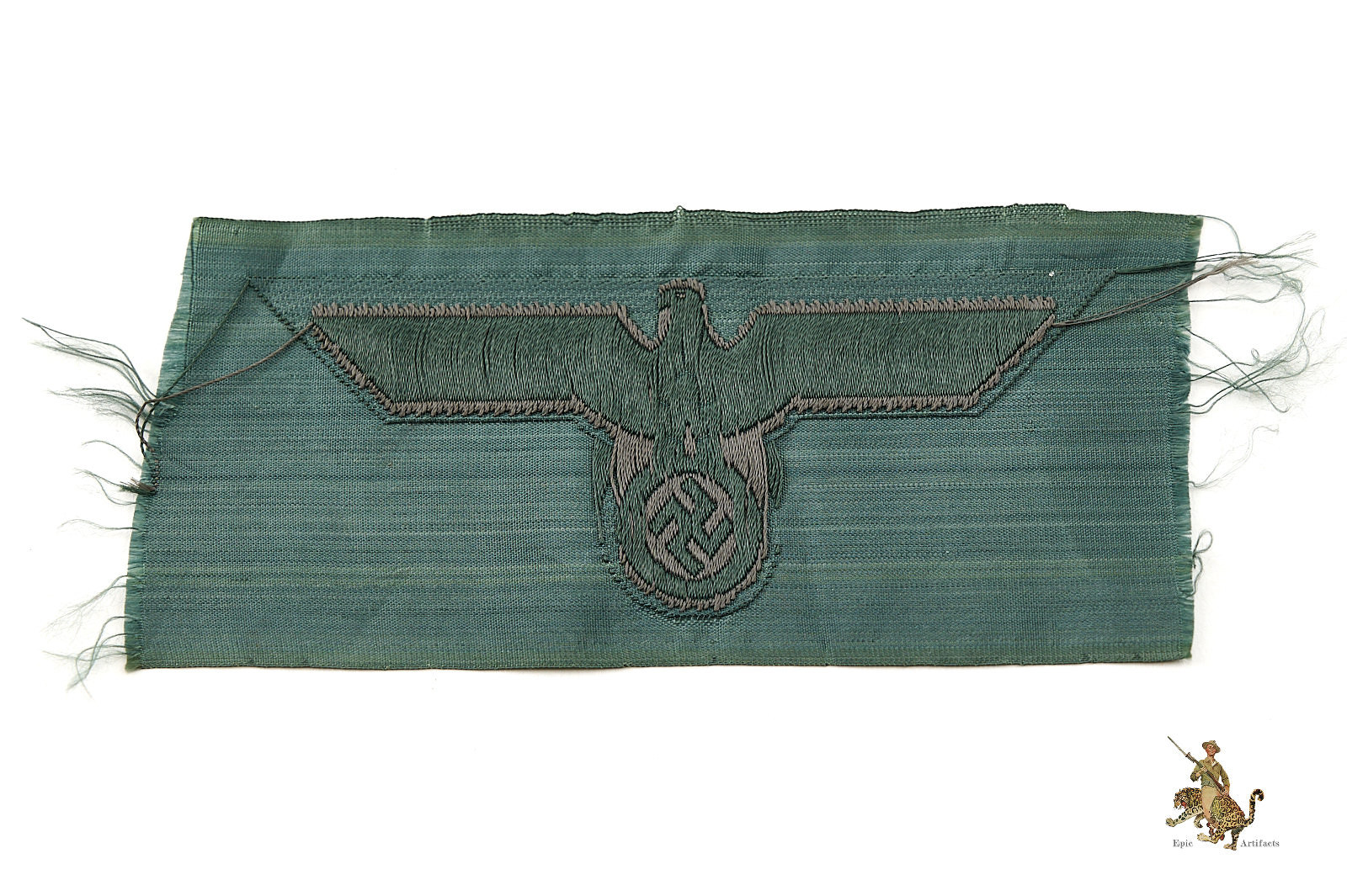 Historical Description: The German Armed Forces (Wehrmacht), as formed in 1935, and as they existed until the end of World War 2, consisted of the Army (Heer), the Air Force (Luftwaffe) and the Navy (Kriegsmarine). The Waffen-SS fell under the command of the Wehrmacht during the war. Each of these branches of service had a unique eagle design that was worn on both the formal dress and parade uniforms, and the field uniforms, of the members of that branch. These eagles were worn on soft headgear, including service and field caps, as well as on the uniform jacket. In the Heer, the Luftwaffe, and the Kriegsmarine, this eagle was worn on the chest of the tunic; collectors have termed these “breast eagles.” The Heer and the Luftwaffe generally used the same eagle style, though variations in color of the eagle or the backing distinguish between the two. The Luftwaffe used their own flying eagle emblem. The Waffen-SS sleeve eagle (and cap eagle) had wings that came to a distinctive tapered point. The cap, breast and sleeve eagles used by the various military branches were manufactured in many variations. There were machine-woven and machine embroidered versions, usually used by officers and NCOs. Hand-embroidered bullion wire eagles were typically for officers. There were metal eagles, for caps, or for uniforms that were intended to have detachable insignia. There were even eagles embroidered on camouflage fabric, intended for use on special field uniforms. There were also eagles in specific colors for use on tropical uniforms. Some of these eagles were mass-produced, and are still common today; others were and are very rare.</
