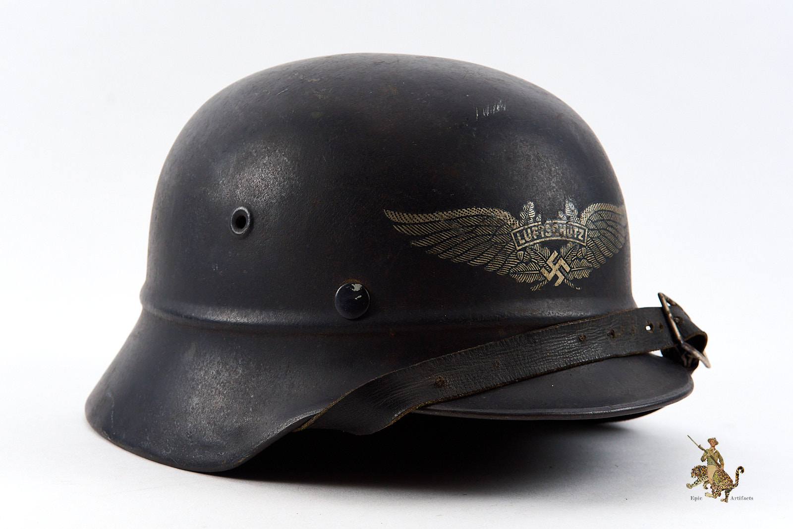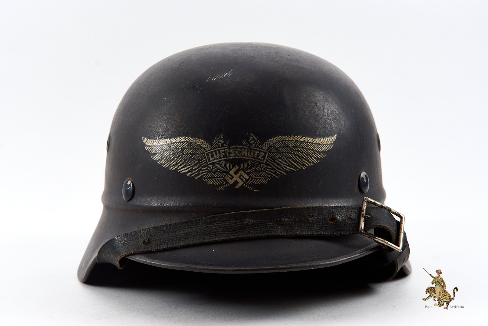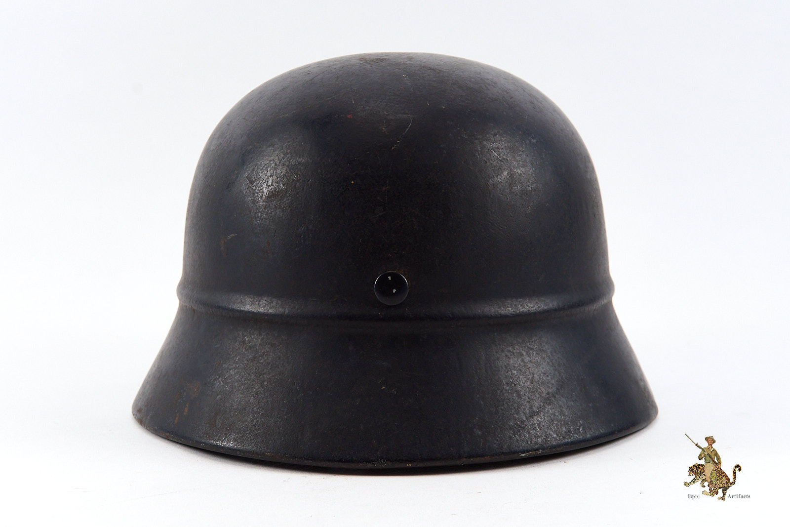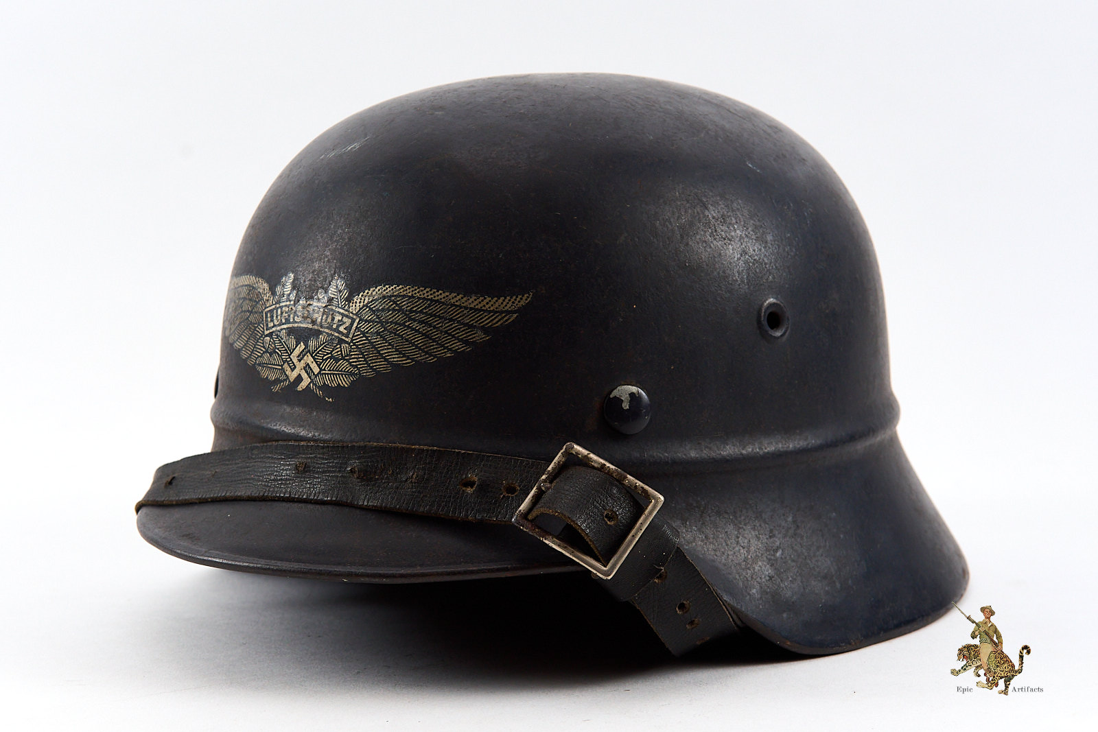 Historical Description: The German steel helmet was introduced in WWI. After that war, most German paramilitary and civil uniformed organizations wore surplus WWI style helmets, sometimes repainted or with newly added organizational logos. With the Nazi rise to power in 1933, the size of the various German organizations was greatly increased, resulting in greater demand for helmets than could be filled with WWI surplus. As a result, a variety of new helmet types were created to fill this demand. Some of the new helmets were commercially available and could be individually purchased. Others were intended for issue by various organizations. Most of these helmets were copies of the WWI type helmets, including the SS-RZM helmet of the early 1930s. In 1934, a new helmet type was created for use by German police, fire protection crews, and other organizations. Known to collectors as the M34, it featured a liner with integral chinstrap, a lower profile than the WWI helmets, and “salt shaker” style air vents instead of the earlier “Frankenstein” lugs. Other helmets were produced that followed this same general pattern and were used by the Luftschutz and other organizations. In military organizations, all earlier patterns were generally replaced in 1935 by the new M35 helmet. But earlier versions continued to be used as parade helmets, and civil organizations used variations of these early helmets until 1945 and in some cases, even later.