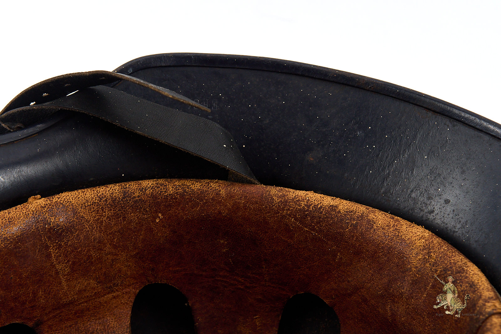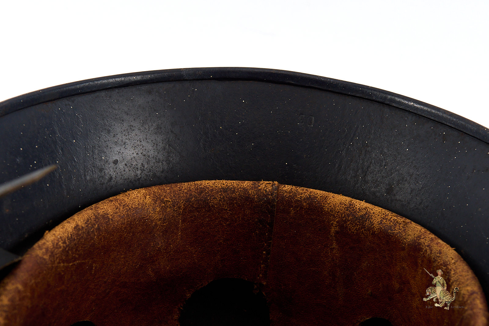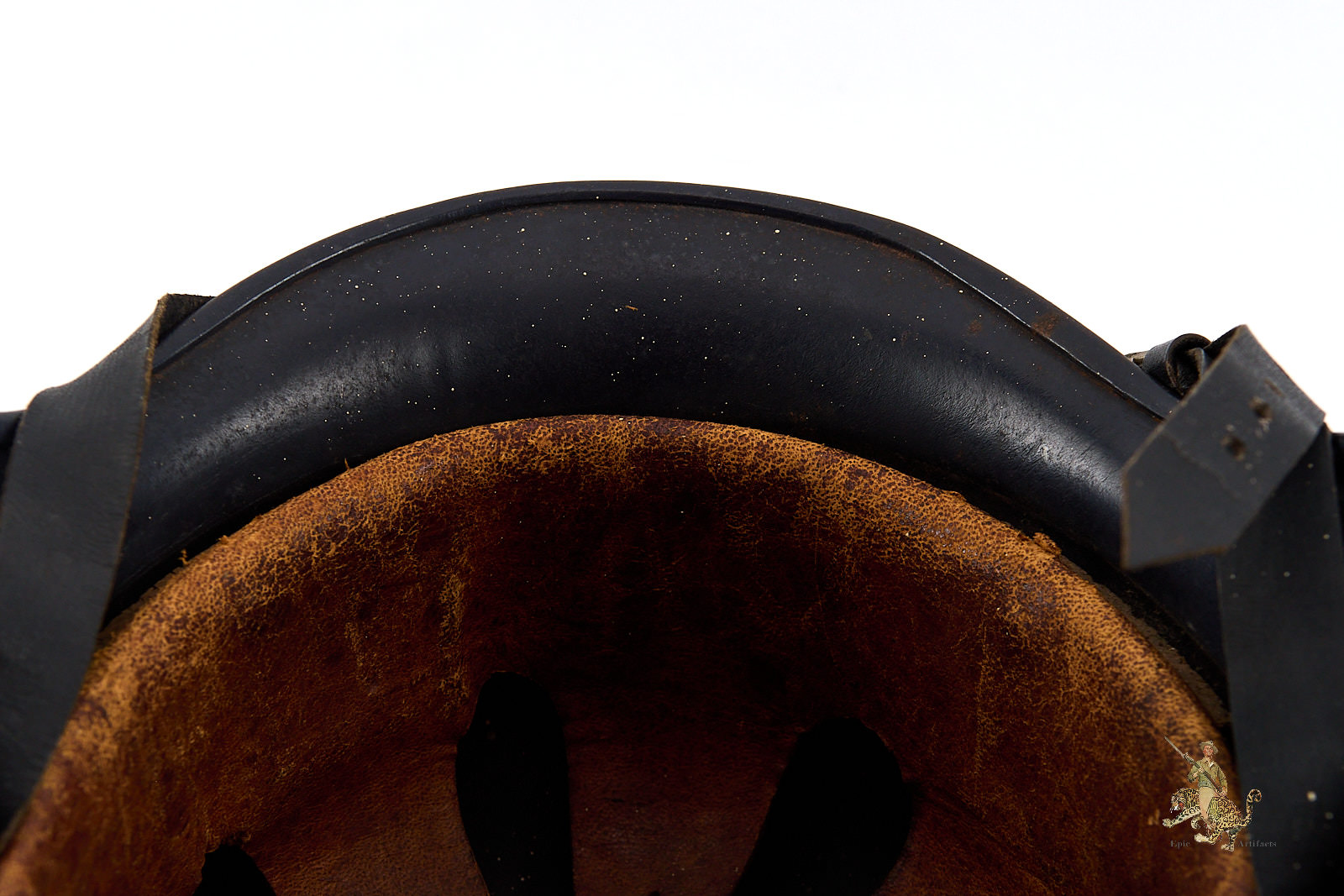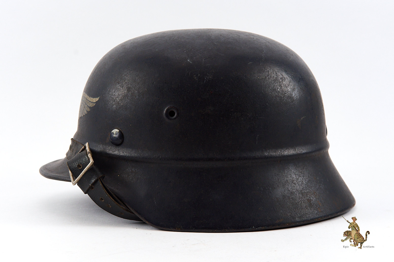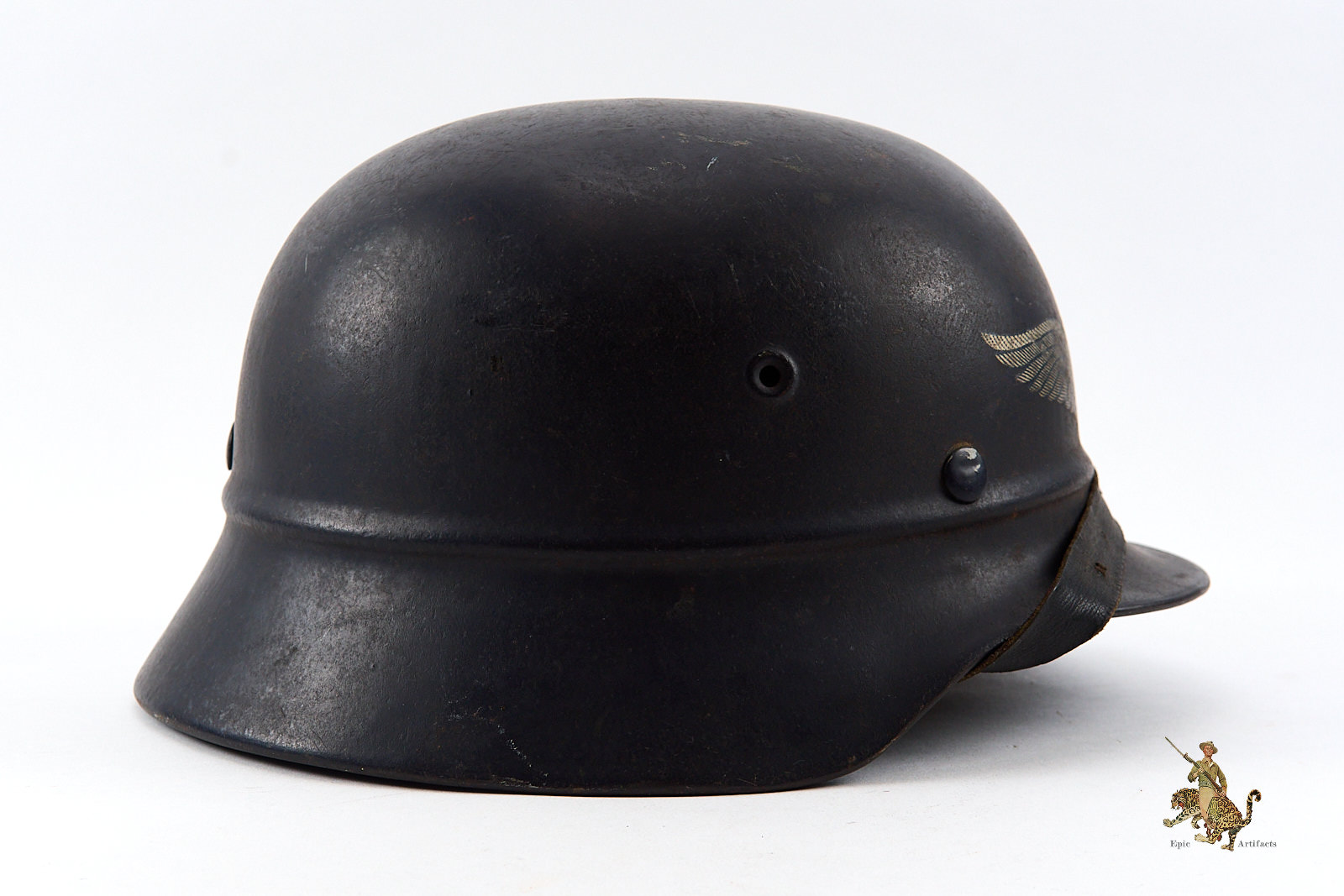 Historical Description: The German steel helmet was introduced in WWI. After that war, most German paramilitary and civil uniformed organizations wore surplus WWI style helmets, sometimes repainted or with newly added organizational logos. With the Nazi rise to power in 1933, the size of the various German organizations was greatly increased, resulting in greater demand for helmets than could be filled with WWI surplus. As a result, a variety of new helmet types were created to fill this demand. Some of the new helmets were commercially available and could be individually purchased. Others were intended for issue by various organizations. Most of these helmets were copies of the WWI type helmets, including the SS-RZM helmet of the early 1930s. In 1934, a new helmet type was created for use by German police, fire protection crews, and other organizations. Known to collectors as the M34, it featured a liner with integral chinstrap, a lower profile than the WWI helmets, and “salt shaker” style air vents instead of the earlier “Frankenstein” lugs. Other helmets were produced that followed this same general pattern and were used by the Luftschutz and other organizations. In military organizations, all earlier patterns were generally replaced in 1935 by the new M35 helmet. But earlier versions continued to be used as parade helmets, and civil organizations used variations of these early helmets until 1945 and in some cases, even later.