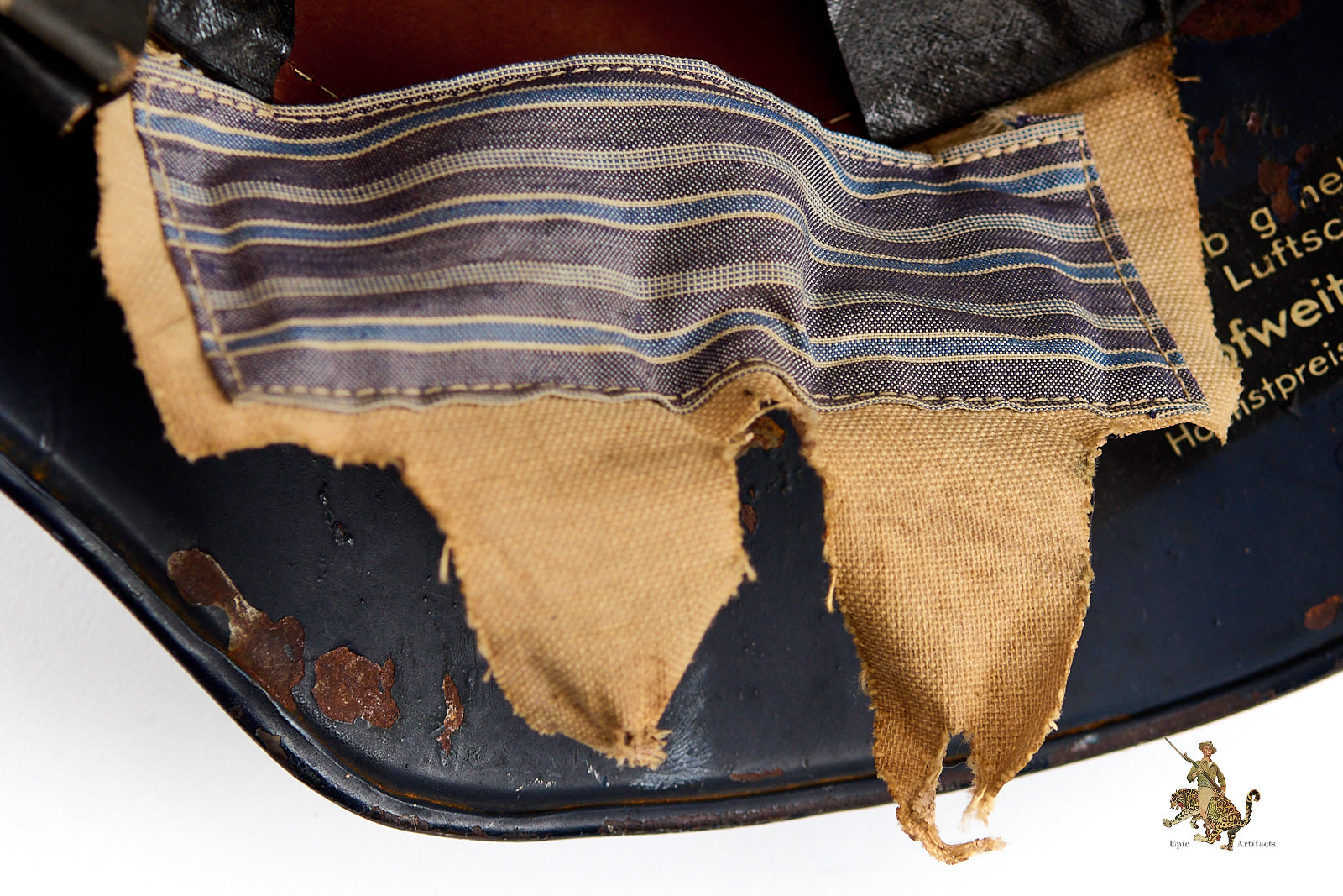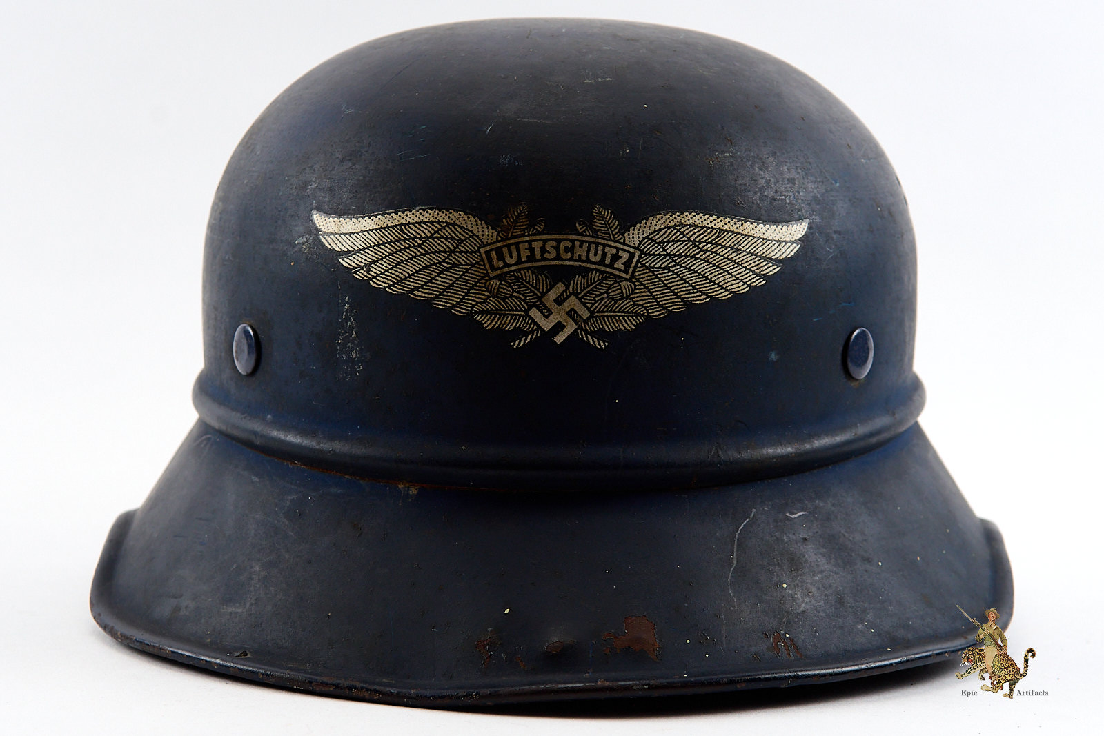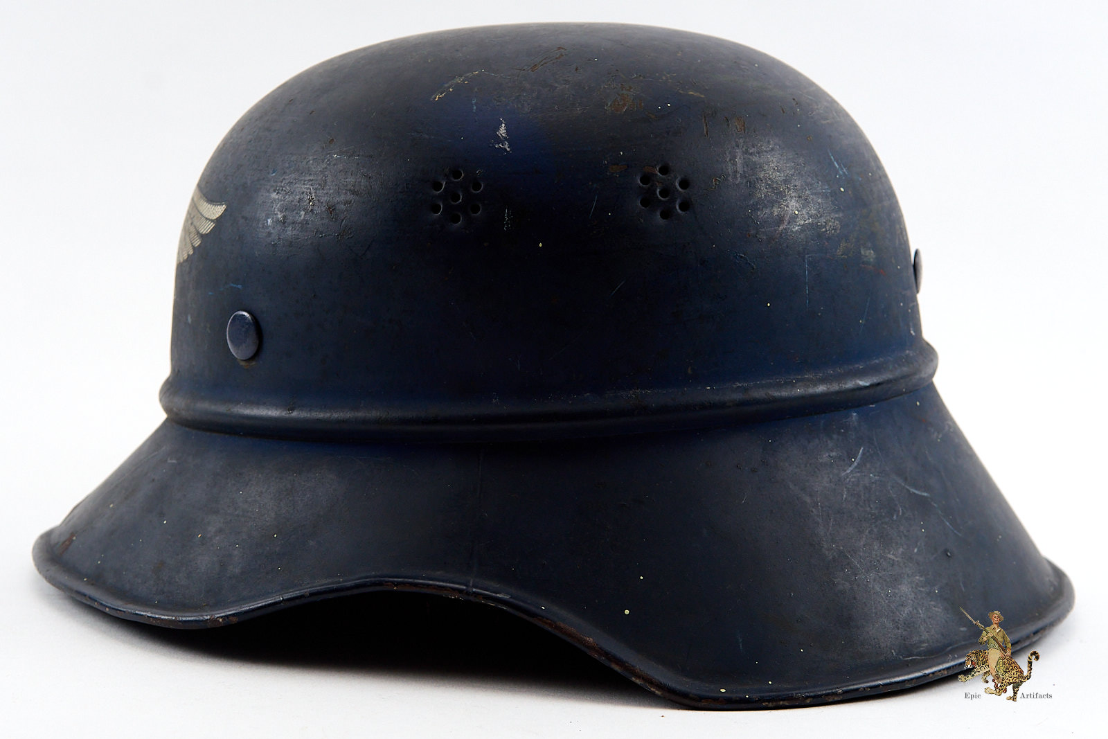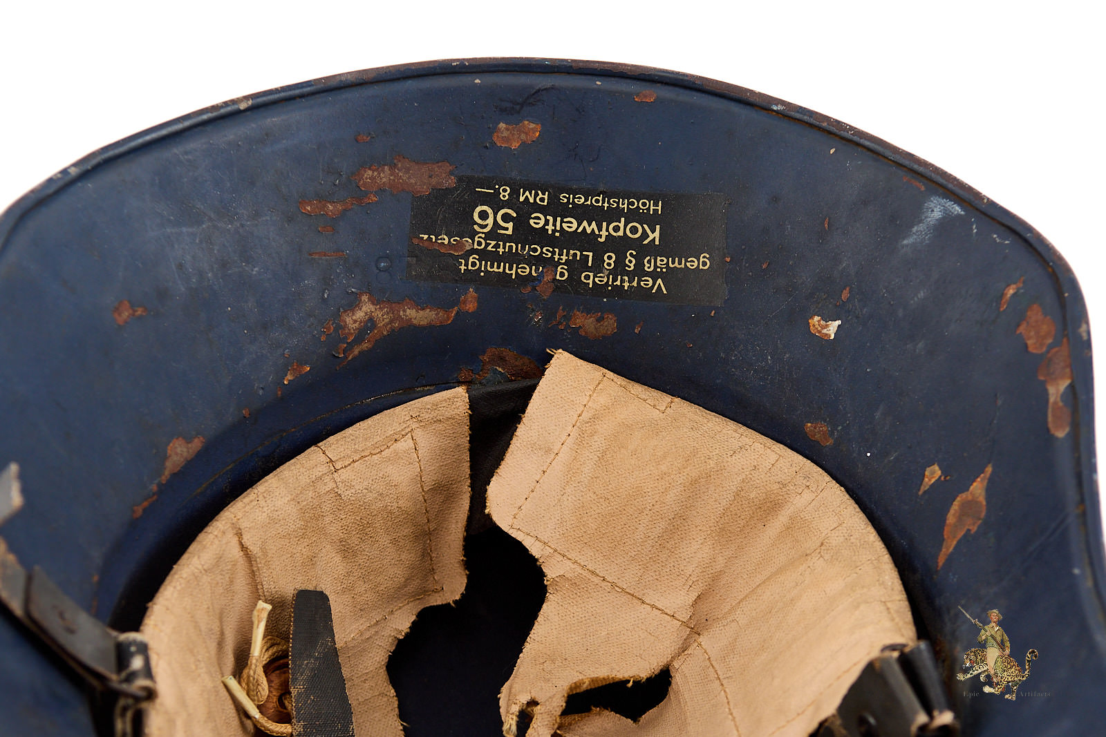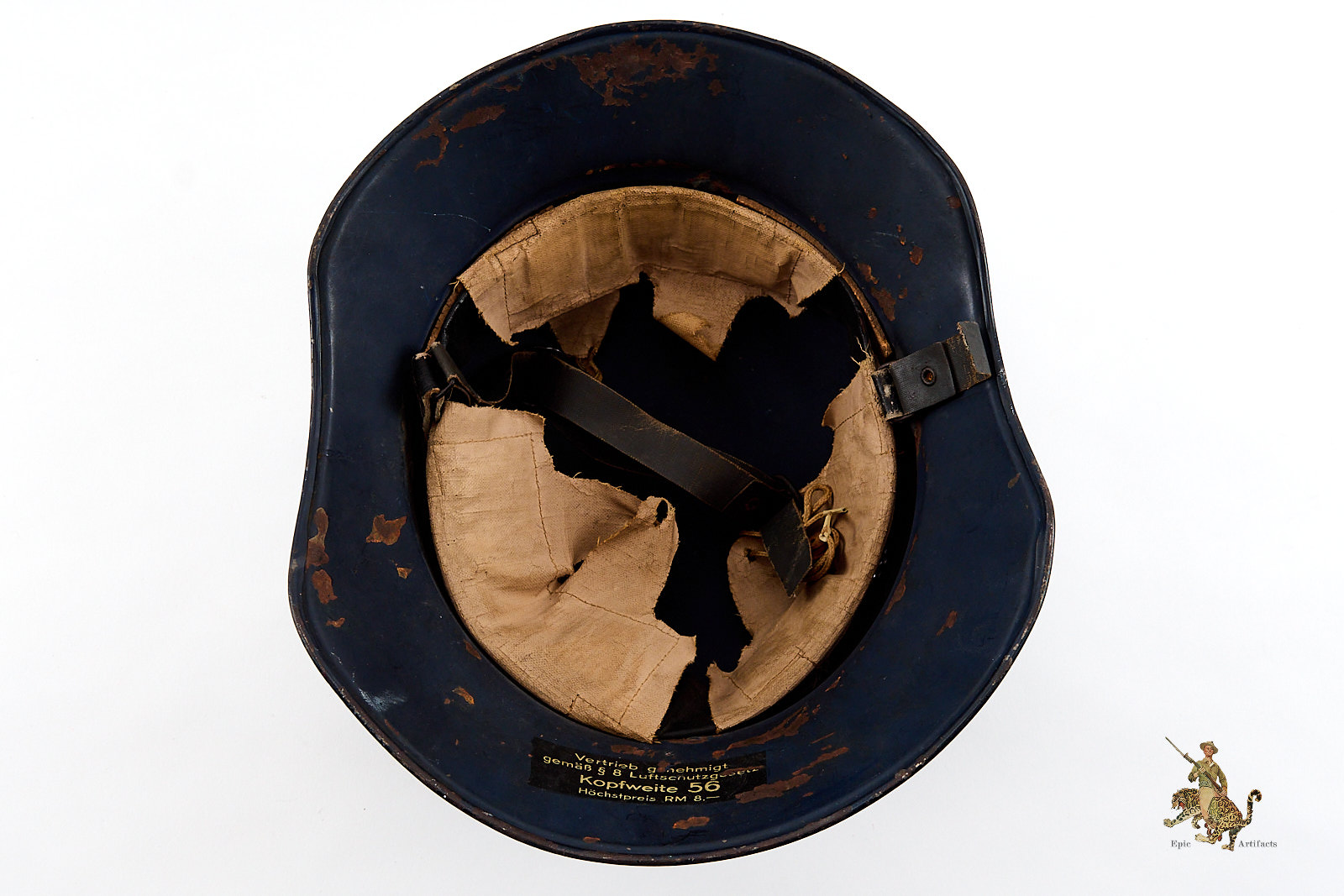 Product Description: This Luftschutz M38 3 Piece Gladiator Helmet is a one-look all-original example of this helmet type. These helmets were worn by many types of civil functionaries including air raid wardens and some members of police and fire organizations. The shell is a three-piece version, and retains nearly all of the original smooth blue paint. Helmet is mostly free from dents, but the front edge show some rippling and denting. The exterior paint has an attractive, uncleaned patina. The large and impressive Luftschutz winged swastika decal on the front of the helmet is nearly completely intact. The inside of this German Luftschutz Gladiator Helmet retains its original civil style leather liner and chinstrap, although both show flaws and wear. The liner drawstring has ripped through on several of the liner fingers. The black leather double buckle chin strap is one of several styles used on these gladiator helmets. It is complete, but has broken near one end. The inner paint has several spots of loss and minor corrosion as shown. The inside back shows makers label. This helmet has great character and displays well. The overall condition rates as excellent.