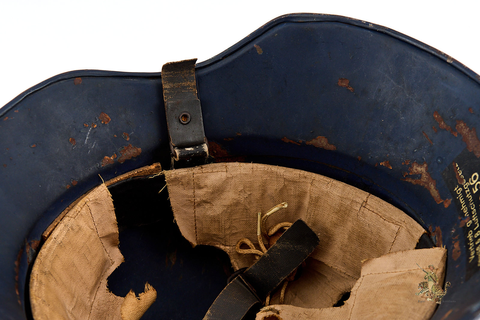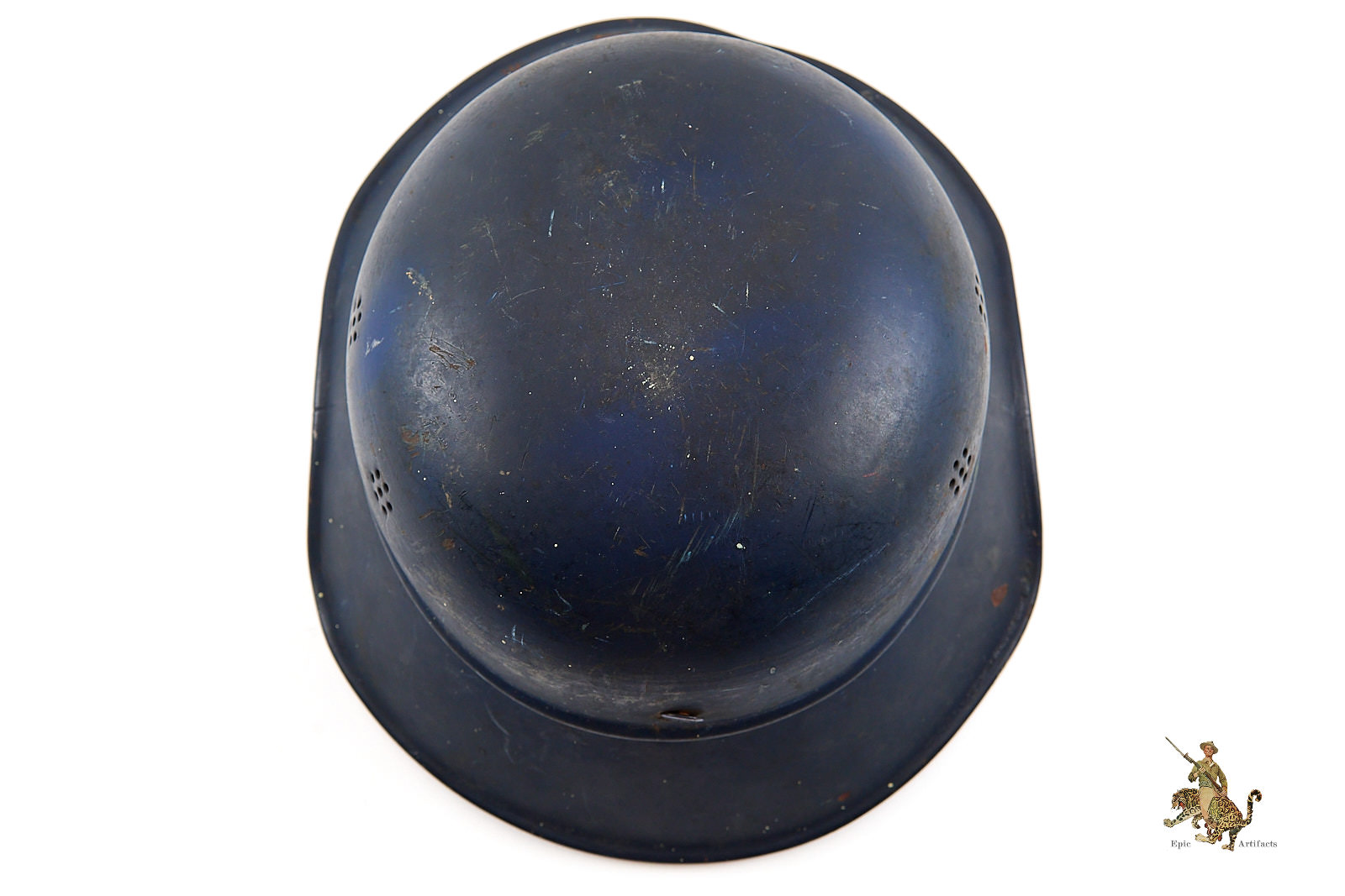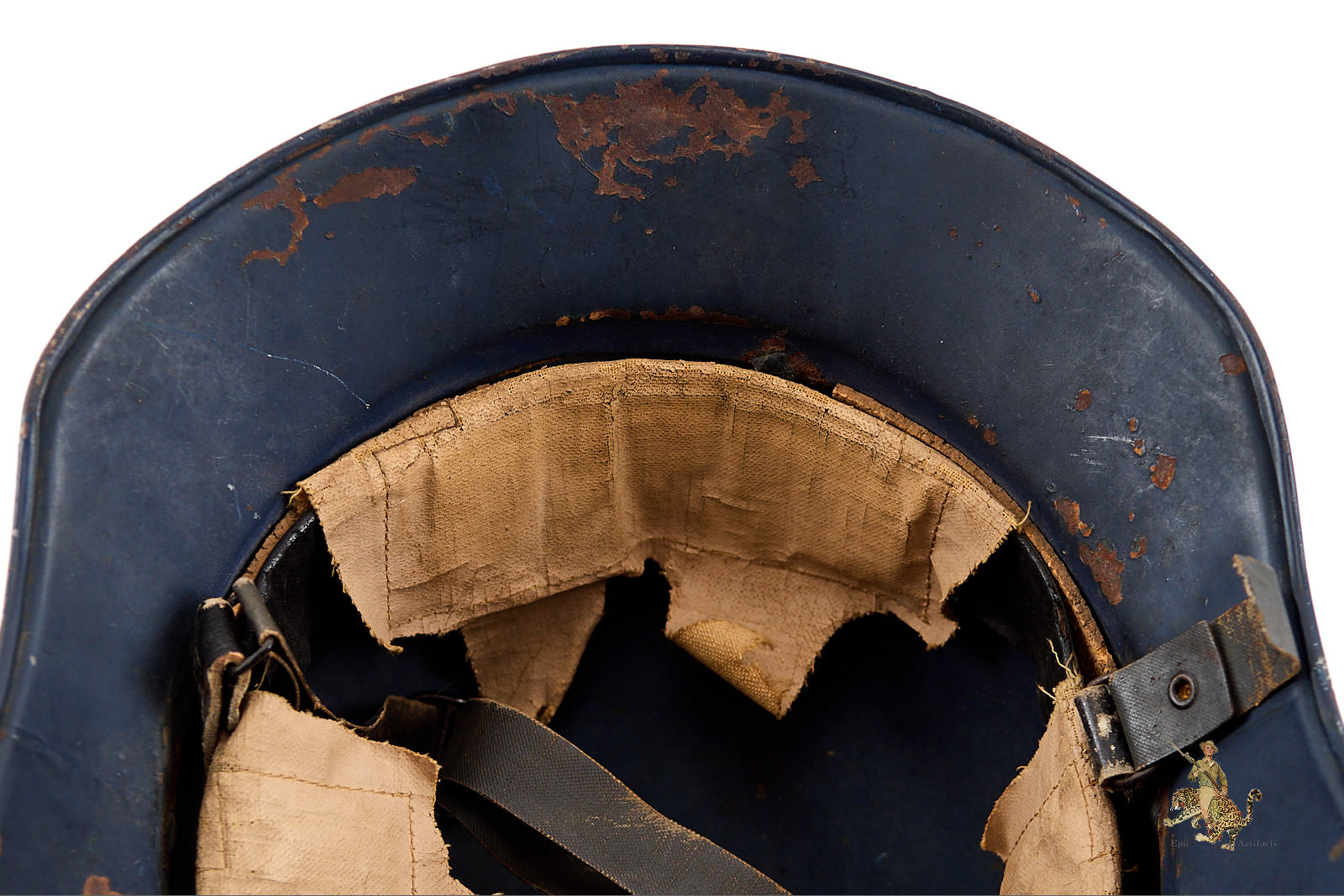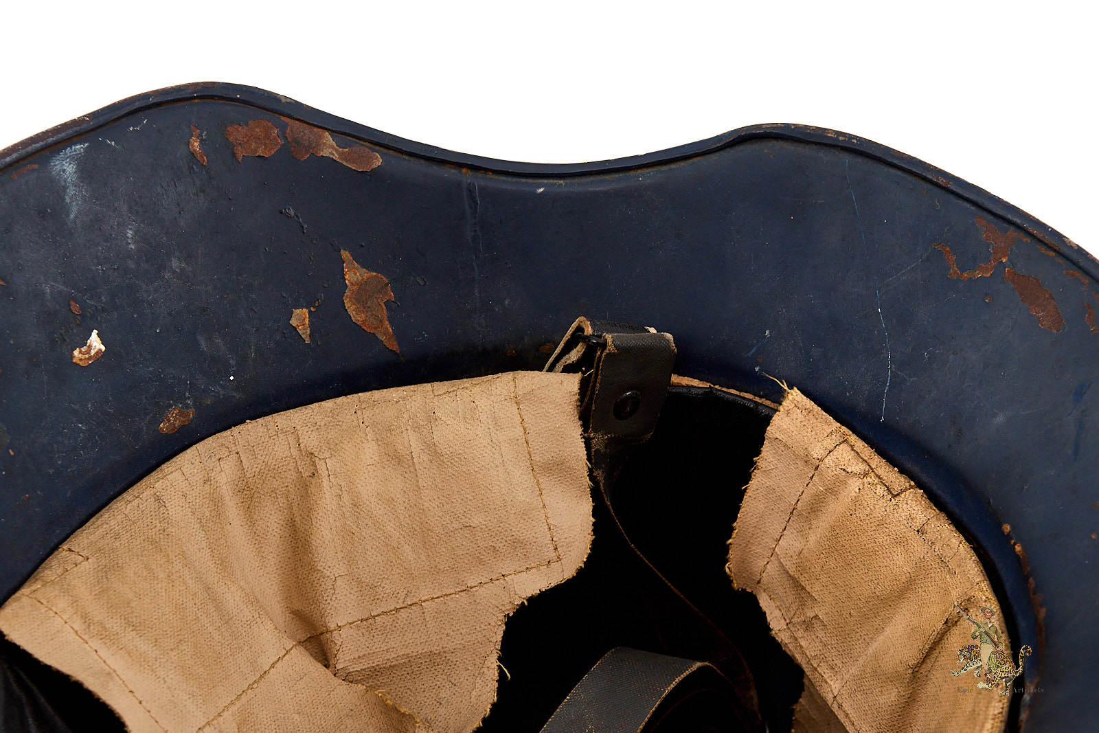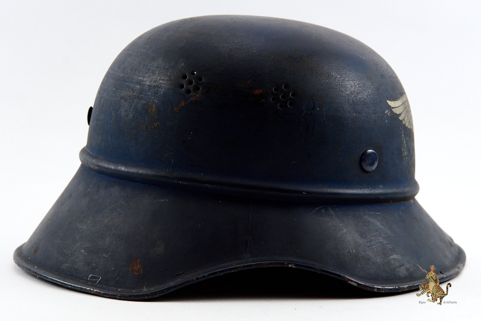 Product Description: This Luftschutz M38 3 Piece Gladiator Helmet is a one-look all-original example of this helmet type. These helmets were worn by many types of civil functionaries including air raid wardens and some members of police and fire organizations. The shell is a three-piece version, and retains nearly all of the original smooth blue paint. Helmet is mostly free from dents, but the front edge show some rippling and denting. The exterior paint has an attractive, uncleaned patina. The large and impressive Luftschutz winged swastika decal on the front of the helmet is nearly completely intact. The inside of this German Luftschutz Gladiator Helmet retains its original civil style leather liner and chinstrap, although both show flaws and wear. The liner drawstring has ripped through on several of the liner fingers. The black leather double buckle chin strap is one of several styles used on these gladiator helmets. It is complete, but has broken near one end. The inner paint has several spots of loss and minor corrosion as shown. The inside back shows makers label. This helmet has great character and displays well. The overall condition rates as excellent.