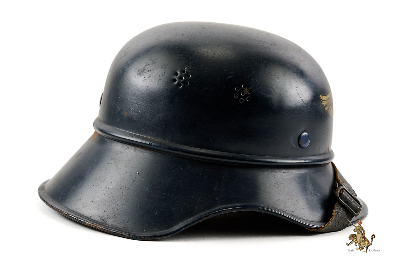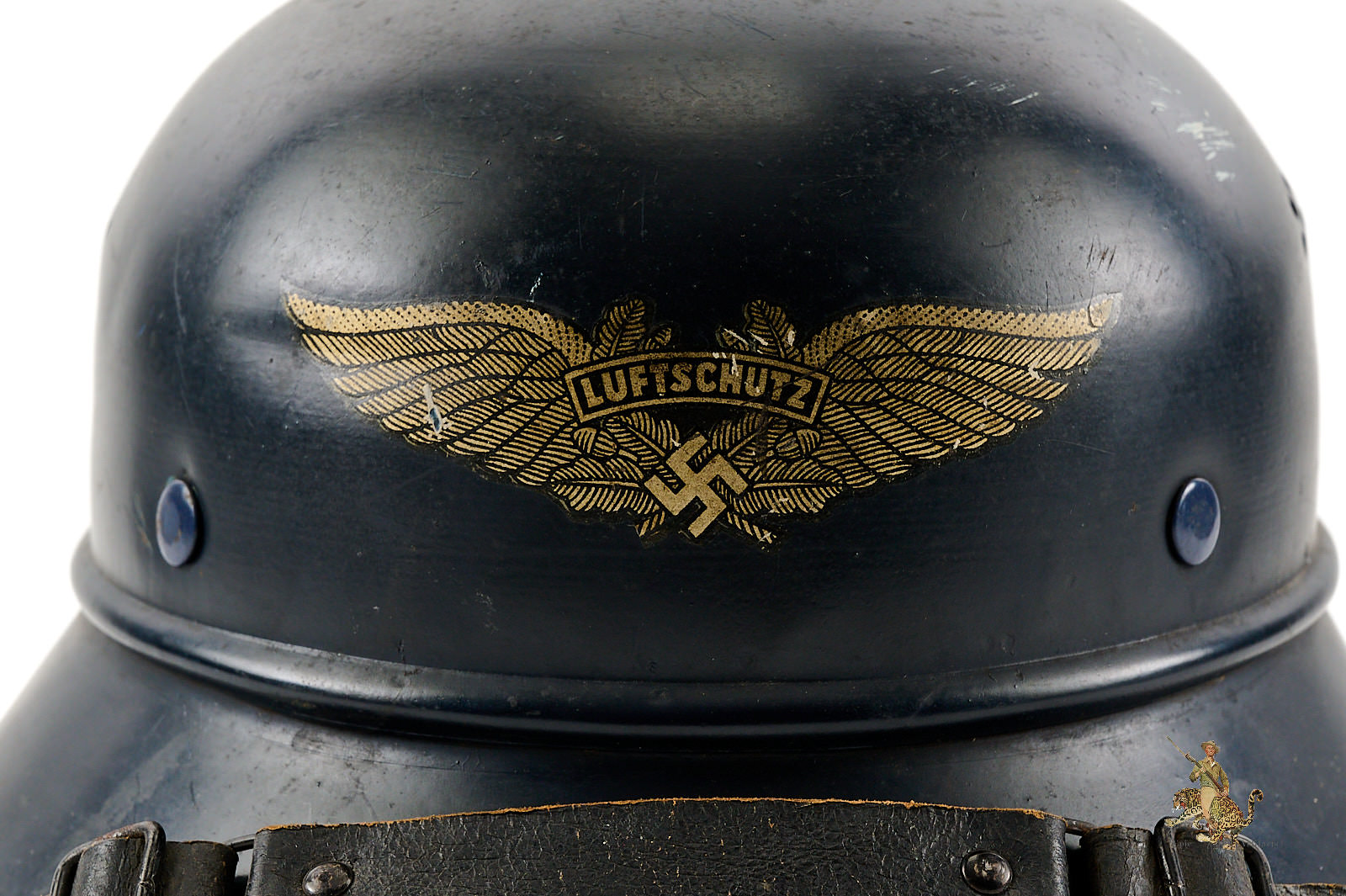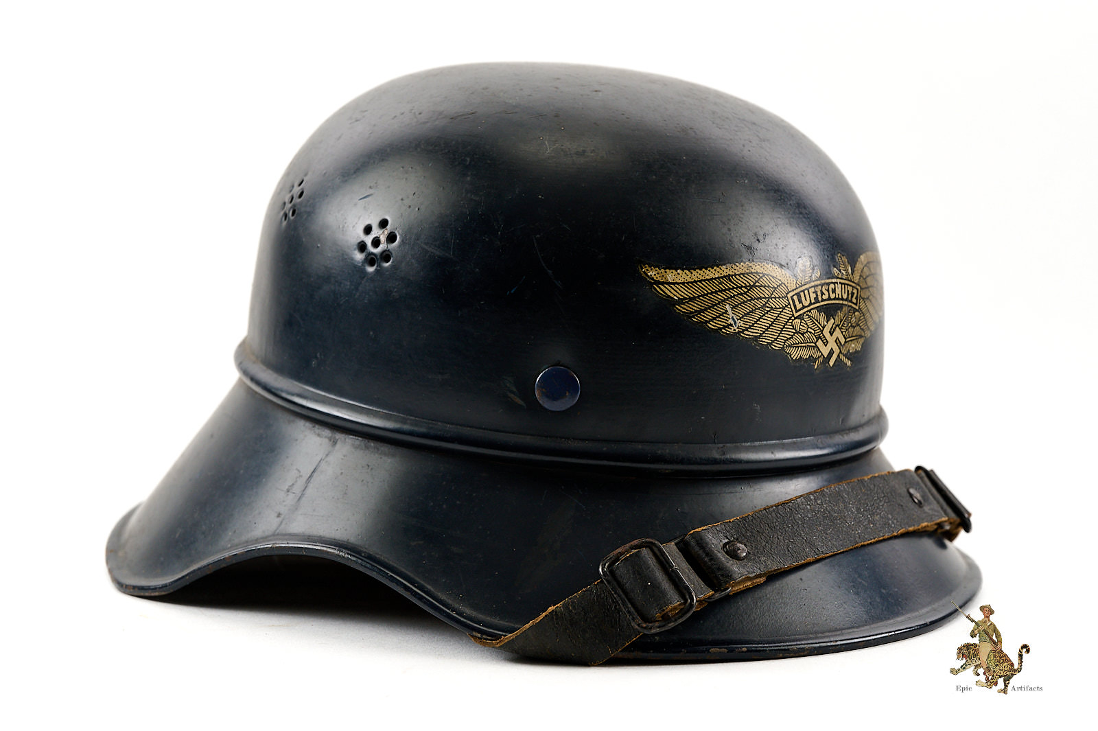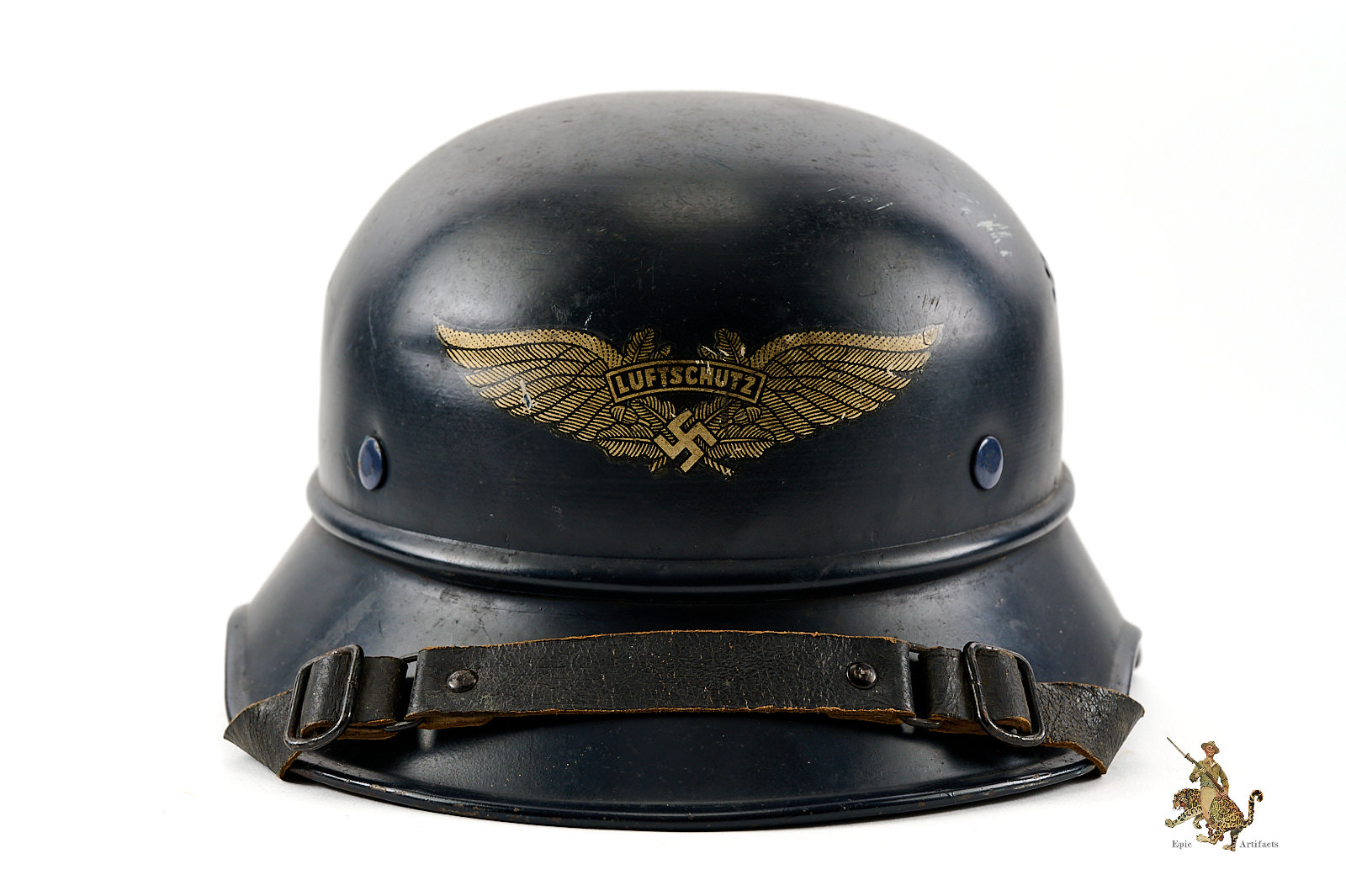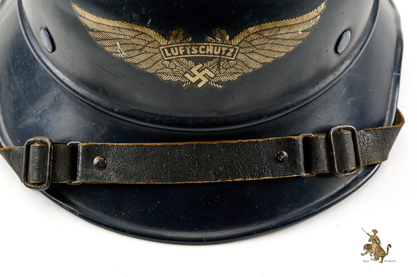 Product Description: This Luftschutz M38 3 Piece Gladiator Helmet is a one-look all-original example of this helmet type. These helmets were worn by many types of civil functionaries including air raid wardens and some members of police and fire organizations. The shell is a three-piece version, and retains nearly all of the original smooth blue paint. Helmet is free from dents and cracking. The exterior paint has an attractive, uncleaned patina. The large and impressive Luftschutz winged swastika decal on the front of the helmet is nearly completely intact. The rear of the helmet shows a spot of corrosion below the bead that carries through to the inside near the support brad. The inside of this German Luftschutz Gladiator Helmet retains its original civil style leather liner and chinstrap. The liner drawstring has been lost to time, and there is some residue of some sort on the front two leather tabs. The black leather double buckle chin strap is one of several styles used on these gladiator helmets. It is complete with minor superficial spidering to the surface. The inner paint has a few spots of loss and minor corrosion as shown. The inside back shows makers label. This helmet has great character and displays well. The overall condition rates as excellent.
