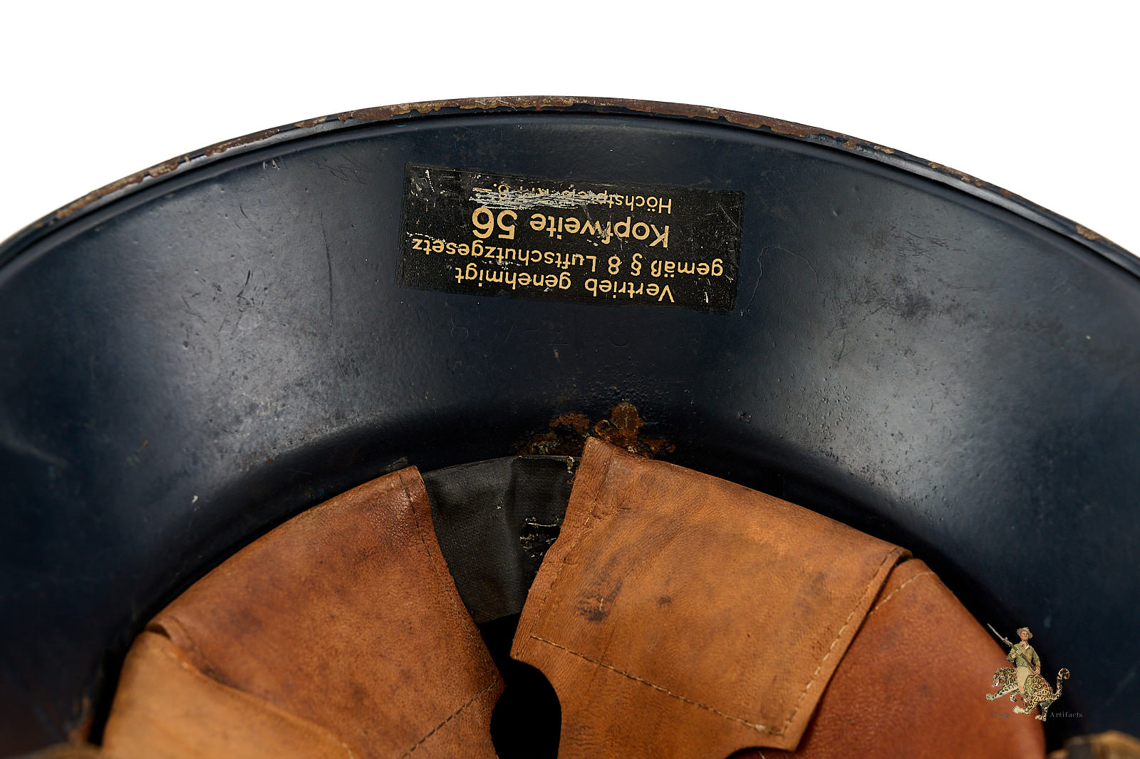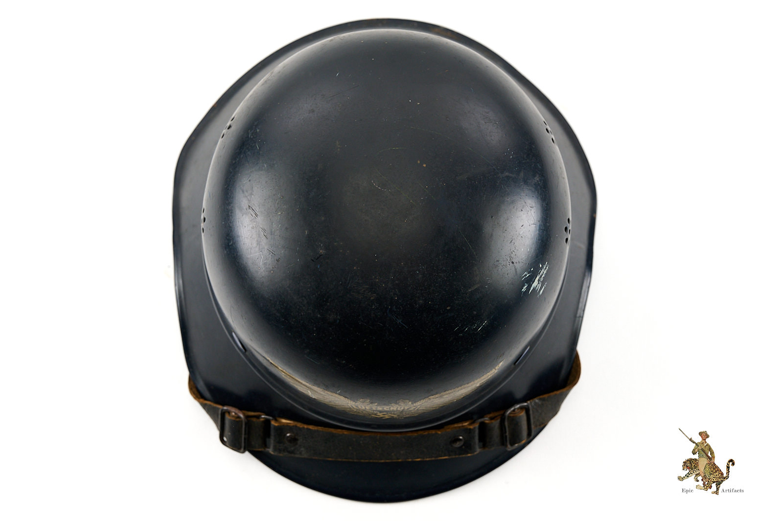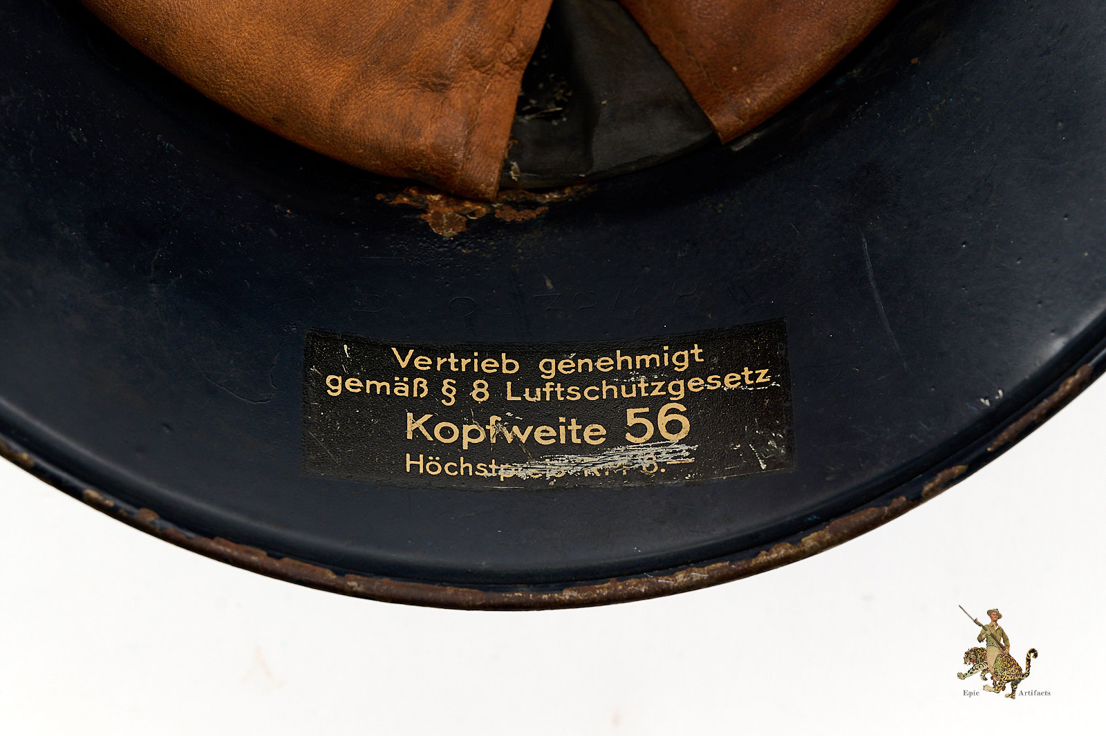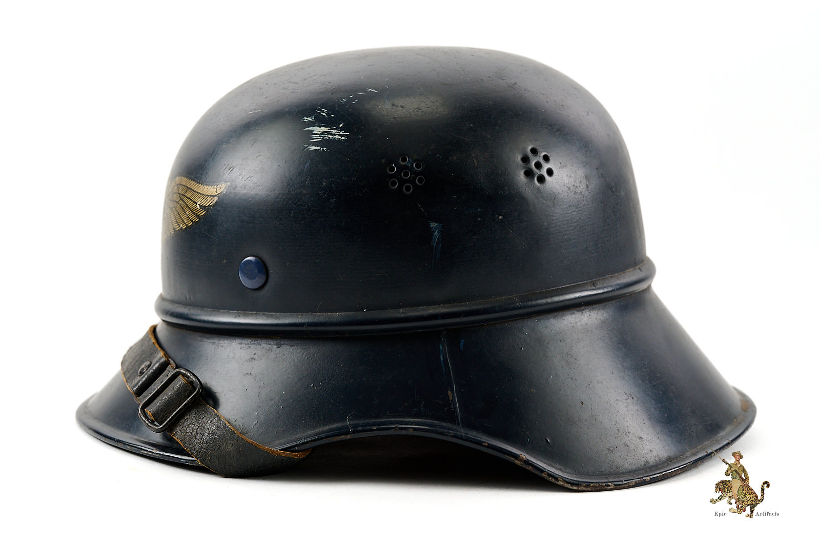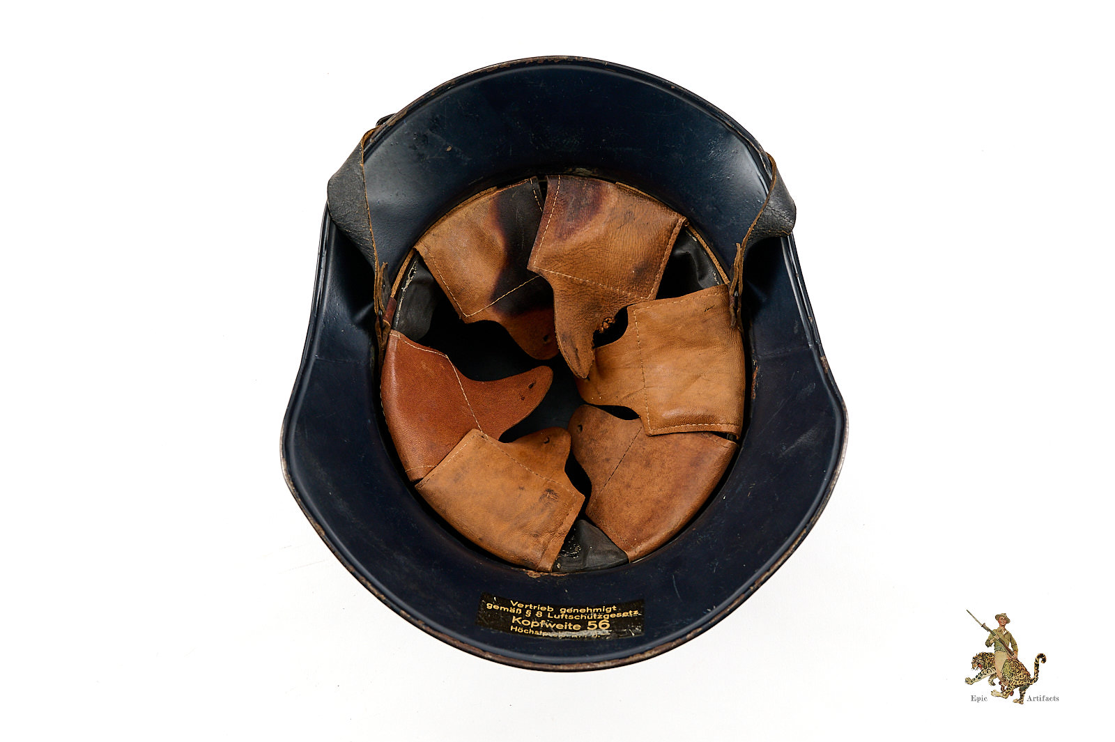 Product Description: This Luftschutz M38 3 Piece Gladiator Helmet is a one-look all-original example of this helmet type. These helmets were worn by many types of civil functionaries including air raid wardens and some members of police and fire organizations. The shell is a three-piece version, and retains nearly all of the original smooth blue paint. Helmet is free from dents and cracking. The exterior paint has an attractive, uncleaned patina. The large and impressive Luftschutz winged swastika decal on the front of the helmet is nearly completely intact. The rear of the helmet shows a spot of corrosion below the bead that carries through to the inside near the support brad. The inside of this German Luftschutz Gladiator Helmet retains its original civil style leather liner and chinstrap. The liner drawstring has been lost to time, and there is some residue of some sort on the front two leather tabs. The black leather double buckle chin strap is one of several styles used on these gladiator helmets. It is complete with minor superficial spidering to the surface. The inner paint has a few spots of loss and minor corrosion as shown. The inside back shows makers label. This helmet has great character and displays well. The overall condition rates as excellent.