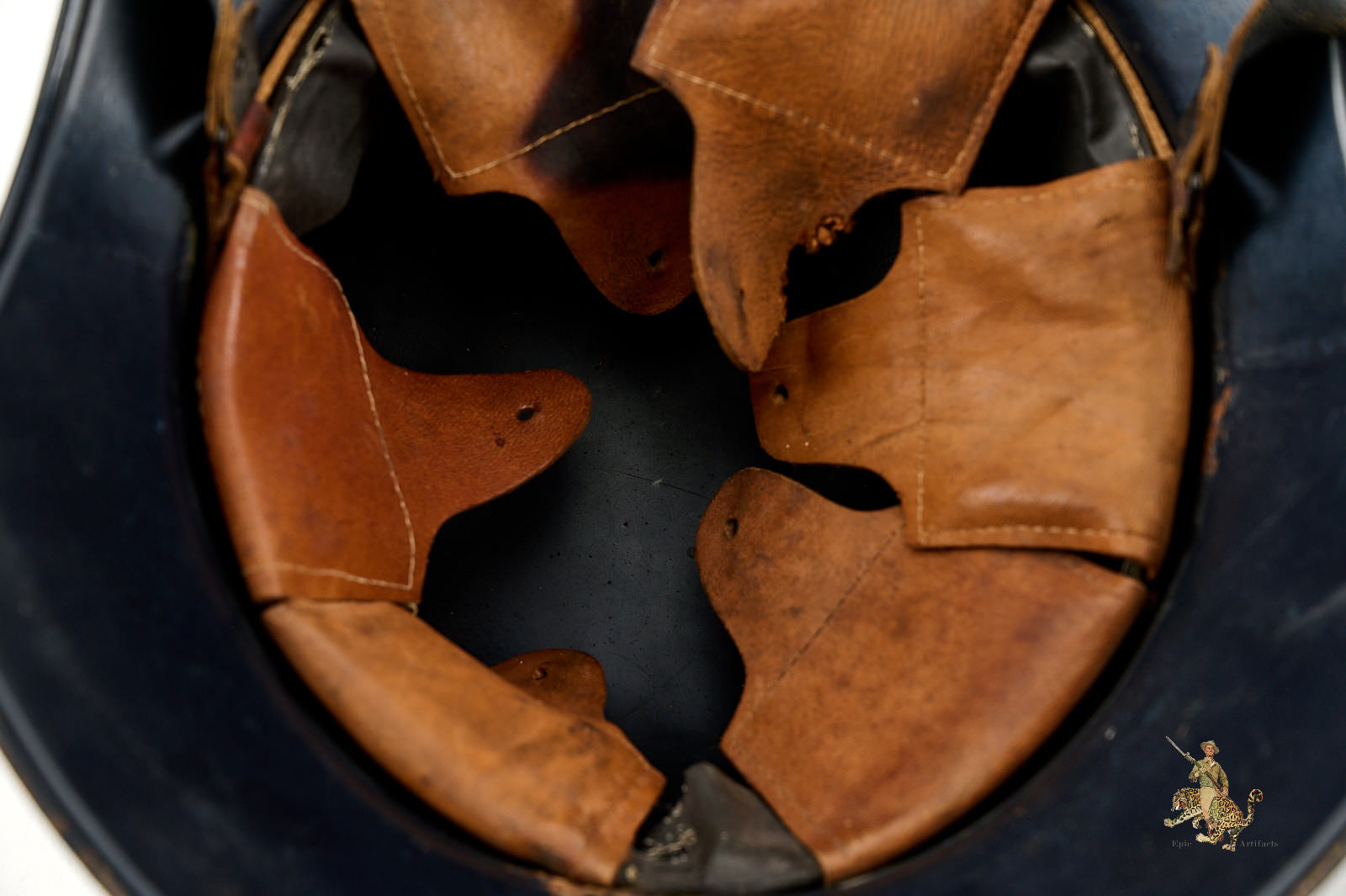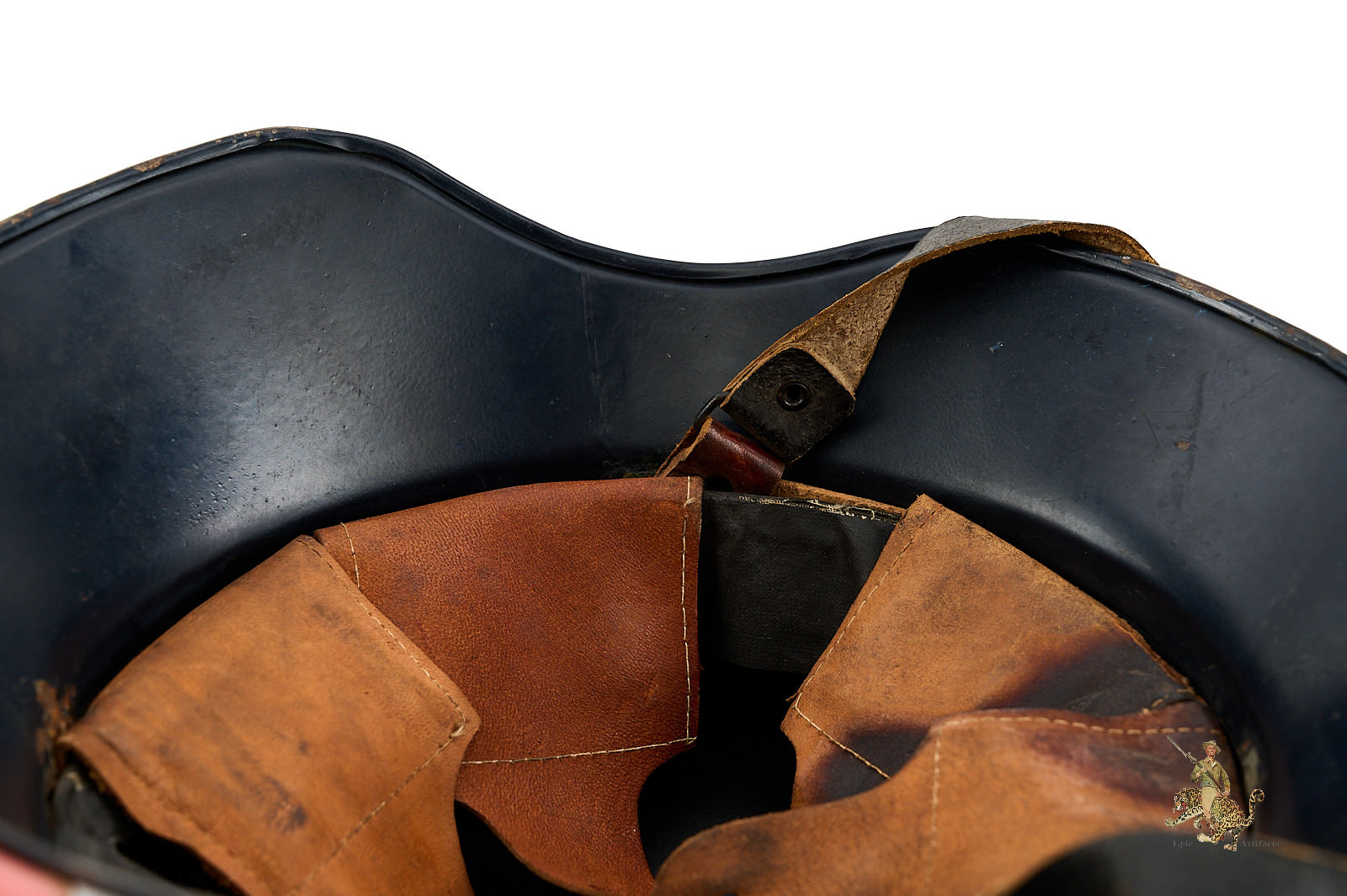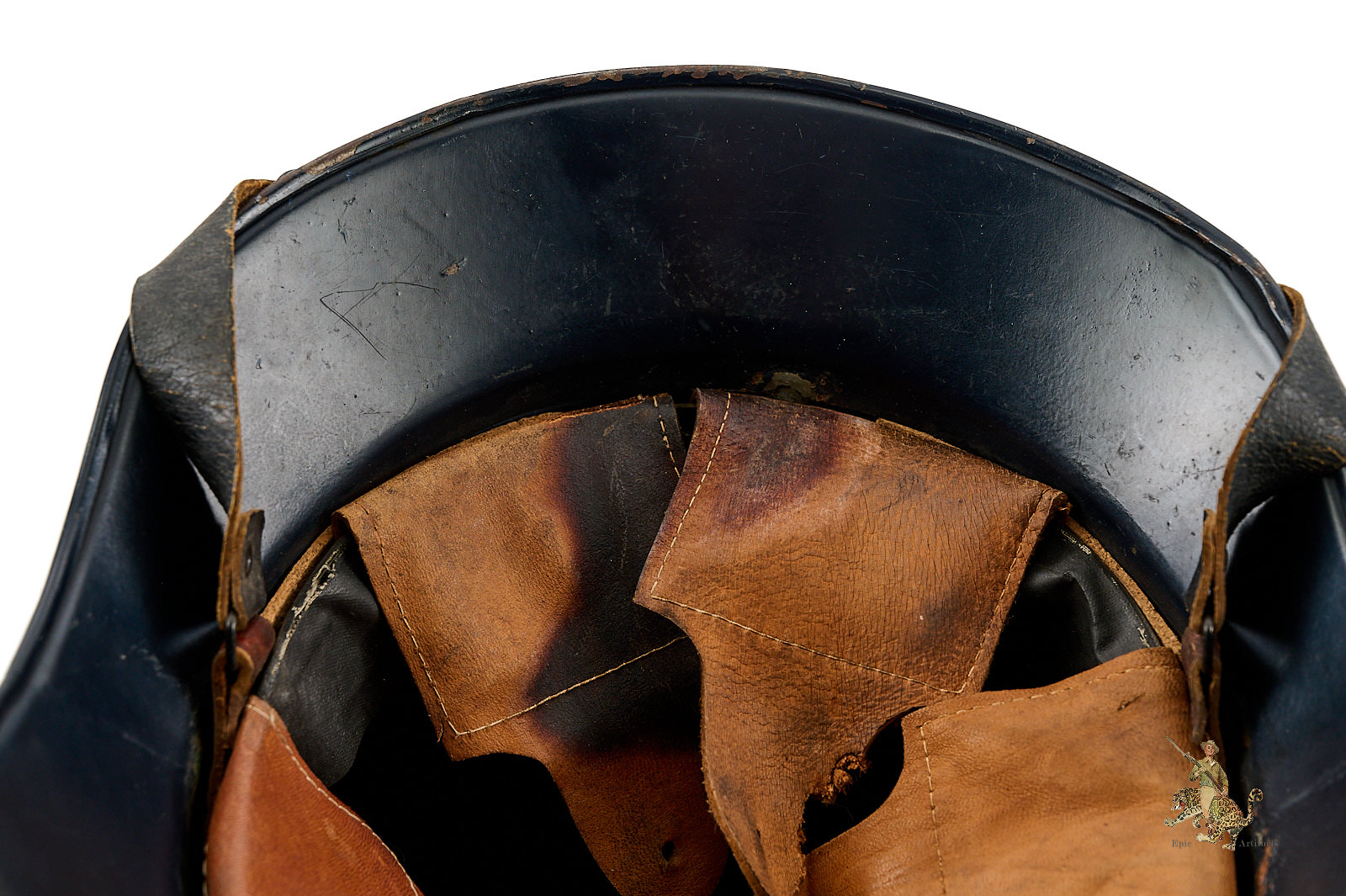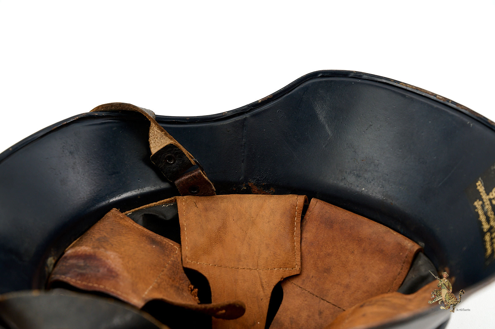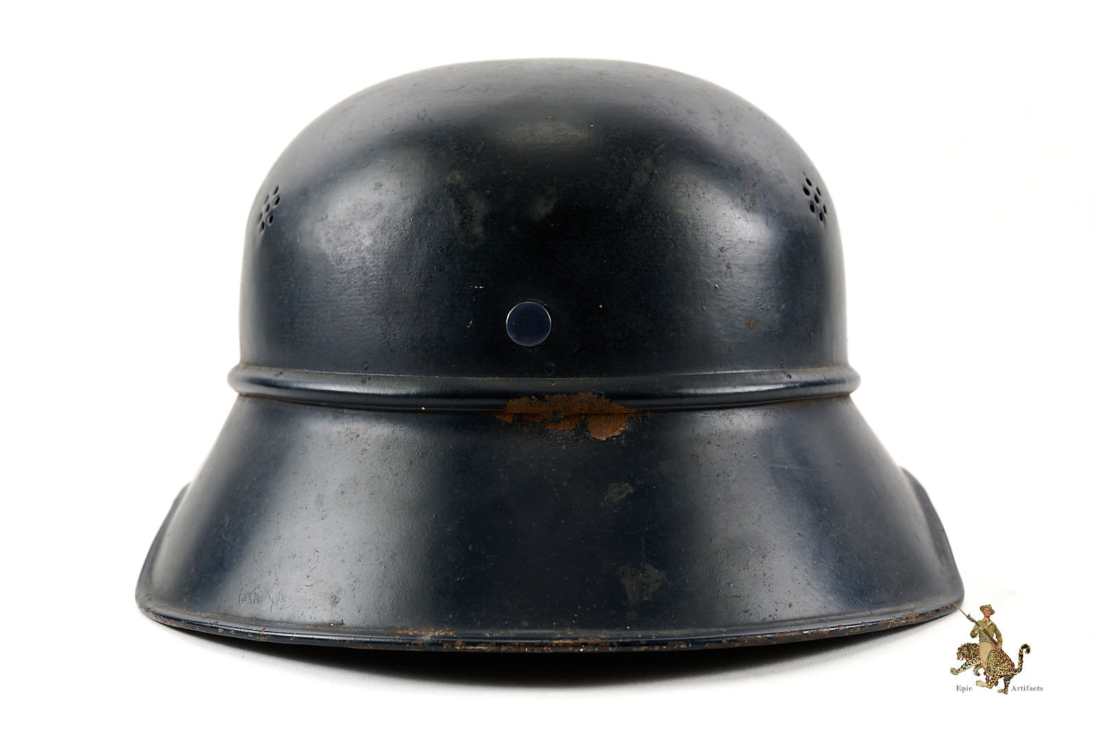 Product Description: This Luftschutz M38 3 Piece Gladiator Helmet is a one-look all-original example of this helmet type. These helmets were worn by many types of civil functionaries including air raid wardens and some members of police and fire organizations. The shell is a three-piece version, and retains nearly all of the original smooth blue paint. Helmet is free from dents and cracking. The exterior paint has an attractive, uncleaned patina. The large and impressive Luftschutz winged swastika decal on the front of the helmet is nearly completely intact. The rear of the helmet shows a spot of corrosion below the bead that carries through to the inside near the support brad. The inside of this German Luftschutz Gladiator Helmet retains its original civil style leather liner and chinstrap. The liner drawstring has been lost to time, and there is some residue of some sort on the front two leather tabs. The black leather double buckle chin strap is one of several styles used on these gladiator helmets. It is complete with minor superficial spidering to the surface. The inner paint has a few spots of loss and minor corrosion as shown. The inside back shows makers label. This helmet has great character and displays well. The overall condition rates as excellent.