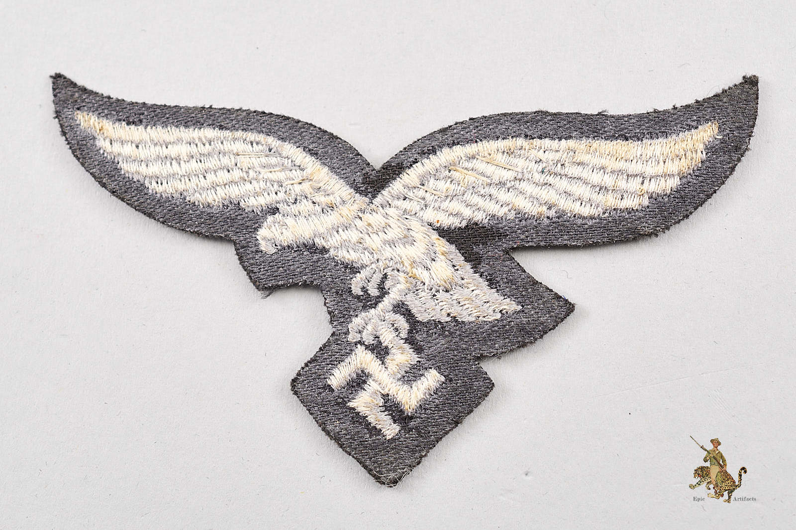 Product Description: Here is an unworn, standard Luftwaffe Breast Eagle. These eagles are starting to become somewhat hard to find. Machine embroidered eagle in white thread on blue wool. Textbook example, to be worn on a Luftwaffe fliegerbluse. On the back of the insignia is glue residue from most likely being mounted in a photo album or scrap book. This Luftwaffe EM Breast Eagle is in excellent plus condition.