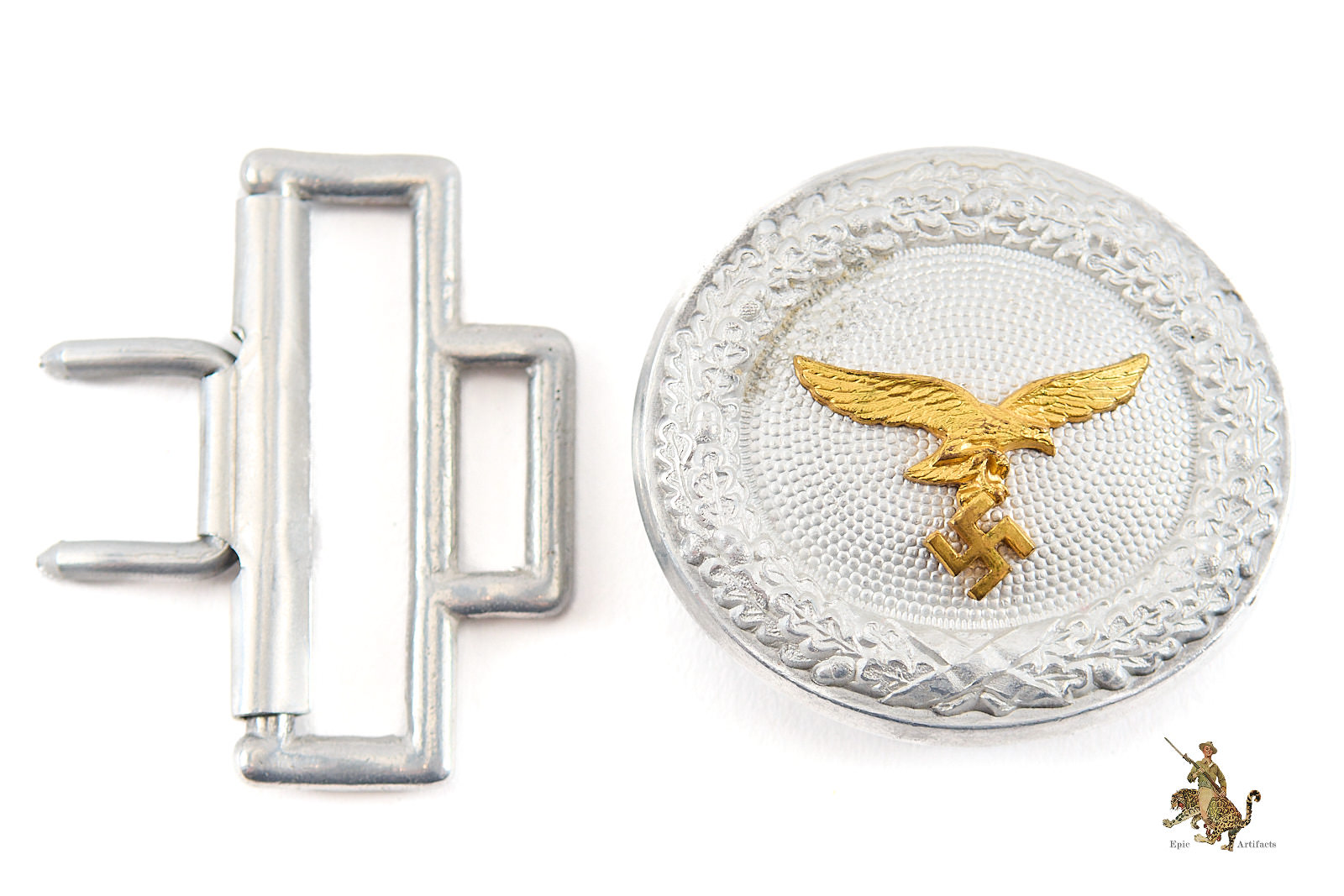Product Description: This is an exceptional Luftwaffe Brocade Belt & Buckle Cased – Assmann, an offering that would be nearly impossible to upgrade. This set remains in stunning, near-mint condition. The buckle is made of bare aluminum and exhibits virtually no wear, with all of its intricate original details fully intact. The reverse is nicely marked, featuring the Assmann makers mark. The buckle is completely original with no damage or repairs. It is accompanied by its original and Luftwaffe brocade belt, constructed of woven aluminum wire with a blue gray velour backing. The set is housed in its original red leatherette case with a red velour interior lining. Due to age, the top lid separated, but this does not detract from the overall presentation. This Luftwaffe Brocade & Buckle Cased – Assmann set, complete with its original case, is in exceptional near-mint condition, making it a museum-worthy collectible and a top-tier addition to any collection. Overall the Condition of this Luftwaffe Brocade & Buckle Cased – Assmann is in near mint condition.