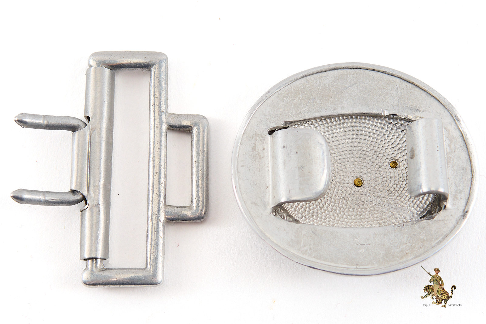 Product Description: This is an exceptional Luftwaffe Brocade Belt & Buckle Cased – Assmann, an offering that would be nearly impossible to upgrade. This set remains in stunning, near-mint condition. The buckle is made of bare aluminum and exhibits virtually no wear, with all of its intricate original details fully intact. The reverse is nicely marked, featuring the Assmann makers mark. The buckle is completely original with no damage or repairs. It is accompanied by its original and Luftwaffe brocade belt, constructed of woven aluminum wire with a blue gray velour backing. The set is housed in its original red leatherette case with a red velour interior lining. Due to age, the top lid separated, but this does not detract from the overall presentation. This Luftwaffe Brocade & Buckle Cased – Assmann set, complete with its original case, is in exceptional near-mint condition, making it a museum-worthy collectible and a top-tier addition to any collection. Overall the Condition of this Luftwaffe Brocade & Buckle Cased – Assmann is in near mint condition.