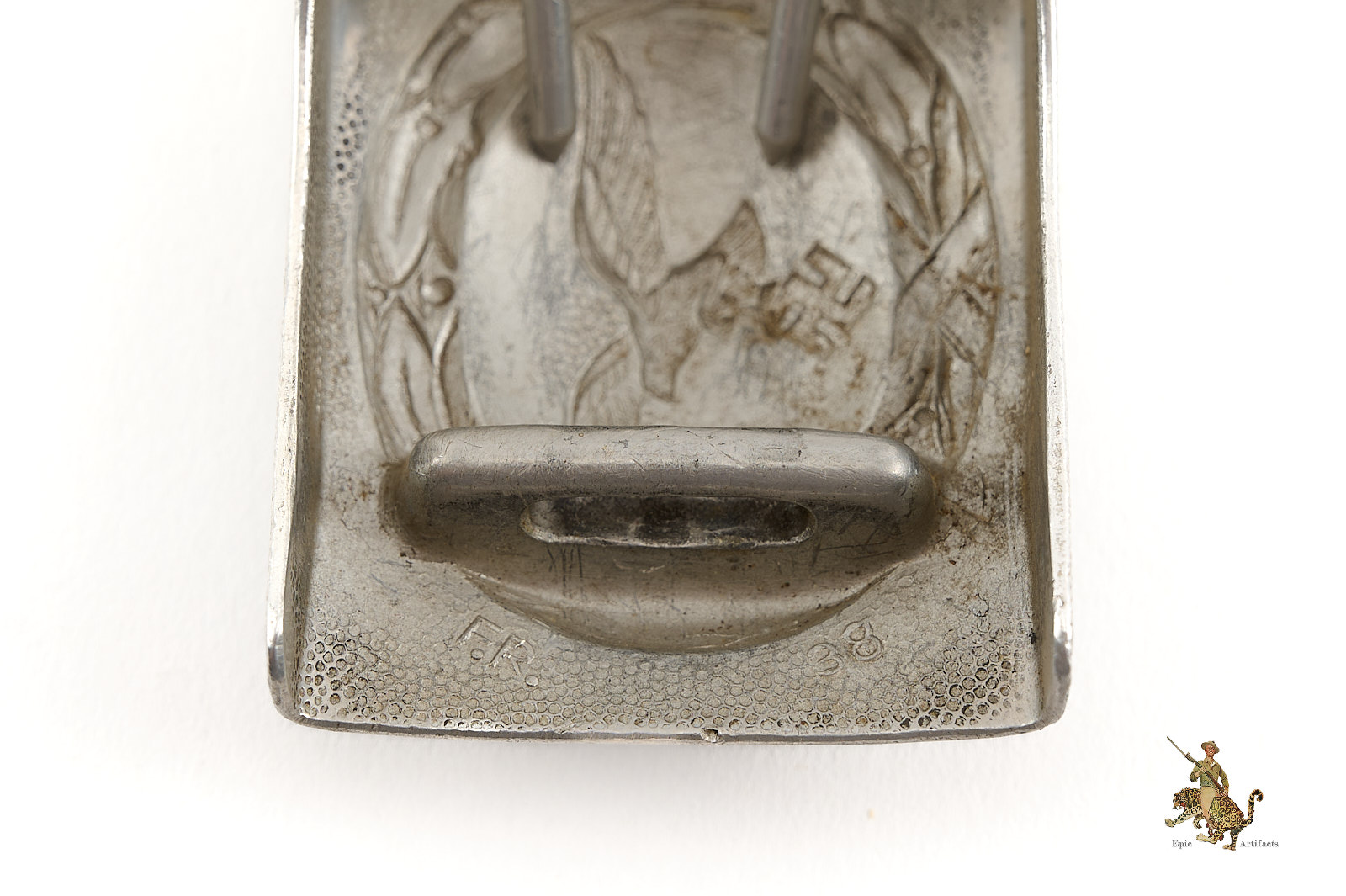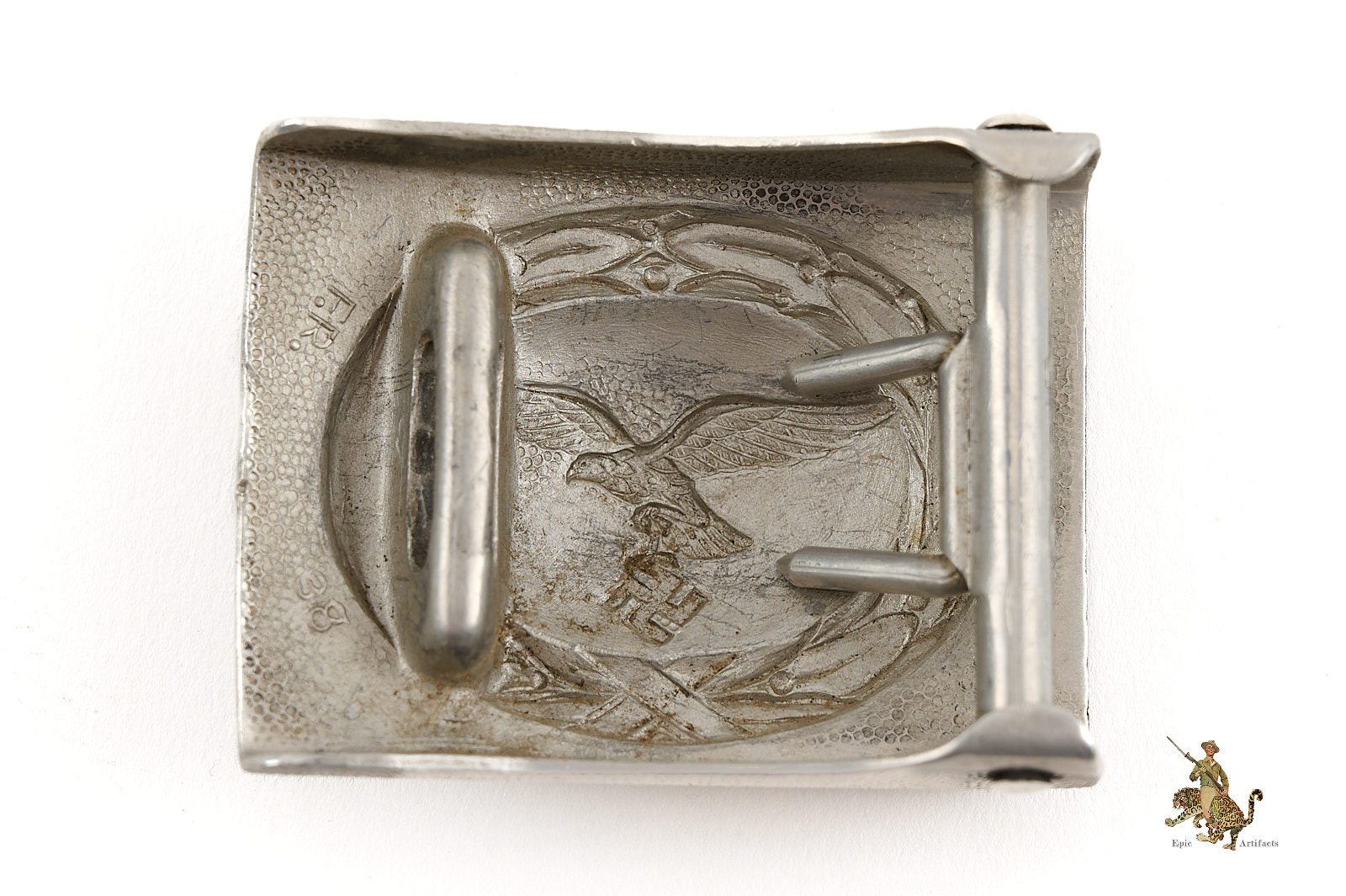 Product Description: This aluminum Luftwaffe Buckle is a nice, representative example of the standard prewar enlisted issue belt buckle. It has no paint, which is how these were issued, and is an early example of the second pattern buckle, with the same eagle design that was used on the wartime steel buckles. The obverse of this piece shows moderate wear that has smoothed details at the high points. The worn areas are clean, and there is an undisturbed old patina that has built up in the recesses, creating visual contrast. The reverse of this aluminum Luftwaffe Buckle is complete, with an integral catch for the hook on the belt, and a functional roller bar and prongs assembly. There is no leather tab. This buckle is marked near the catch in raised characters with the maker initials “F.R.” and the date “38.” It’s a handsome buckle, with appealing character. The condition rates as excellent.