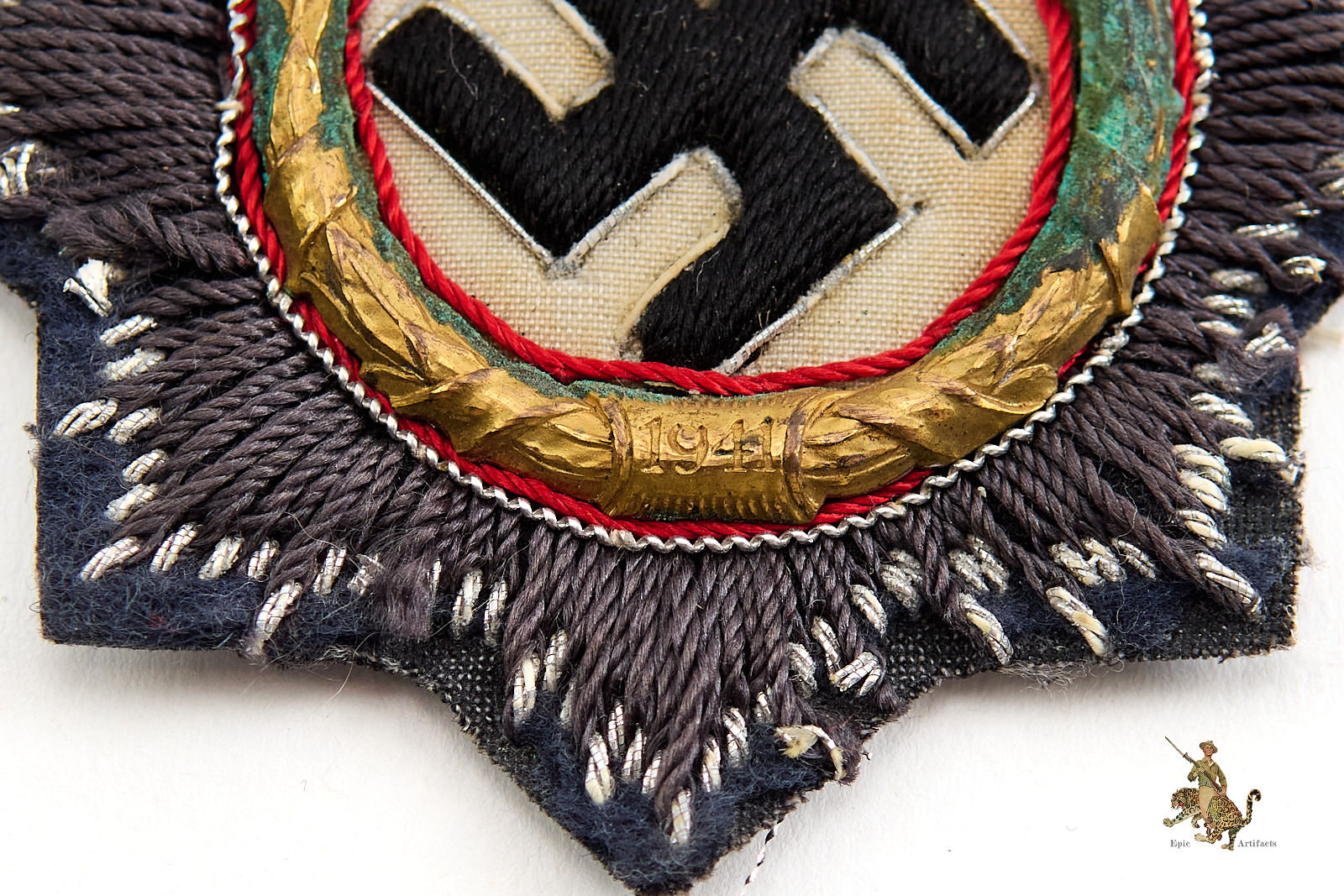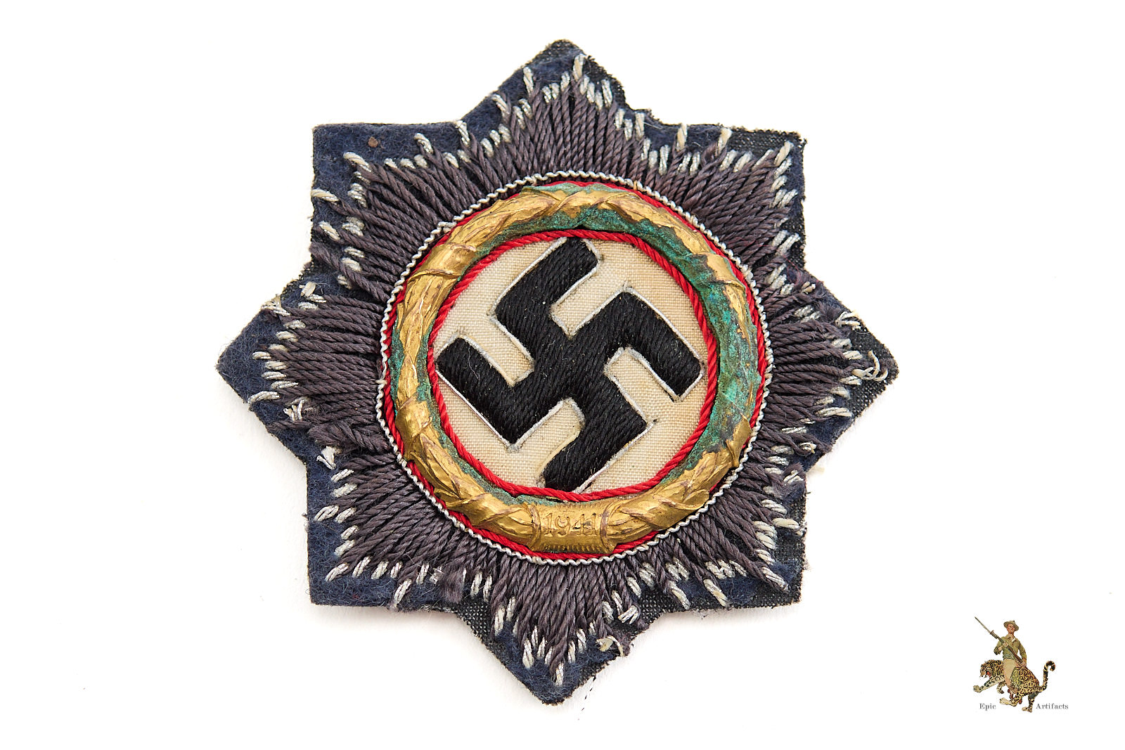 Product Description:  An appealing Luftwaffe Cloth German Cross in Gold, offered here as a scarce and historically significant example of this distinguished combat decoration. The cross is executed on fine Luftwaffe blue wool with a subtle violet tone, characteristic of Air Force issue. The hand-embroidered elements remain attractive, though a few loose threads are present, consistent with age and field wear. The white roundel displays light, even toning, and the applied metal wreath, of high-quality manufacture, shows green oxidation throughout wreath. The expected die flaw in the “9” of the date is visible, confirming correct period production. It should be noted that the original backing paper is no longer present, and the wool backing exhibits areas of moth loss affecting roughly 40% of the edging. Measuring 2 15/16 in., the piece nevertheless retains strong overall visual impact and rates in excellent condition.