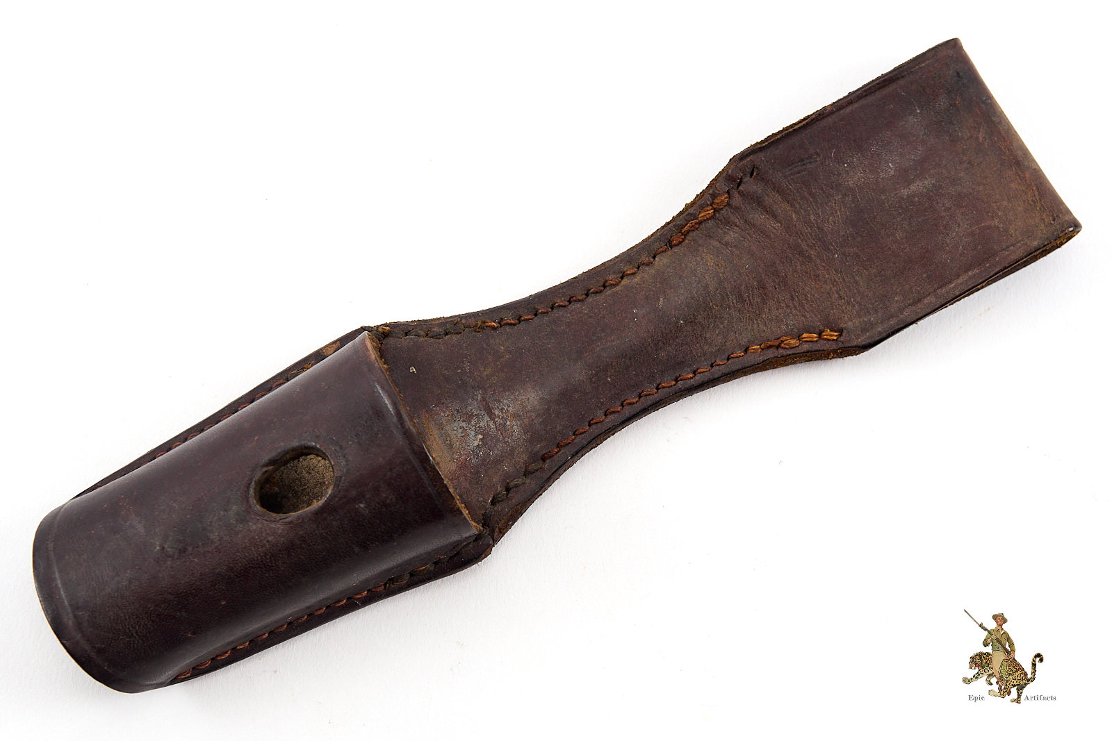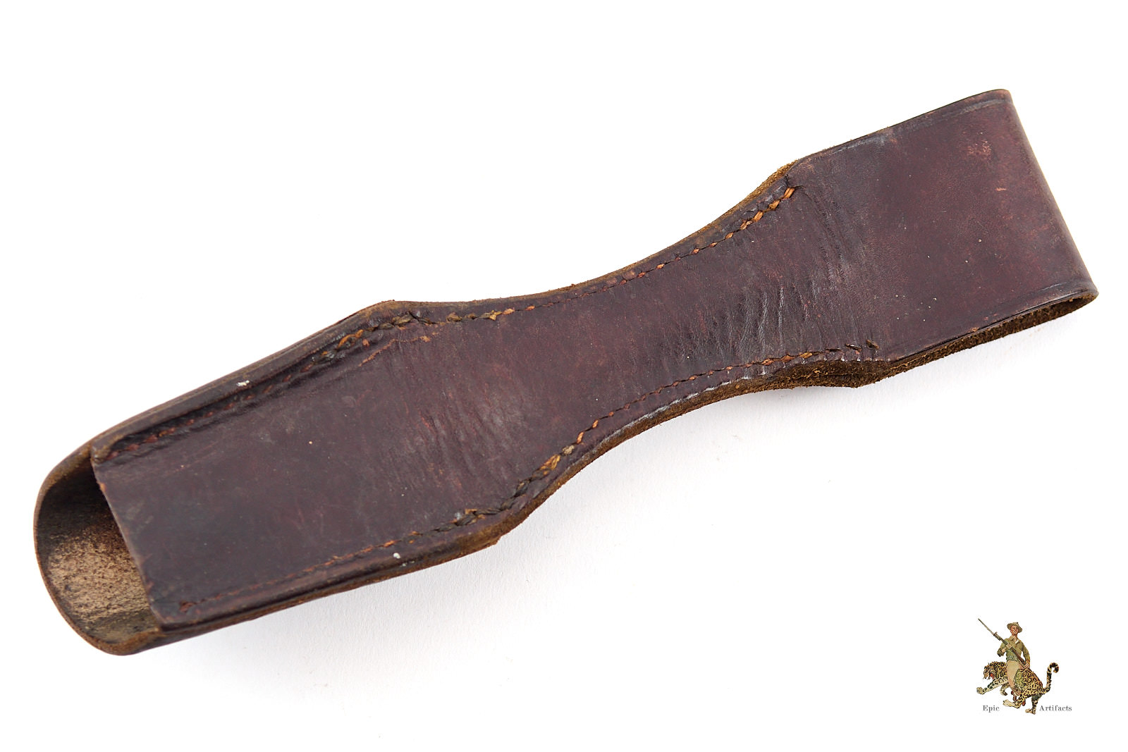 Product Description:This Luftwaffe Dress Bayonet Frog is an excellent brown leather example, remaining in excellent condition. No maker’s mark is present, as is typical for many issued frogs. The leather surface shows minor surface crazing, with strong color throughout, but remains soft and pliable. A few stitches have pulled near the belt loop opening on the left side. Overall, this frog displays beautifully and rates excellent, an outstanding accessory for completing a Luftwaffe dress bayonet setup.