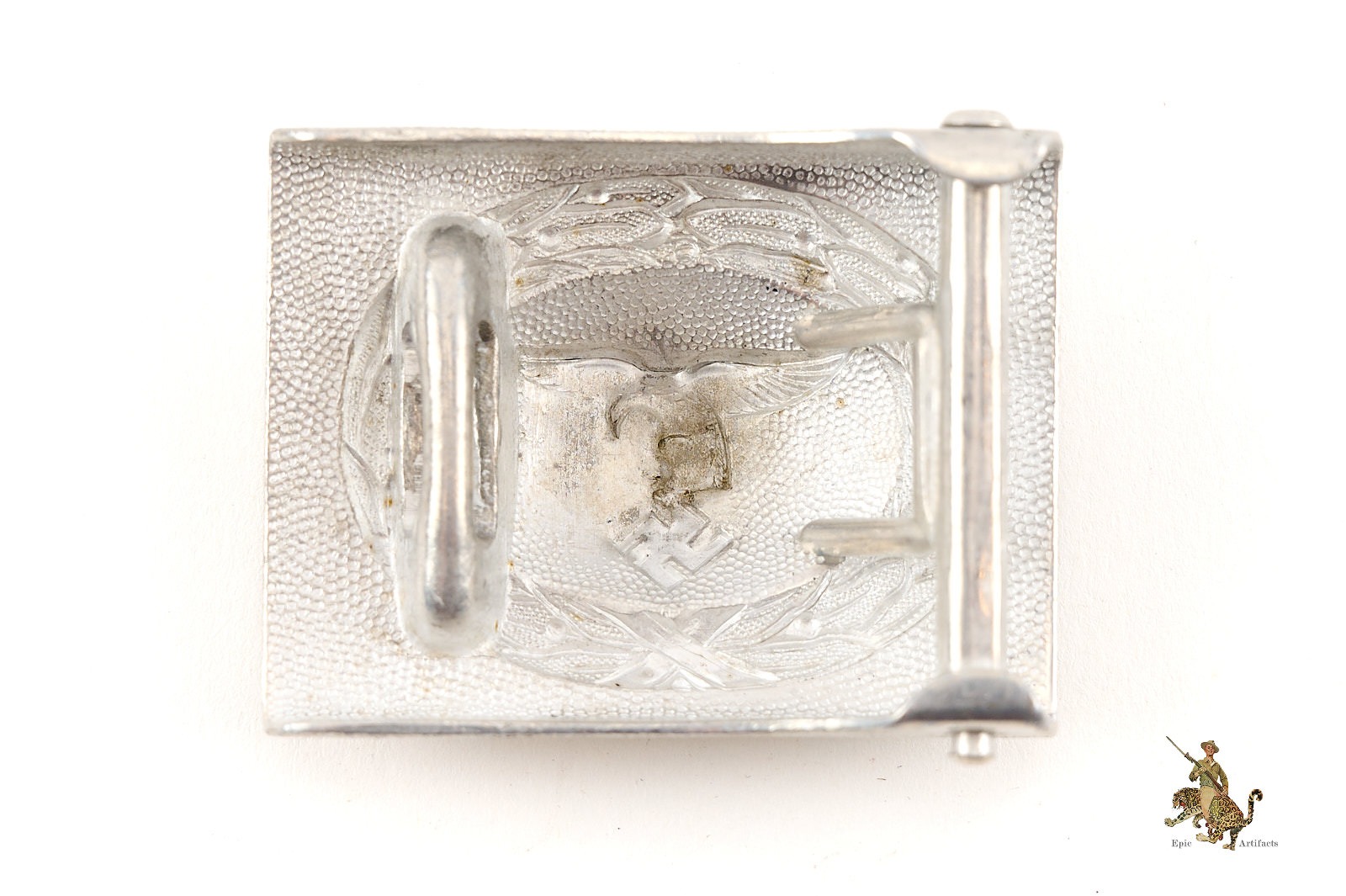 Product Description: A superb example of a rare and highly sought-after prewar variant, this Luftwaffe Early Droop Tail Buckle – Aluminum is executed in bright, unpainted aluminum, showcasing the iconic first pattern “droop tail” Luftwaffe eagle in remarkable detail. The obverse retains its original crisp pebbling and sharp relief to both eagle and wreath, with minimal wear confined to the highest points. The aluminum retains a luminous, near-pristine finish, free of patina, underscoring its excellent state of preservation.