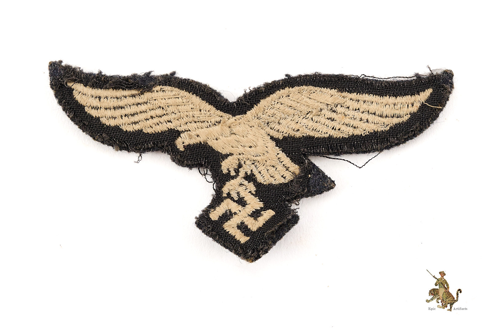 Product Description: Here is an unworn, standard Luftwaffe EM Breast Eagle.  These eagles are starting to become somewhat hard to find. Machine embroidered eagle in white thread on blue wool. Textbook example, to be worn on a Luftwaffe fliegerbluse. This eagle shows some loose threads and minor discoloration from age and storage. This Luftwaffe EM Breast Eagle is in excellent condition.