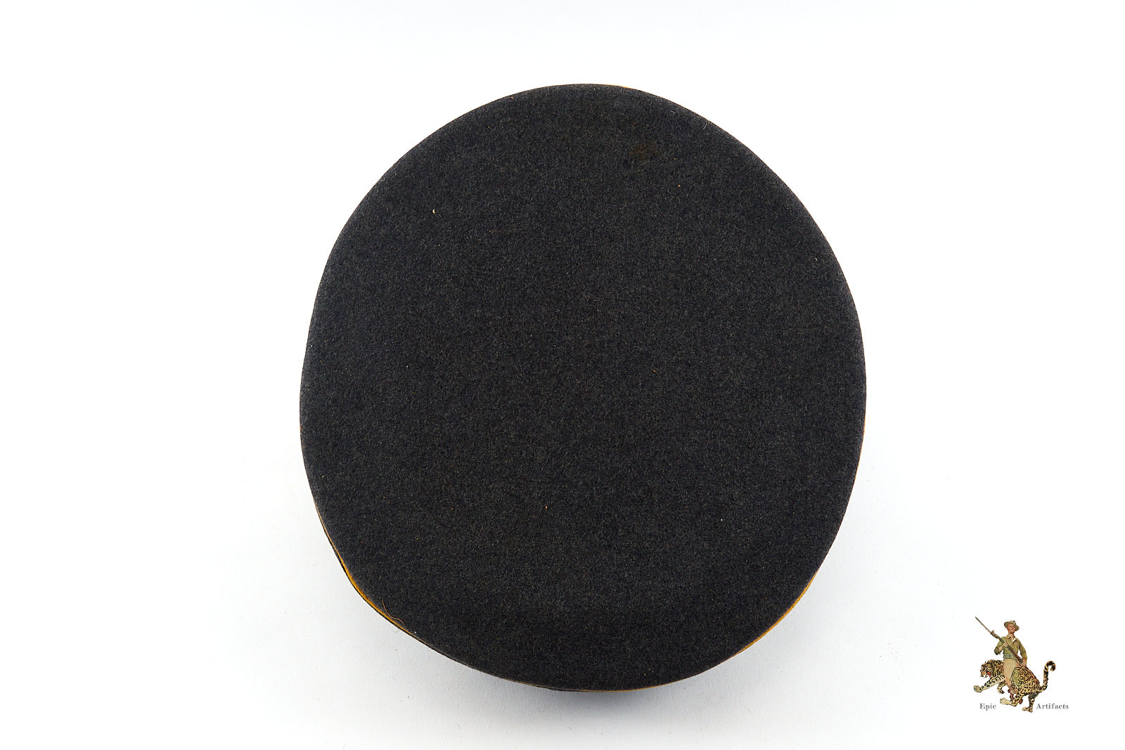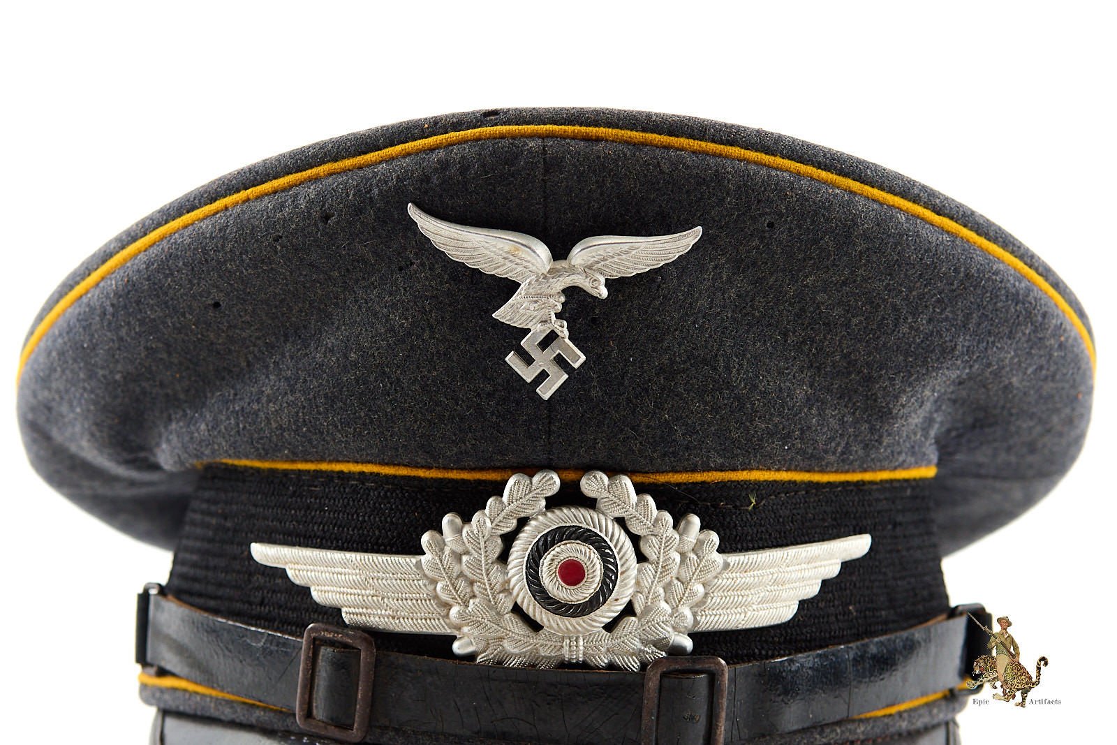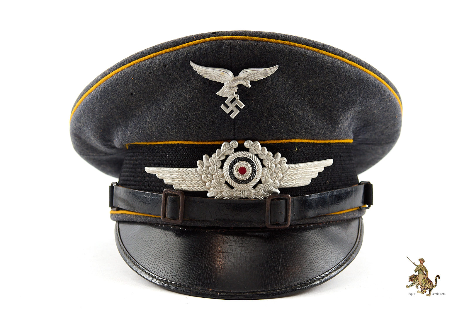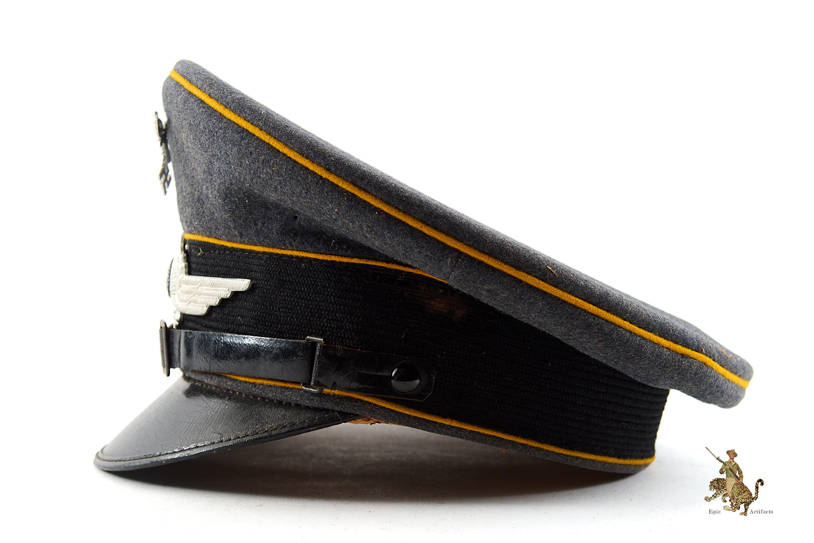 Product Description:  A nice  example of a WWII-era Luftwaffe Flight NCO Visor, exhibiting outstanding originality and overall preservation. Constructed from fine-quality Luftwaffe blue-grey wool, the cap retains a deep, even nap with only a few spots of mothing and  tracking. The band around the hat has material loss to both the left and right sides.  The body is sharply tailored, displaying the crisp contours and balanced proportions characteristic of wartime manufacture.