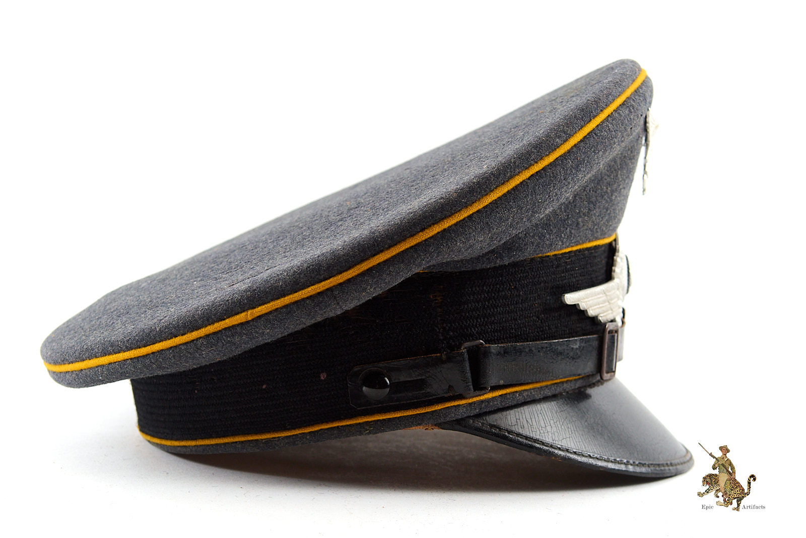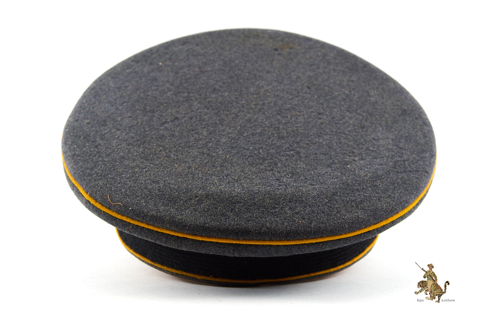 Historical Description: The visor cap (Schirmmütze) was an important part of the headgear worn by German uniformed military, civil, paramilitary and political organizations during the Third Reich. This was the standard cloth headgear worn as a part of the service uniform. Visor caps were worn outdoors, as well as indoors, and were often required to be worn by all personnel on duty. Visor caps were made in versions specific to each organization and were often further differentiated through the use of insignia, colored piping, or style of chin cord, to indicate rank, role or branch. The insignia used on these caps ranged from simple stamped metal emblems, to elaborate hand embroidery. Visor caps were issued to enlisted soldiers and NCOs in the military and in some other organizations. Officers had to purchase their own hats, and lower ranks could choose to purchase caps that were of a higher quality than the rather basic, issue examples. The private purchase caps were generally made in very high quality, with fine materials. A wide variety of fabrics were used, from Trikot and doeskin, to heavy wool, or even lightweight white fabric for summer wear. In the military, issue of these caps was generally suspended shortly after the outbreak of the war, but they continued to be worn by some troops until the end of the war.