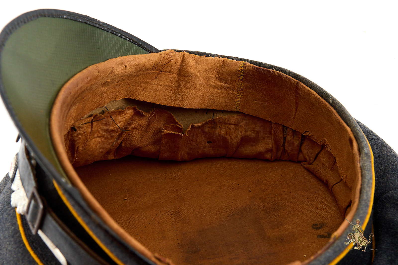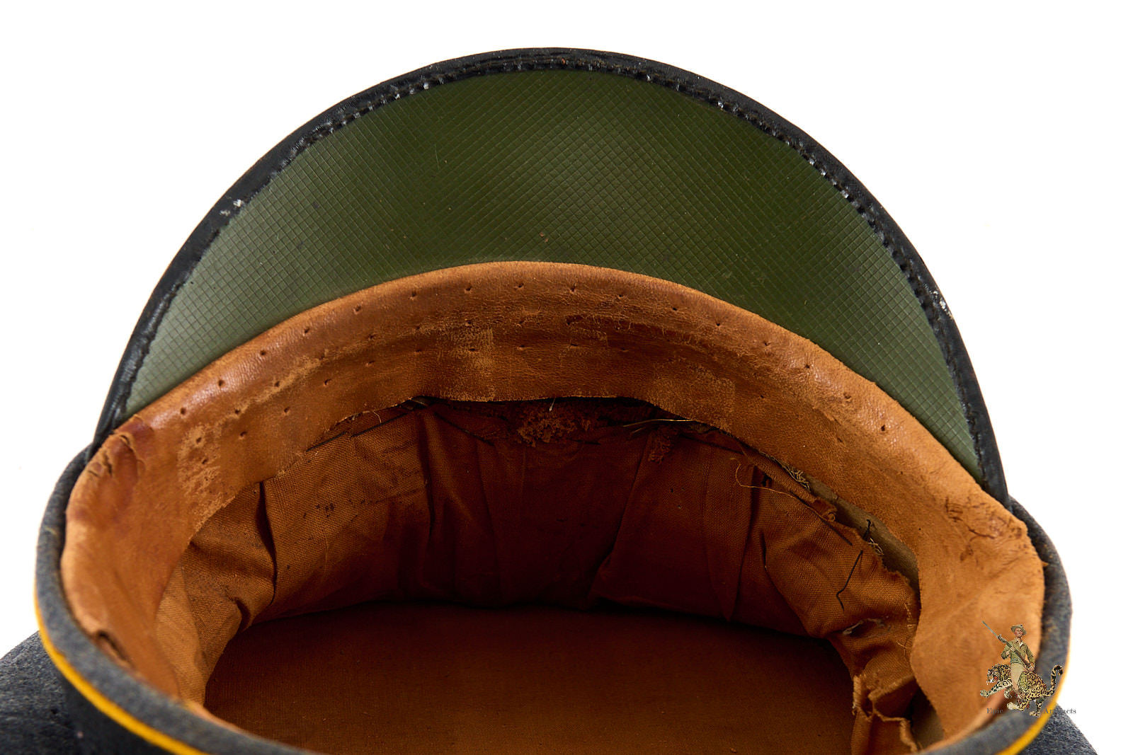 Inside, the leather sweatband shows age-related cracking with areas of sympathetic tape repair to the rear to maintain integrity. The visor edge exhibits minor losses to the surface material, consistent with honest age and handling.