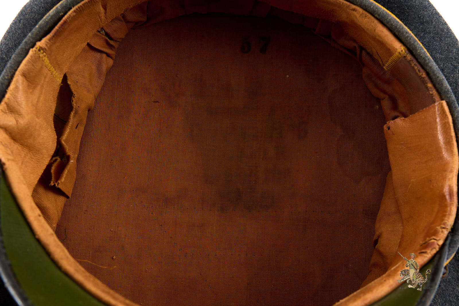 The original Luftwaffe eagle and national cockade are correctly affixed and remain firmly in place—the eagle showing attractive luster and the cockade retaining most of the original paint with light wear to high points. The maker’s mark is stamped into the dome of the hat, but has mostly faded away.  The date appears to be 1935, and the size 57 stamp is still visible.