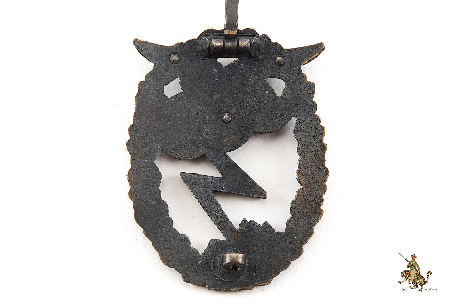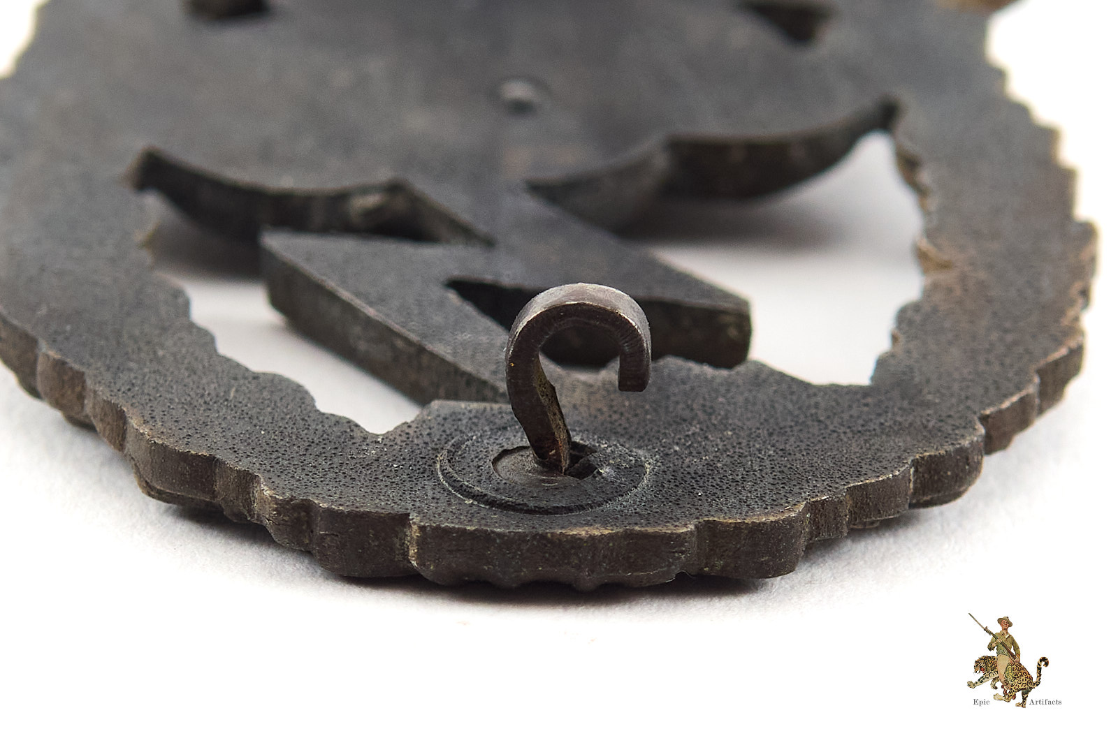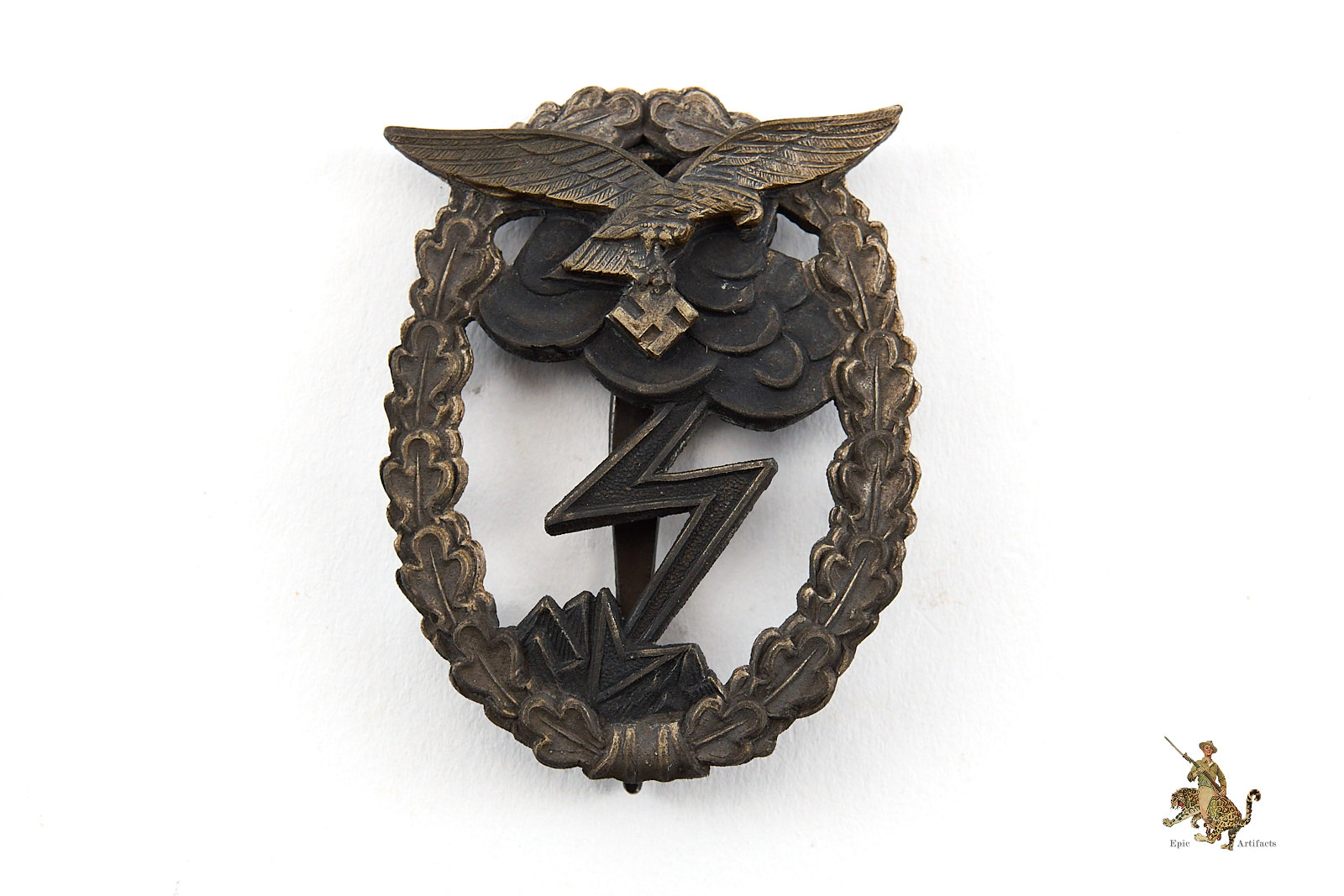 Historical Description: In the early days of WWII, the German Air Force had few units intended to serve as infantry. As the war progressed, and especially after the disastrous first winter on the Eastern Front, more and more Luftwaffe personnel were being engaged in ground combat on the front lines. To recognize the combat experience of these soldiers, Luftwaffe chief Hermann Goering introduced the Luftwaffe Ground Assault Badge on March 31, 1942. The badge had been designed by Sigmund von Weech and featured a Luftwaffe eagle and swastika emblem atop a wreath, within which was a storm cloud striking the earth with a bolt of lightning. Those Luftwaffe soldiers who had previously been awarded German Army ground combat badges such as the Infantry Assault Badge, General Assault Badge or Panzer Assault Badge, were to exchange them for the new Luftwaffe badge. To earn this badge, Luftwaffe soldiers had to survive three ground combat actions on three separate days, be wounded in a ground combat action, or to have earned another decoration in such an action. Luftwaffe soldiers killed in ground combat were to receive the award posthumously. Personnel who could receive this award included paratroopers, members of the Luftwaffe Field Divisions, assault gun crews, and even Flak crews tasked with using their anti-aircraft guns against ground targets. On some of these badges, mostly early versions, the Luftwaffe eagle is a separate piece, riveted on. Later in the war, the eagle was most often integral to the badge.