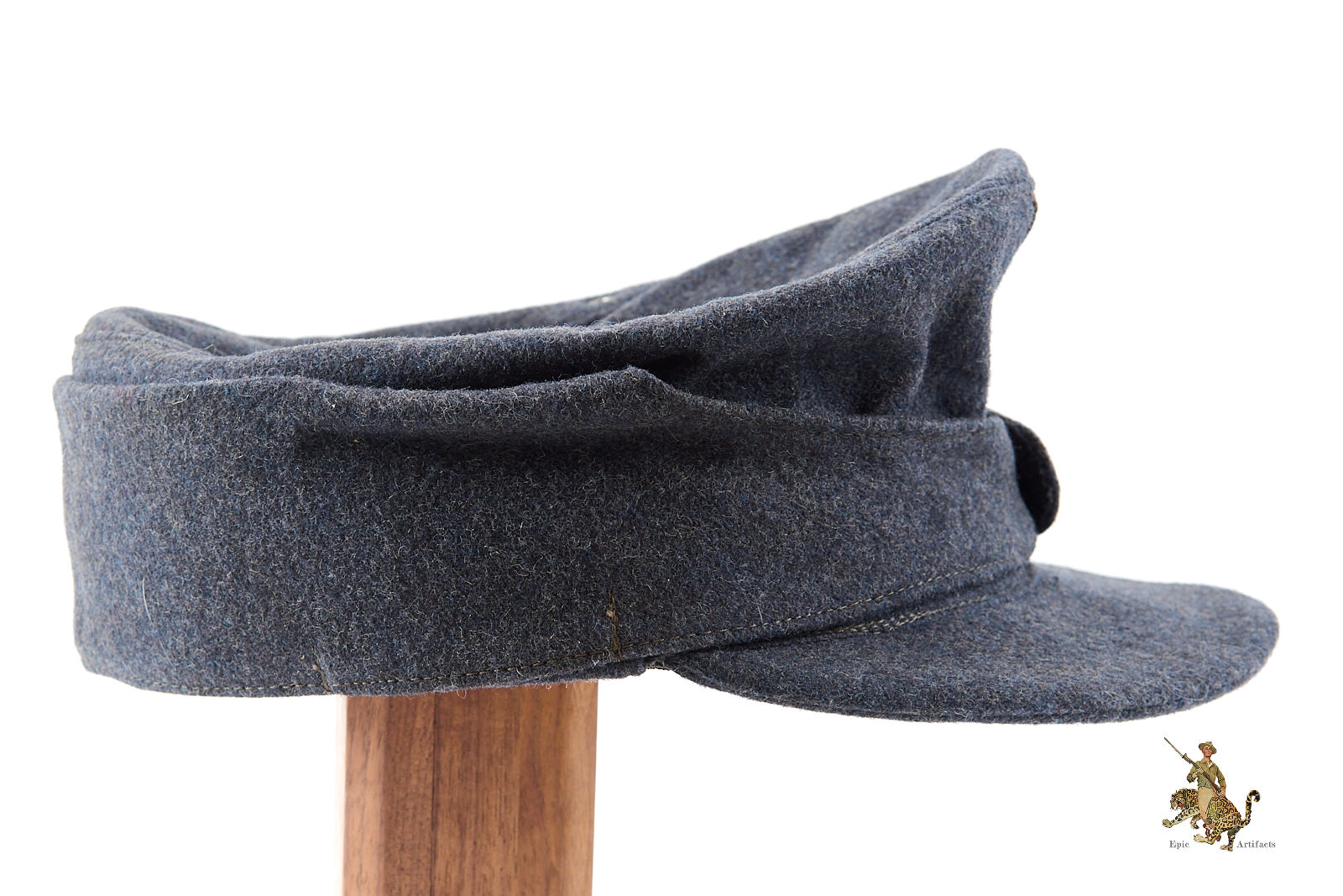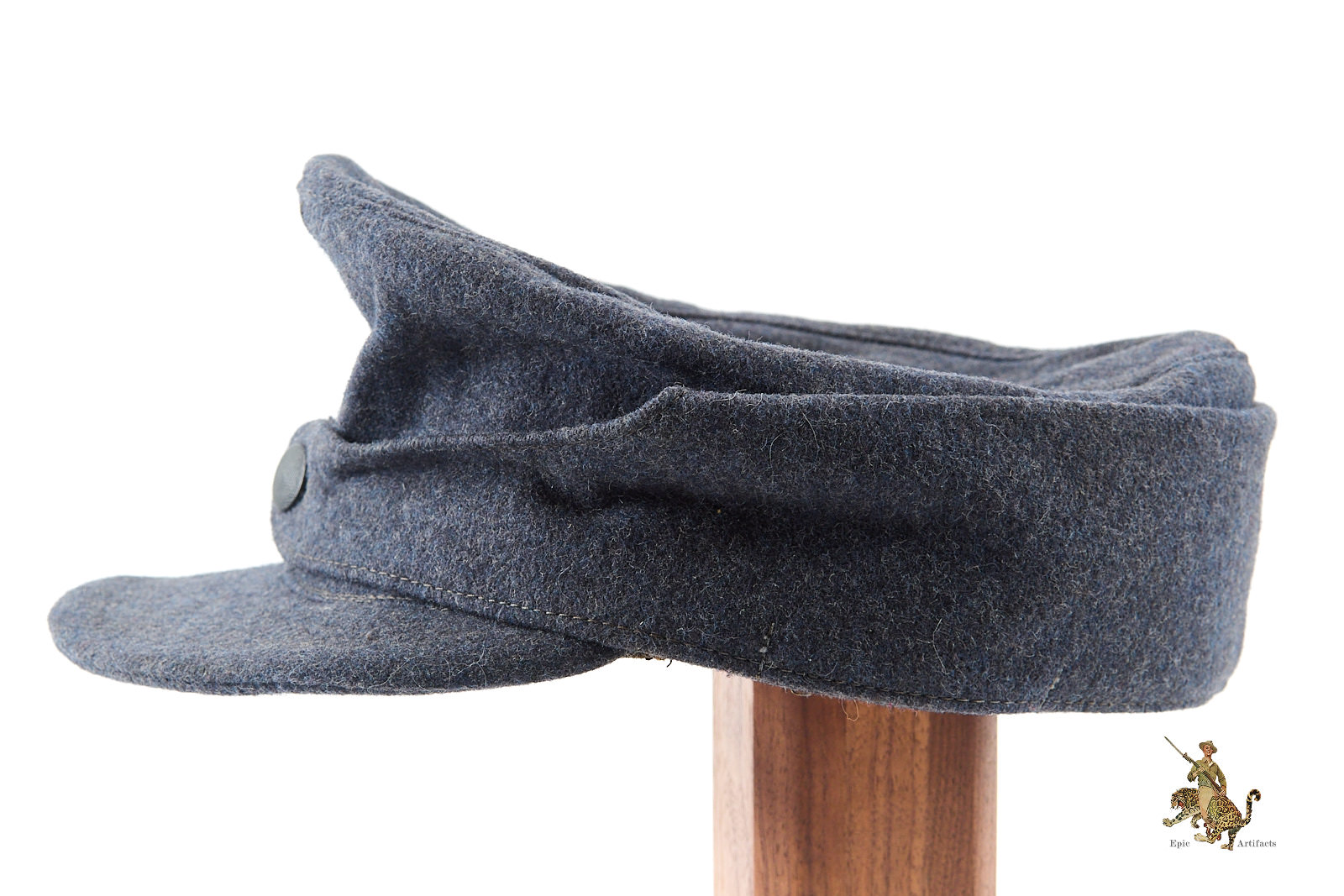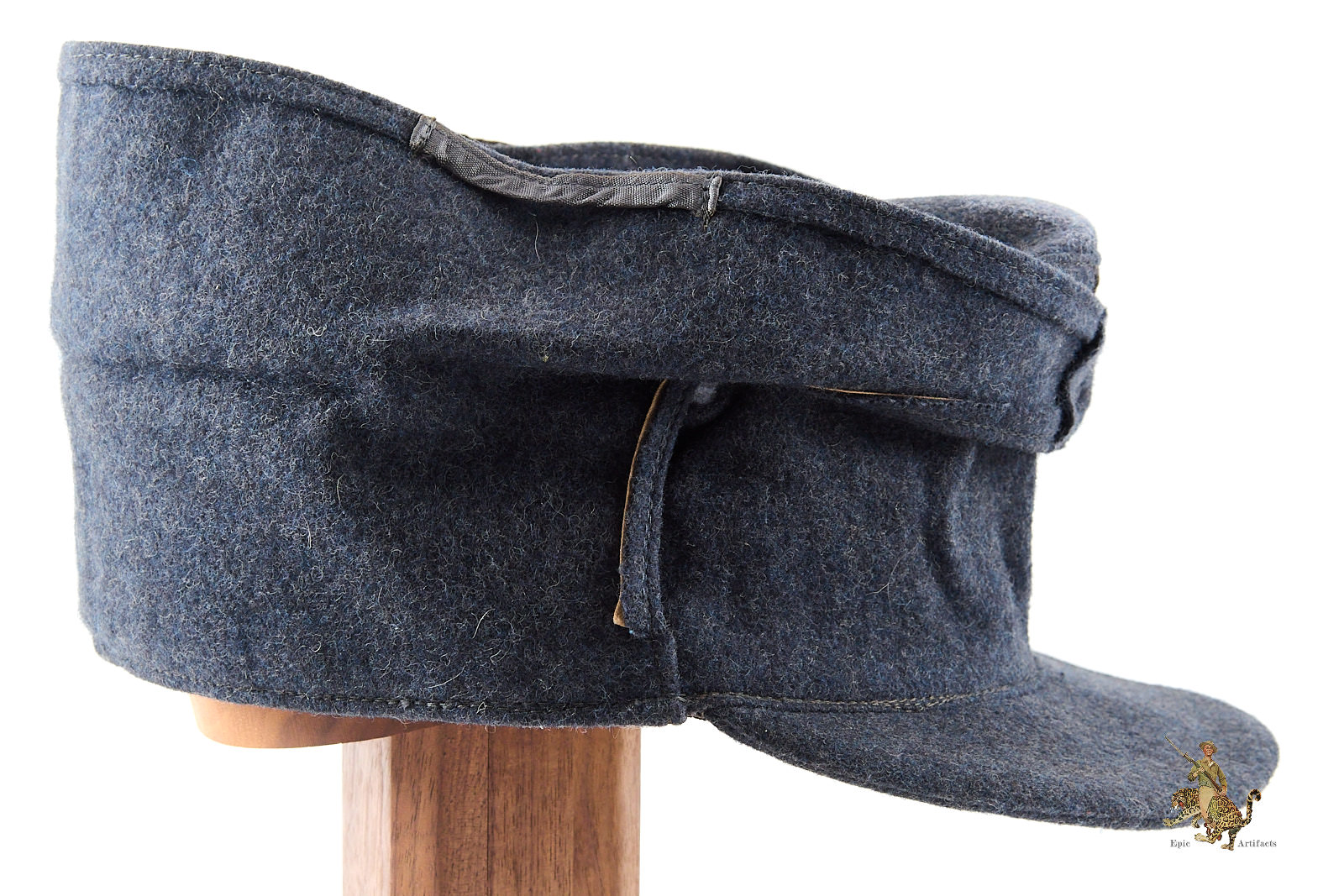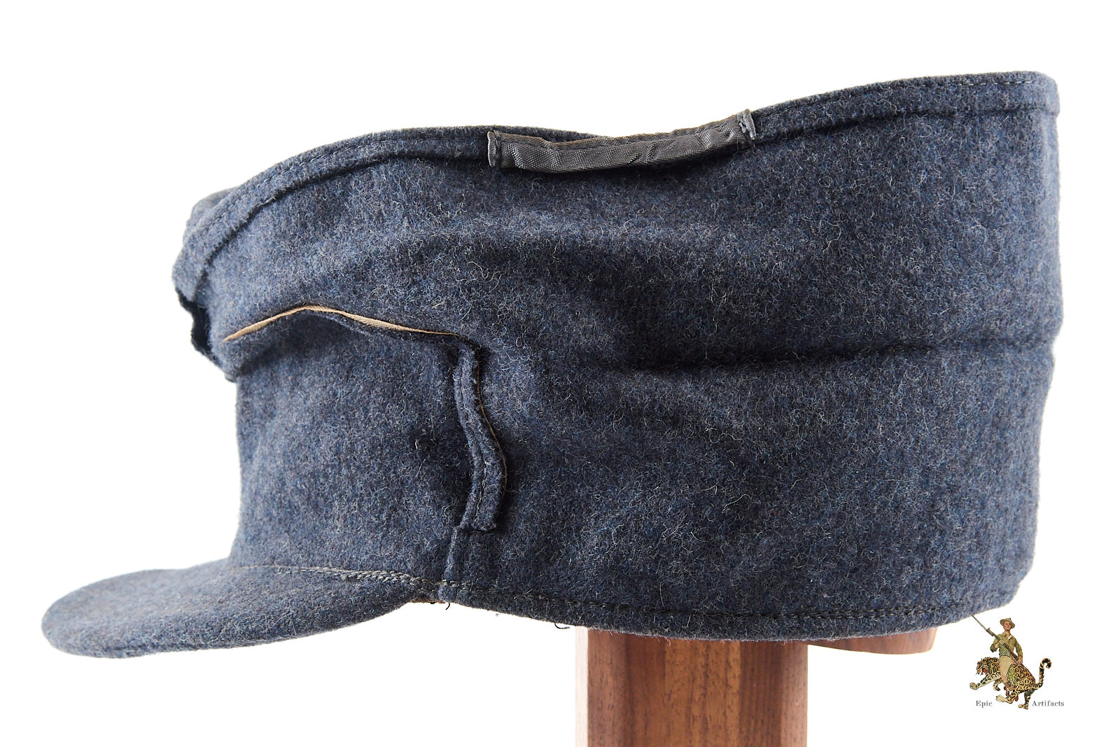 Historical Description: Prior to WWII, all branches of the German military issued their soldiers a field cap in the traditional “side cap” style (there were other types of field caps for certain specialized units). This type of field cap, called “little boat” (Schiffchen) by the troops, was found to be inadequate in the harsh extreme cold weather conditions on the Eastern Front in the brutal winter of 1941-42. As a result, in 1942, some units started issuing a type of field cap that had flaps and a button closure that could be folded down and fastened under the wearer’s chin, to provide protection to the ears. This type of cap, known as the M42, saw limited issue and was replaced a year later with a new model field cap, the Einheitsfeldmütze, that was intended to be issued to all branches. This final model of Wehrmacht field cap, which collectors have termed the M43, was based on the cap that had originally been issued to Wehrmacht mountain troops and featured the fold down ear flaps, as well as a visor. These caps were made out of wool and were intended for year-round wear in all regions where tropical uniforms were not issued. The caps were apparently very popular, as they very quickly replaced the earlier models on the heads of the troops in the field. By 1944 this was the most commonly seen field cap in combat units. These caps remained popular after the war, and many had their insignia removed and were worn out and discarded.