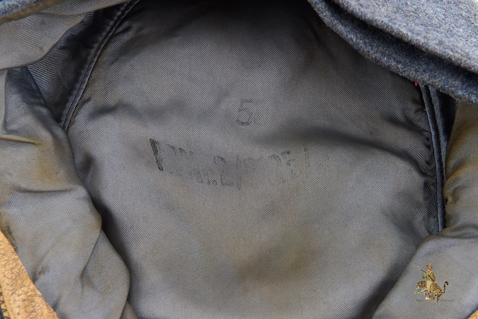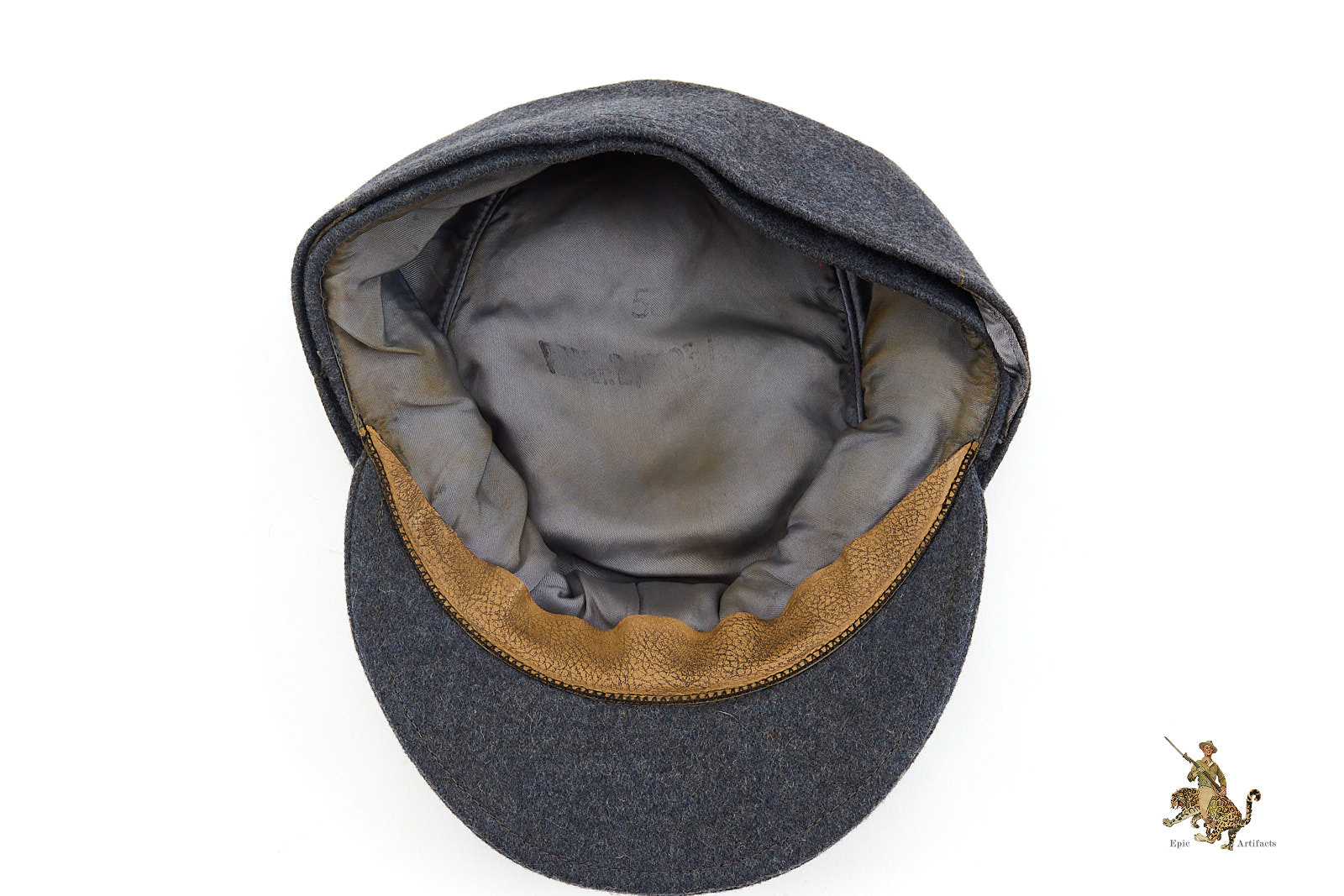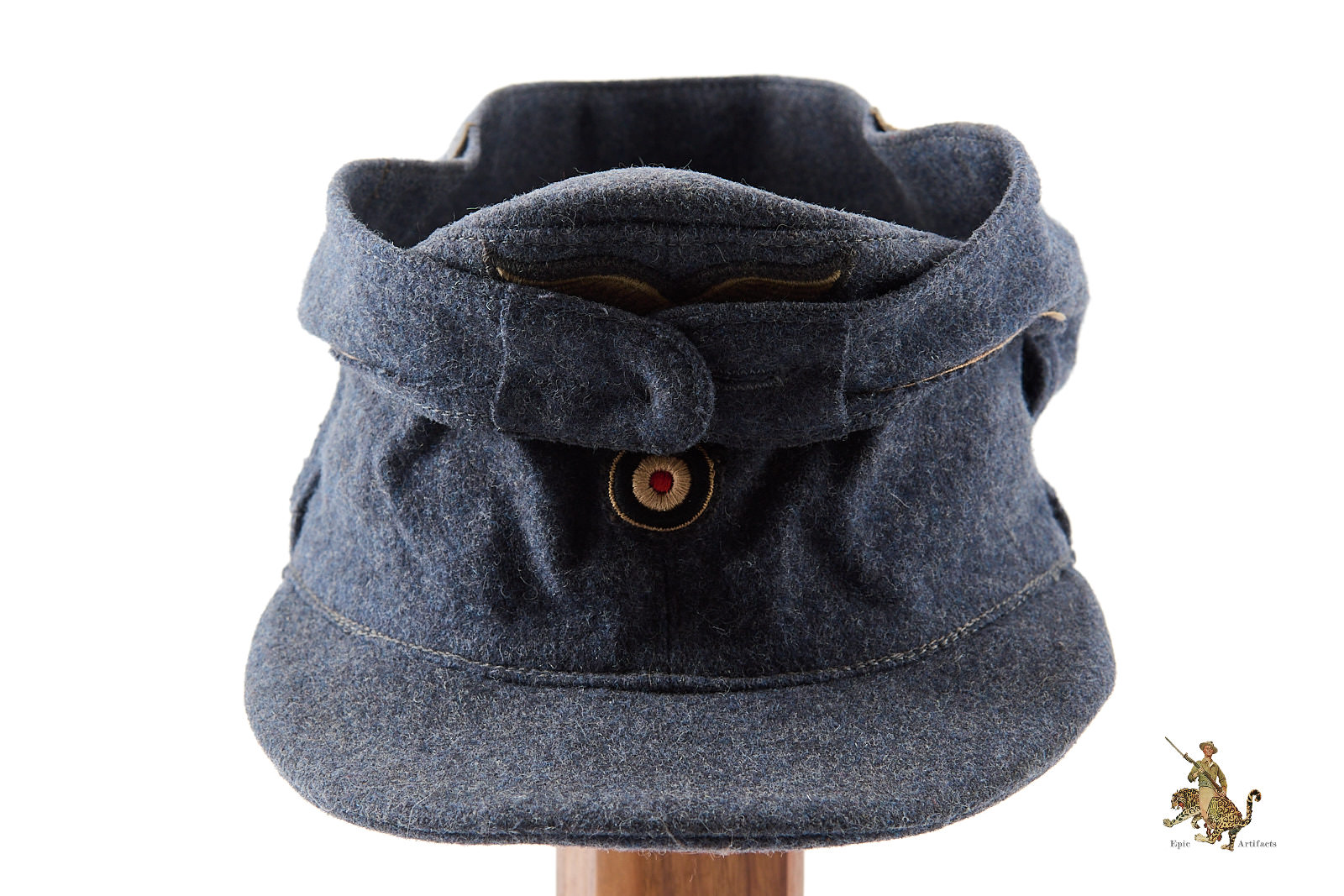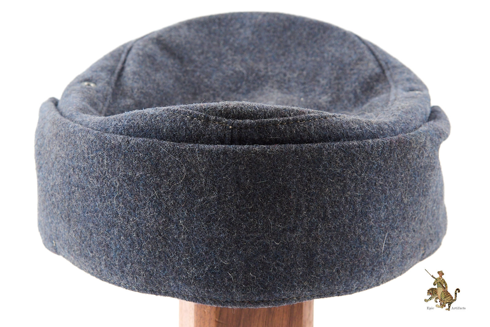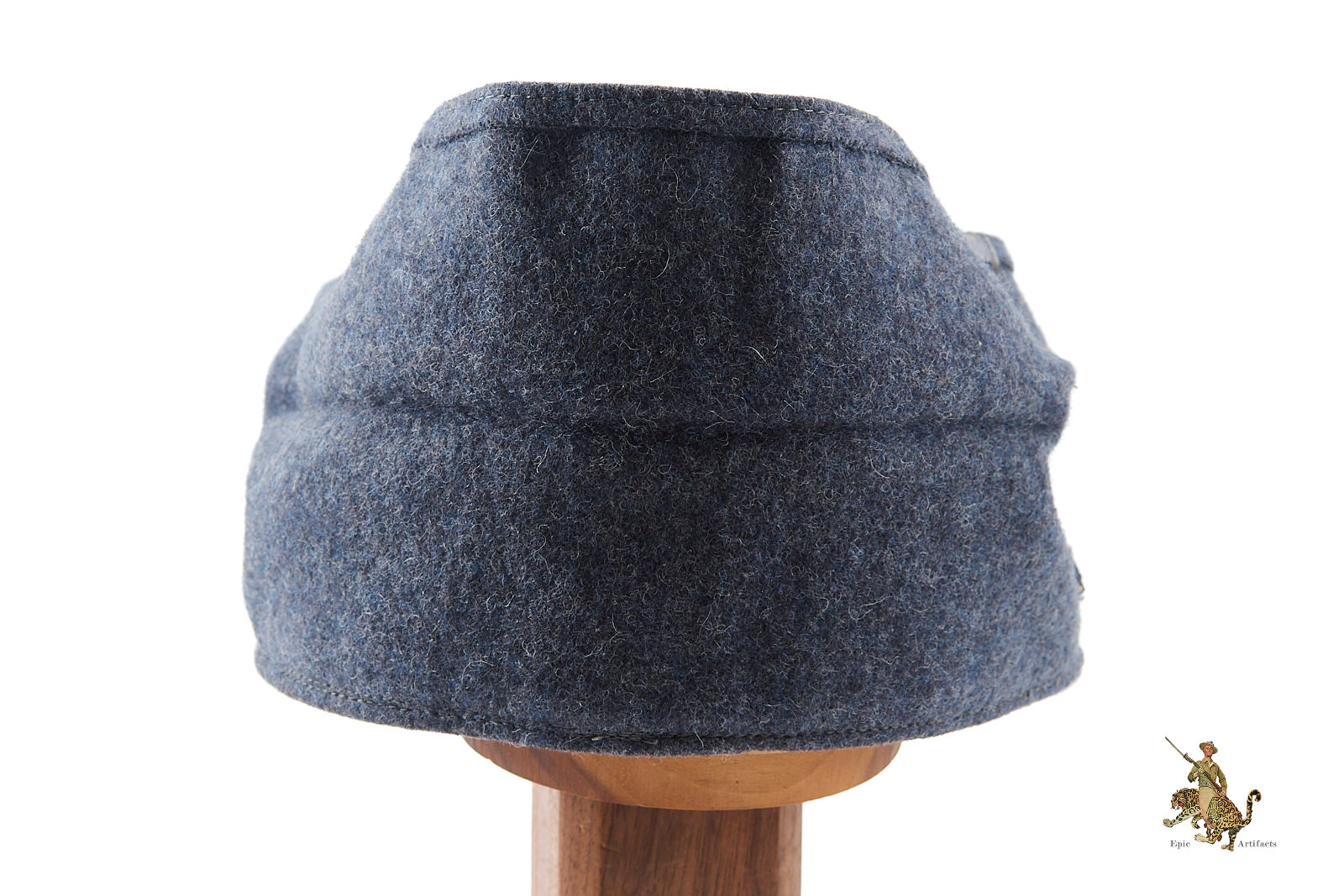 Historical Description: Prior to WWII, all branches of the German military issued their soldiers a field cap in the traditional “side cap” style (there were other types of field caps for certain specialized units). This type of field cap, called “little boat” (Schiffchen) by the troops, was found to be inadequate in the harsh extreme cold weather conditions on the Eastern Front in the brutal winter of 1941-42. As a result, in 1942, some units started issuing a type of field cap that had flaps and a button closure that could be folded down and fastened under the wearer’s chin, to provide protection to the ears. This type of cap, known as the M42, saw limited issue and was replaced a year later with a new model field cap, the Einheitsfeldmütze, that was intended to be issued to all branches. This final model of Wehrmacht field cap, which collectors have termed the M43, was based on the cap that had originally been issued to Wehrmacht mountain troops and featured the fold down ear flaps, as well as a visor. These caps were made out of wool and were intended for year-round wear in all regions where tropical uniforms were not issued. The caps were apparently very popular, as they very quickly replaced the earlier models on the heads of the troops in the field. By 1944 this was the most commonly seen field cap in combat units. These caps remained popular after the war, and many had their insignia removed and were worn out and discarded.