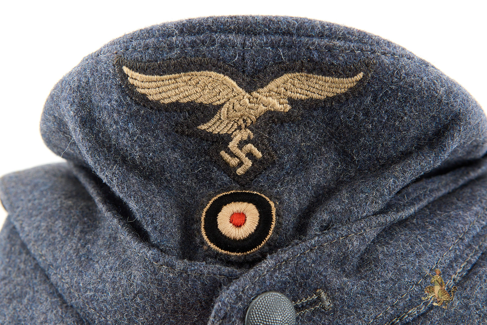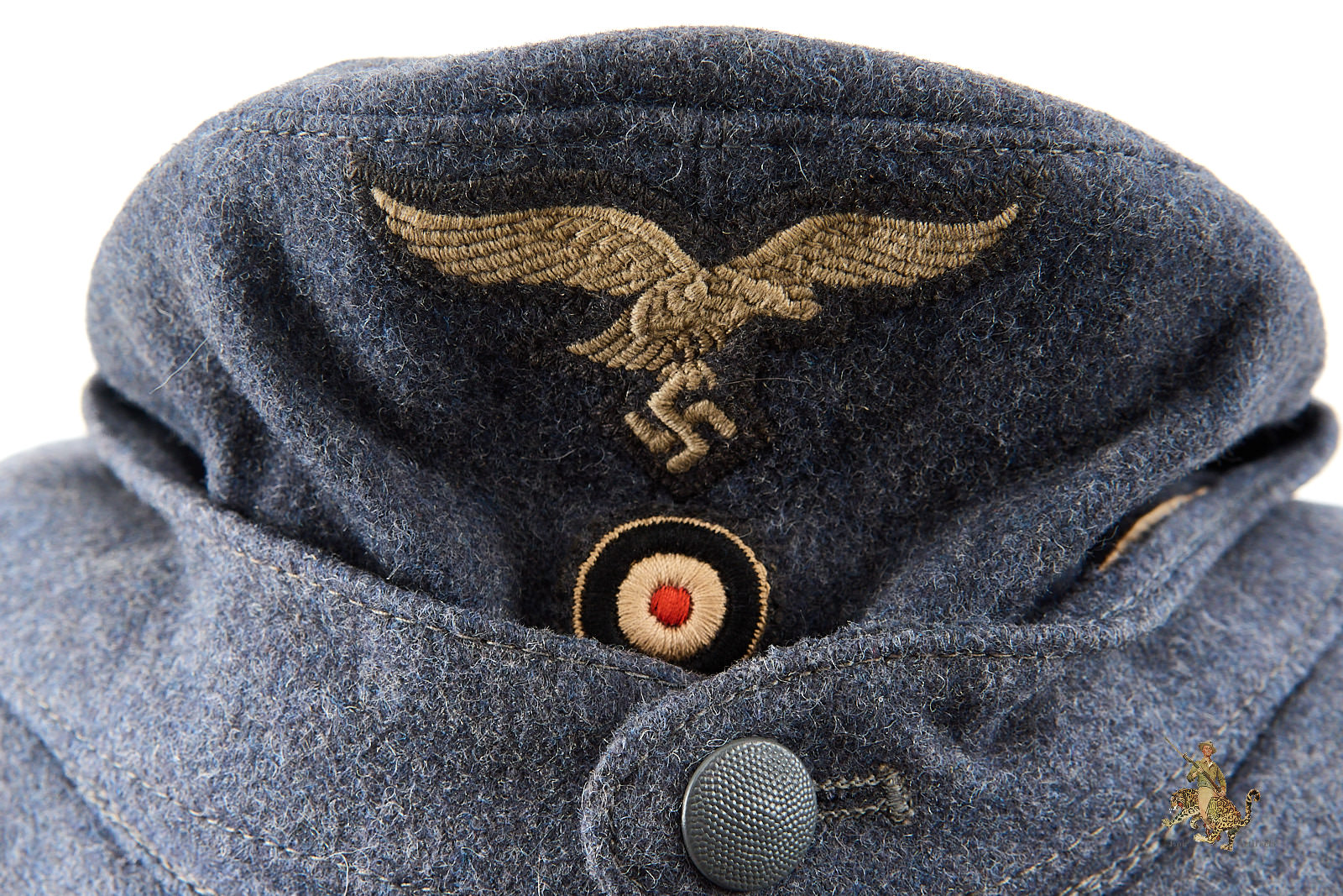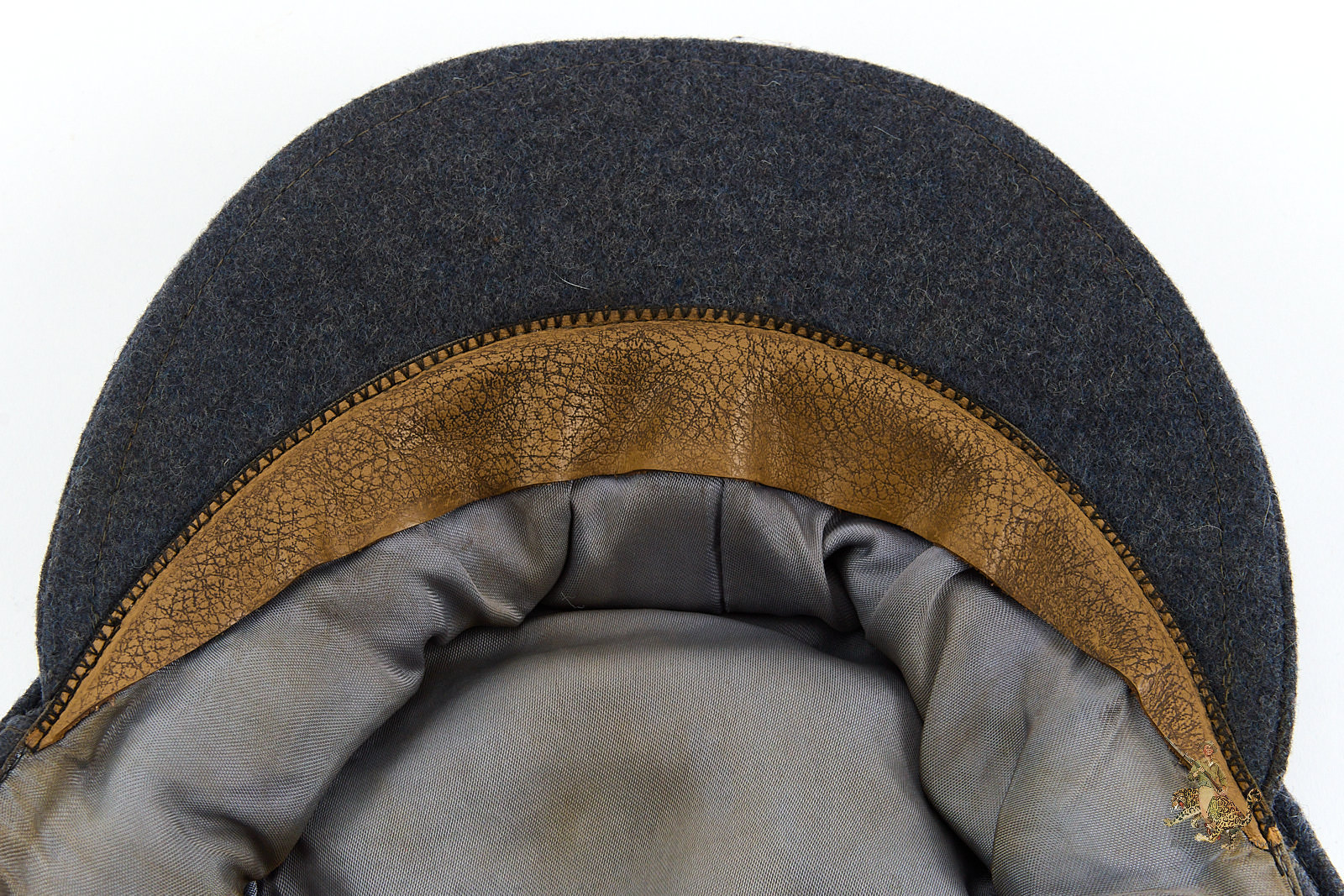 Product Description: This Luftwaffe Single Button Bergmütze M43 is a great example of a very desirable cap, with lovely character. This style of cap was worn by Luftwaffe mountain units, and features a distinctive short visor and single button flap closure that is typical for this headgear type. The exterior of this issue type cap is constructed from a typical wartime type blue-gray Luftwaffe wool. The cap shows honest soldier use and wear, with some light, typical inset dust and soiling, and some minor staining to the top of the cap. The Luftwaffe flying eagle and swastika cockade and national colors cockade are factory stitched to the cap. The turn-down flap is secured with a typical pebbled blue button. Inside, this Luftwaffe Single Button Bergmütze M43 is well marked, with the size “56,” and an RB number factory code that is tough to make out. The lining shows typical, honest wear and soiling, nicely matching the exterior. Cap shows pgraded leather front sweatband typically indicative of an officers cap.  This rare cap has a great look, that would be perfect for a combat display. The condition is excellent.