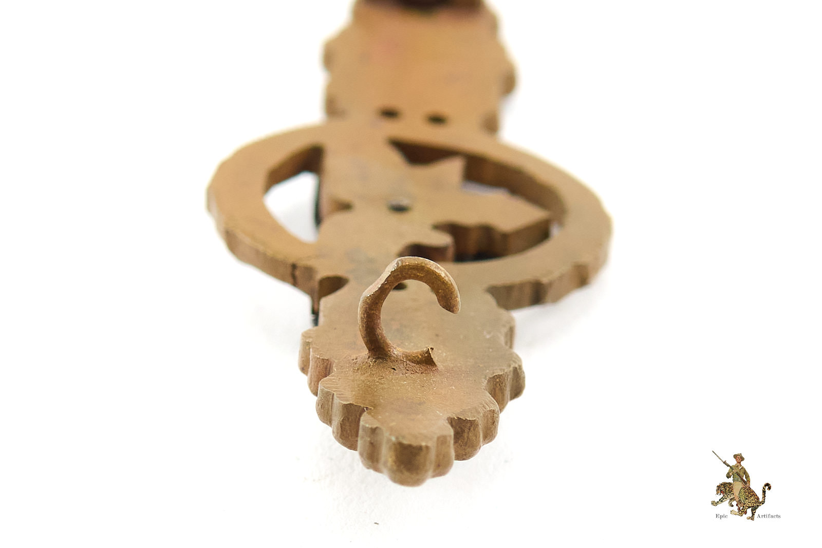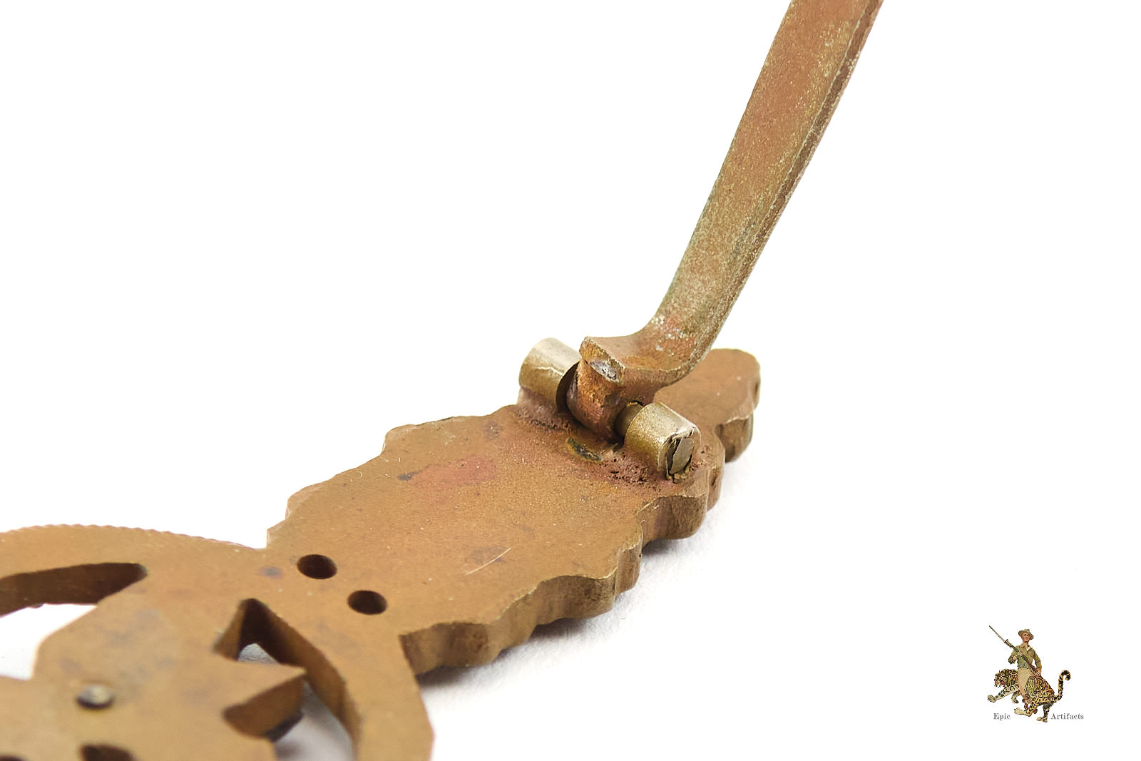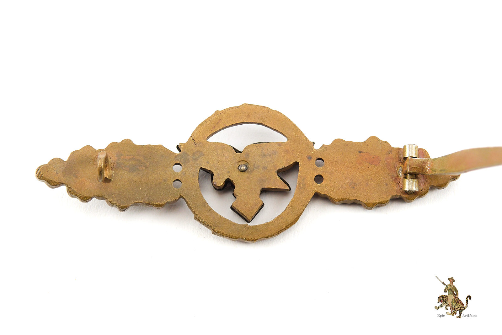 The obverse is missing the majority of the bronze finish, showing the tombak base metal underneath. The reverse displays the classic full-back construction, featuring a large central rivet, soldered-on steel roundwire catch, soldered-on steel sheet-metal hinge, and a steel pin. All hardware remains complete, secure, and fully functional, exactly as encountered on original examples.
