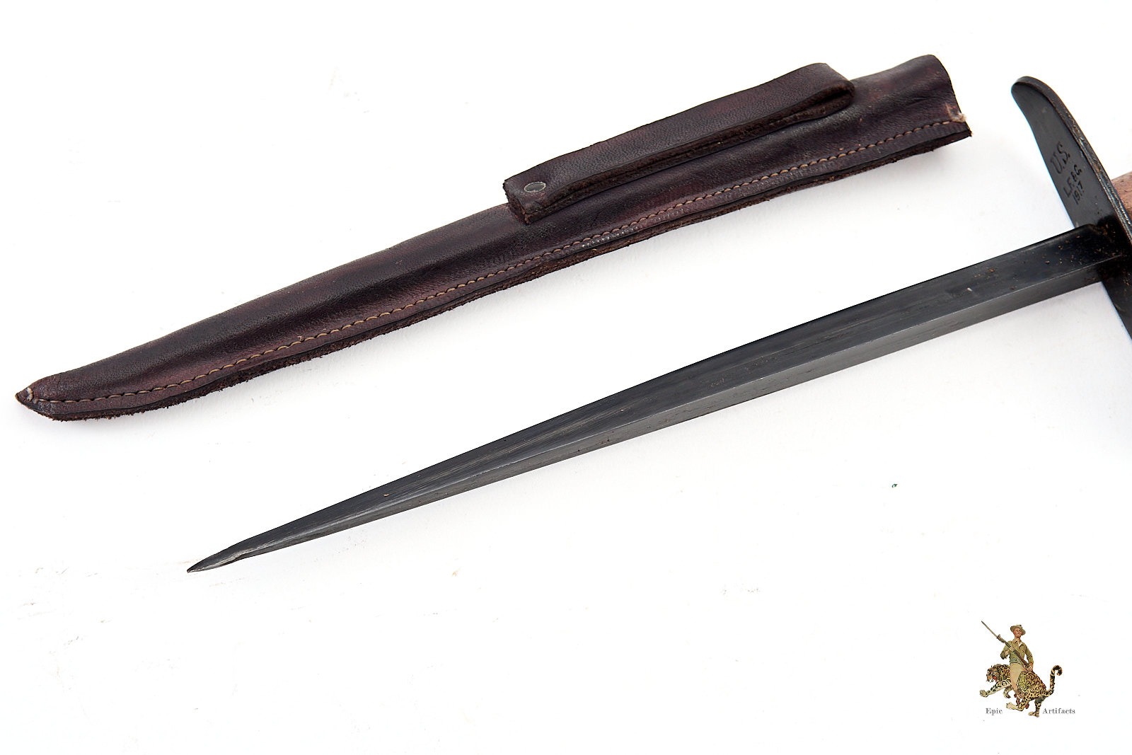 Historical Description: The first official U.S. trench knife adopted for service issue was the U.S. M1917 trench knife. It was designed by Henry Disston & Sons and based off examples of trench knives that were in service with the French Army at that time. The M1917 featured a triangular stiletto blade, wooden grip, metal knuckle guard, and a rounded pommel. The M1917 proved unsatisfactory in service, and a slightly improved version, the M1918, was adopted within months. Despite this, the M1918 is almost identical to the M1917, differing primarily in the construction and appearance of the knuckle guard. Usable only as stabbing weapons, the M1917 and M1918 frequently suffered broken blades. Their limited utility and general unpopularity caused the AEF to empanel a testing board in 1918, to test various trench knives and select a replacement.