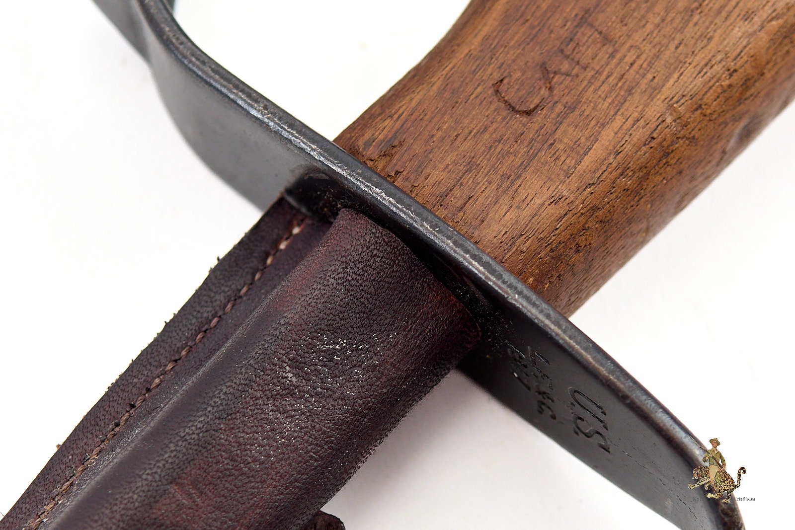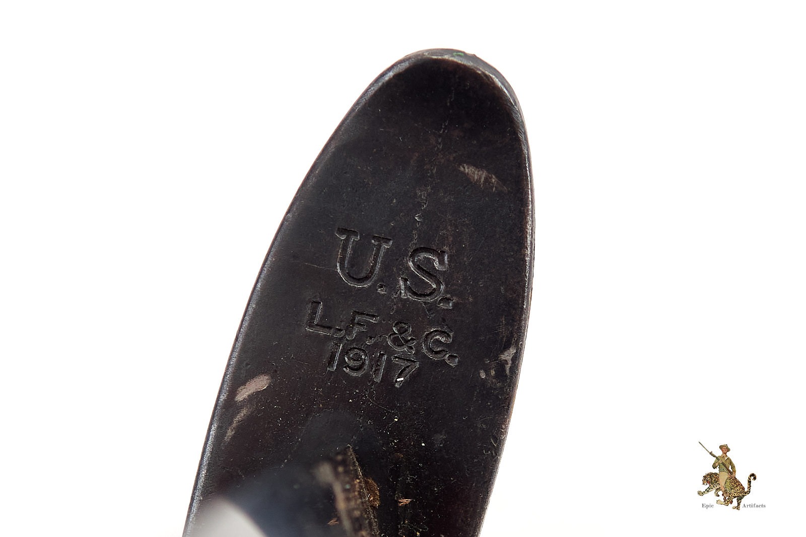 Product Description: This M1917 Trench Knife w/ Leather Sheath – LF&C is an outstanding example of the very first pattern of government issue fighting knives designed and issued to US troops. The triangular blade shows slight twist towards tip, but retains most of its original bluing. The handle shows marks consistant with hammering, and remnants of name marked “Capt D R(???) Jr” or similar and “AEF”, the last name has rubbed away and is not completely legible. The spiked hand guard retains most of its original factory applied bluing and is maker marked “LF&C,” indicating manufacture by the firm of Landers, Frary & Clark, and dated 1917. This scarce and desirable 1917 US Trench Knife is complete with a leather scabbard. Although not the original issued scabbard, this is a unique variation not often seen. The condition of this well-preserved and impressive piece rates as excellent condition.