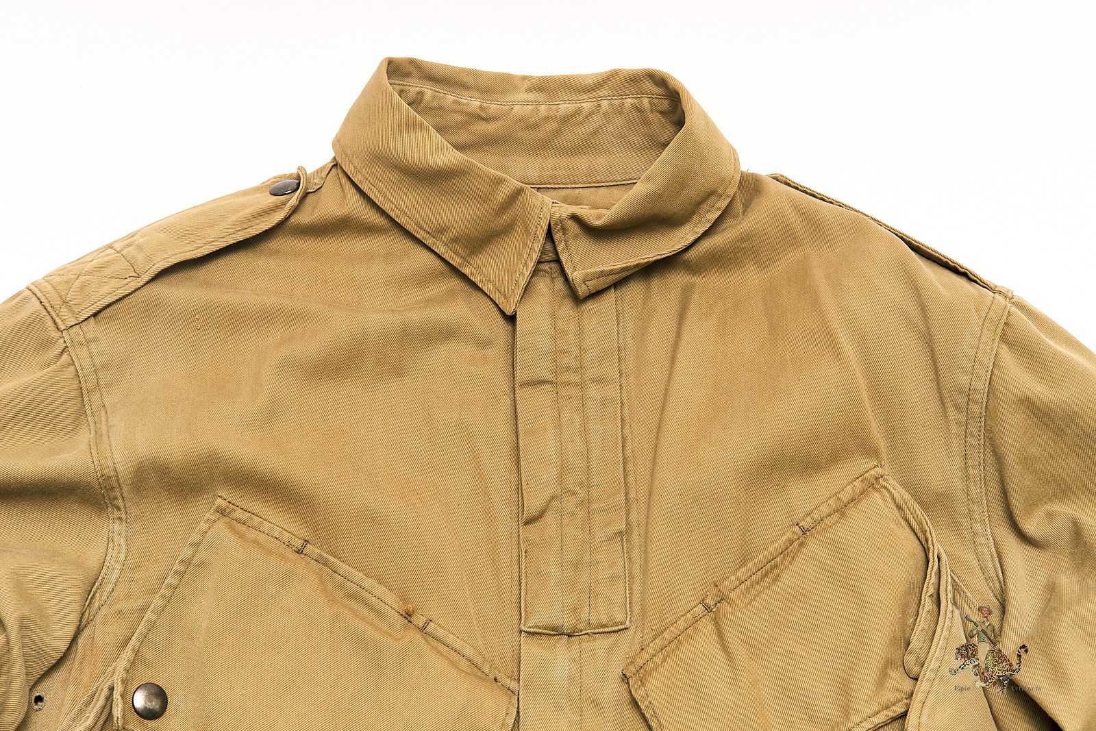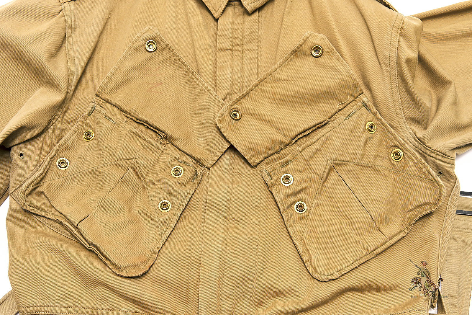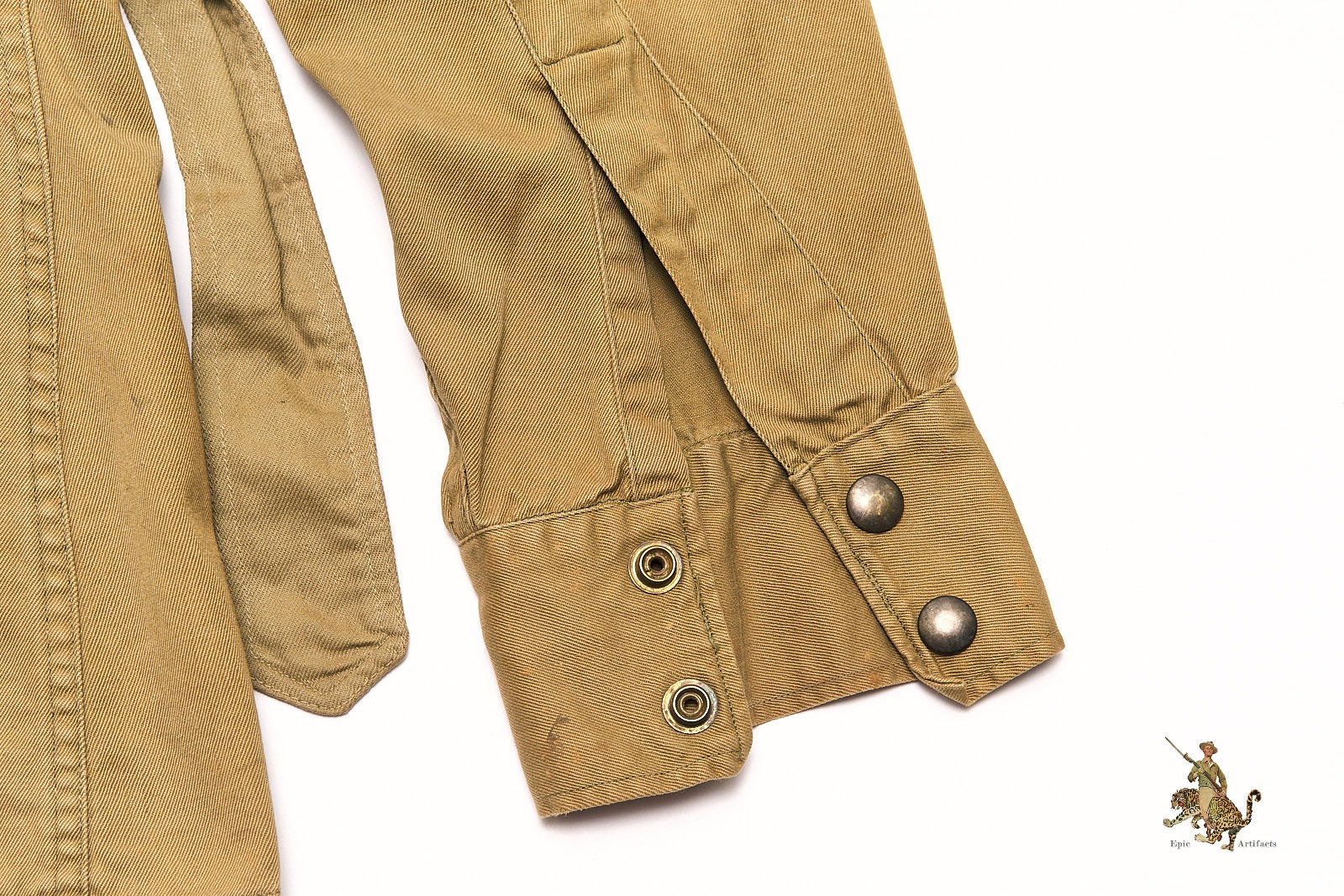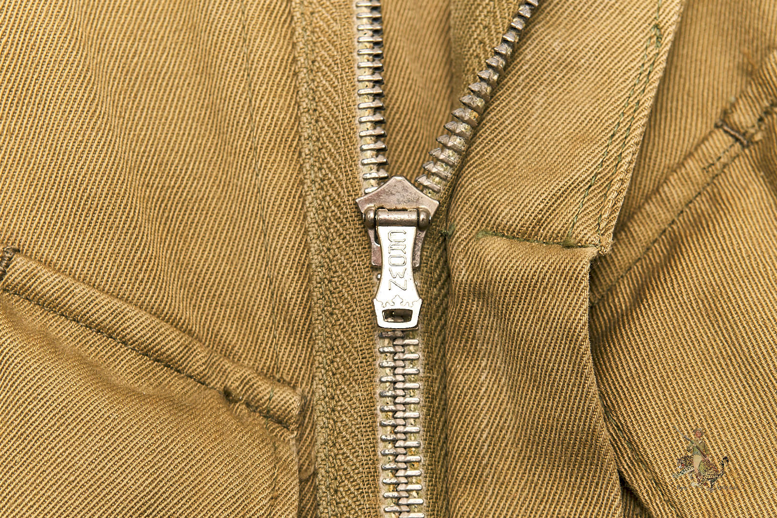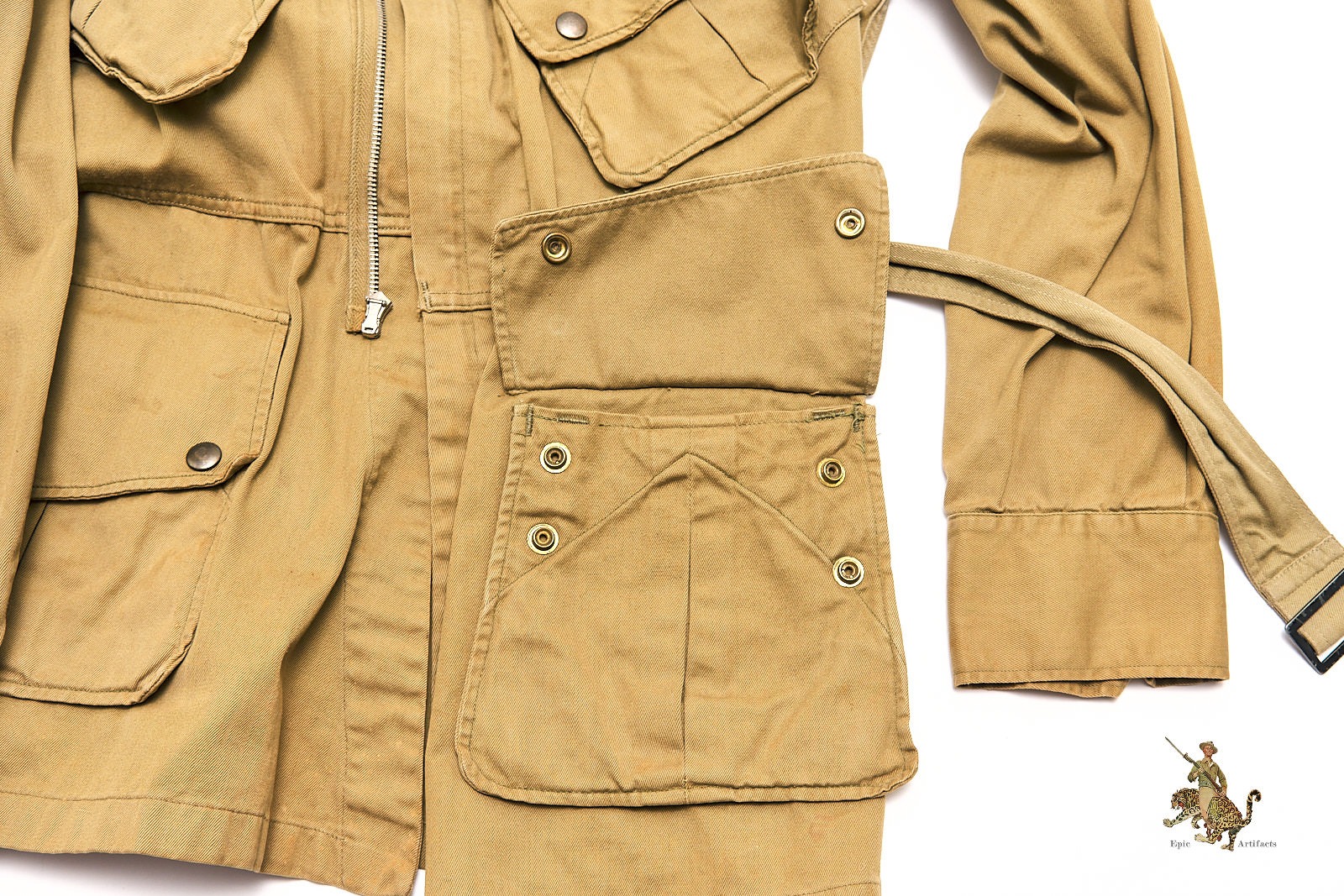 Product Description: This iconic M1942 Airborne Paratrooper Jump Jacket, was worn by U.S. paratroopers during some of the most pivotal campaigns of World War II, including D-Day and Operation Market Garden. This early-war jacket is constructed from olive drab cotton twill and features all original hardware, including its functioning Crown brand spring-back zipper and fully intact snap buttons—each operational and period correct.