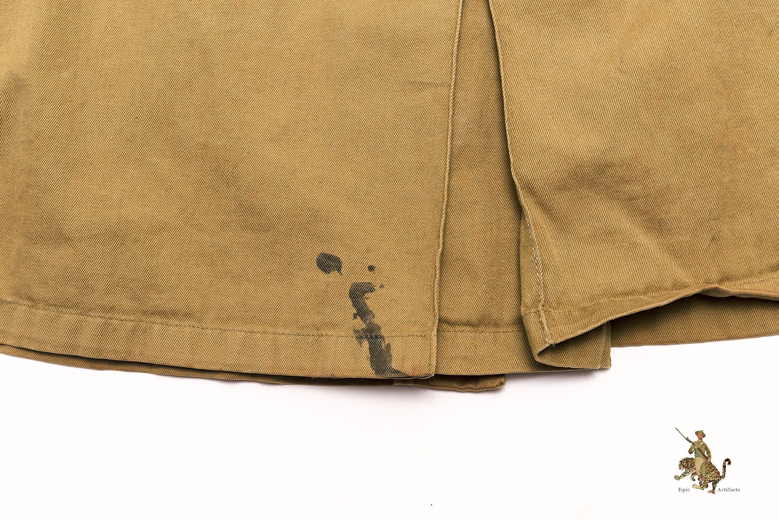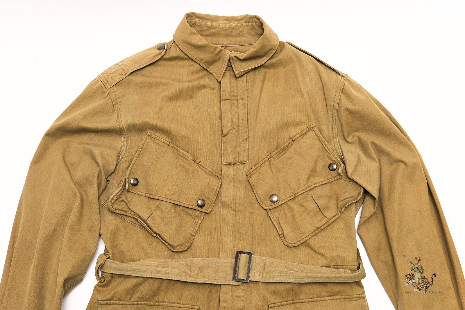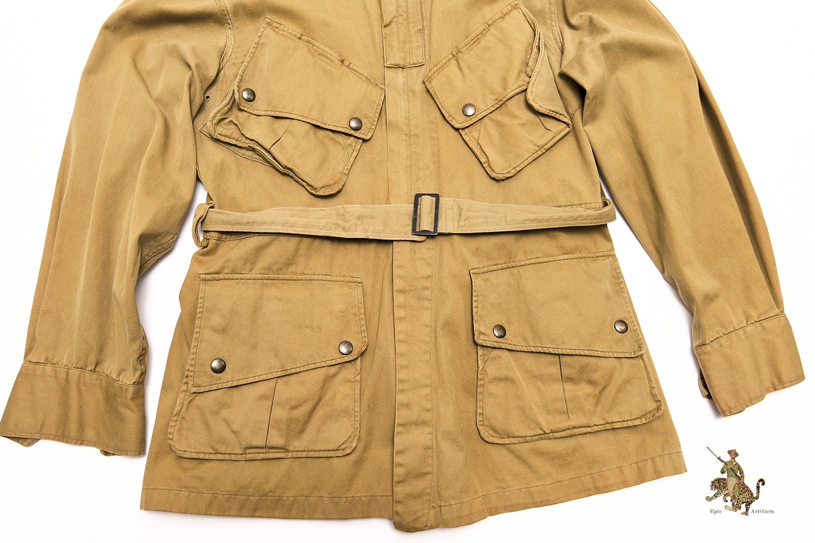 Measuring approximately 29″ from collar to tail, 22″ across the chest, and 24″ from shoulder seam to cuff, this example retains excellent overall form. It is accompanied by its original matching belt, a key component often missing from surviving examples. The jacket shows minor spotting, small pinholes, and light wear consistent with age, yet remains structurally sound with strong presentation. No internal tags or markings are present, suggesting possible field issue or laundering. A quintessential piece of U.S. Airborne combat uniform history, seldom found in such well-preserved and complete condition.