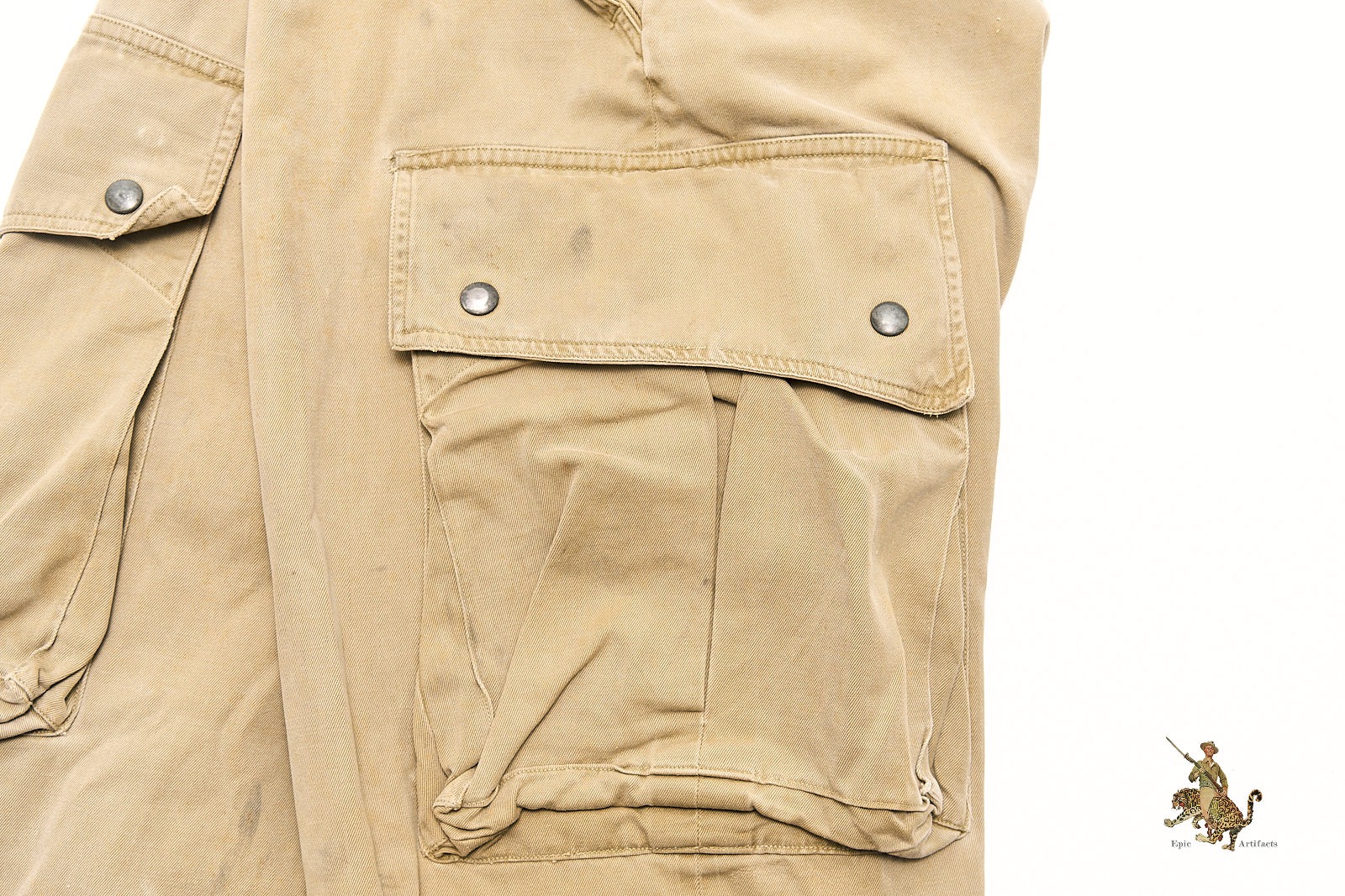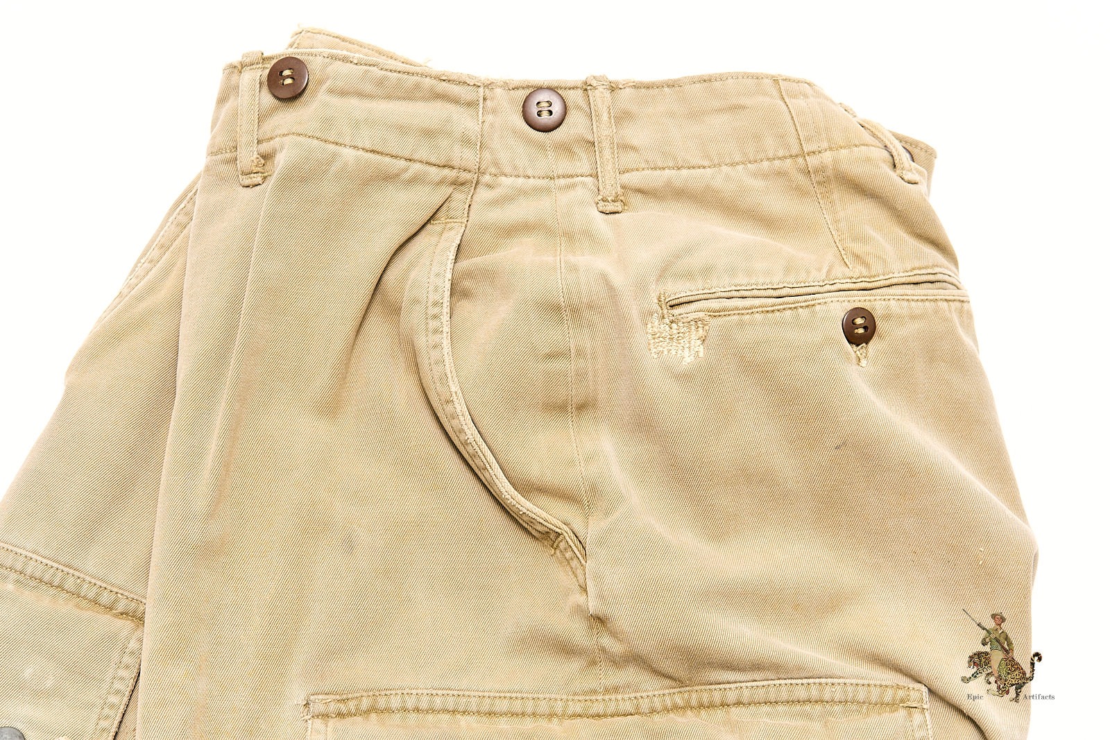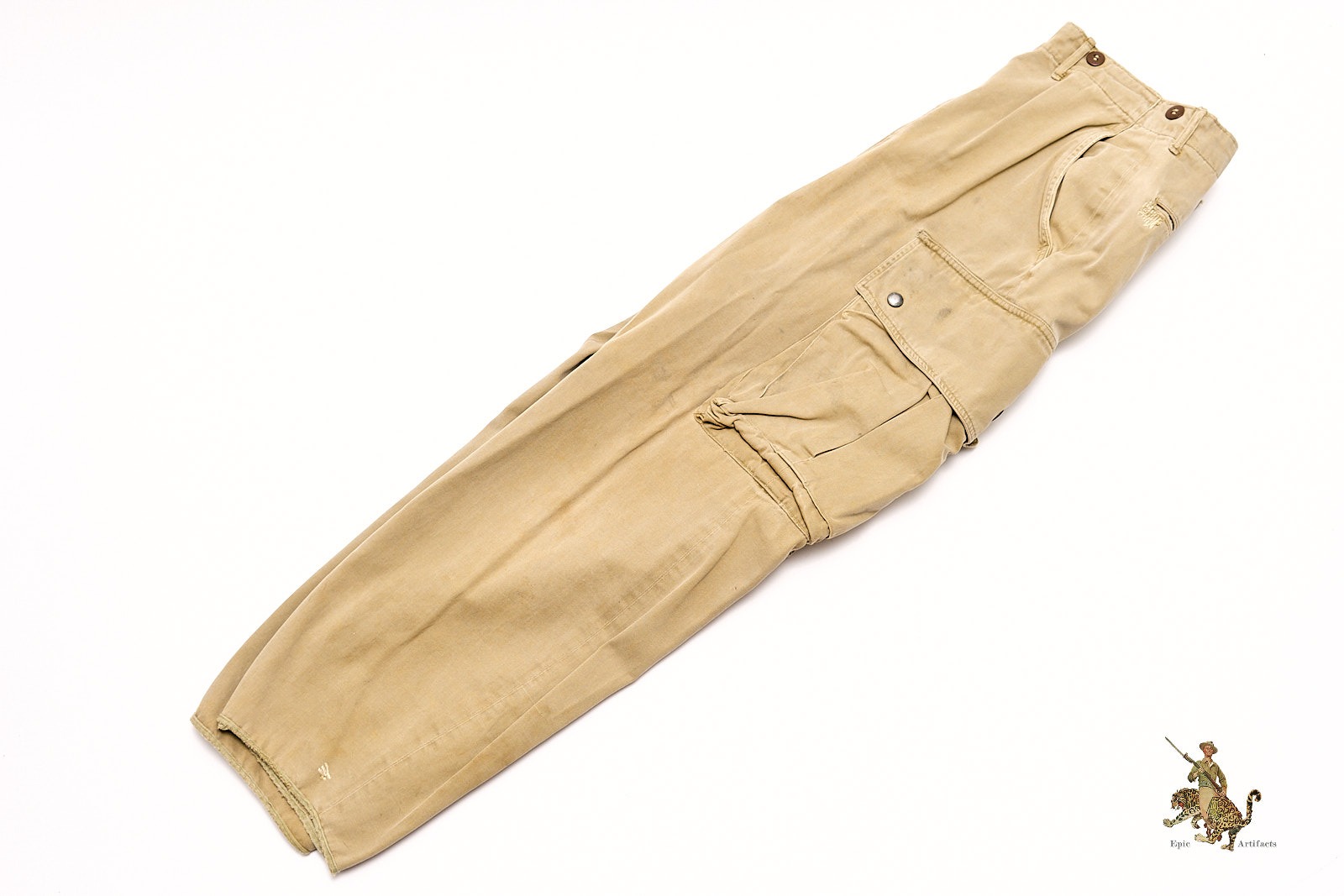 All buttons are present and appear original, including those at the fly and pocket flaps. Interior size markings remain legible along the waistline. The tag in the right pocket has faded with time, though its stitching remains intact. Light spotting and wear are evident throughout, with slightly darker discoloration at the lower left leg, consistent with field use. This is the standard-issue, non-reinforced version of the M1942 trousers—highly sought after for its early-war association with operations such as Sicily, Normandy, and Market Garden. A fine and authentic piece of U.S. Airborne combat uniform history.